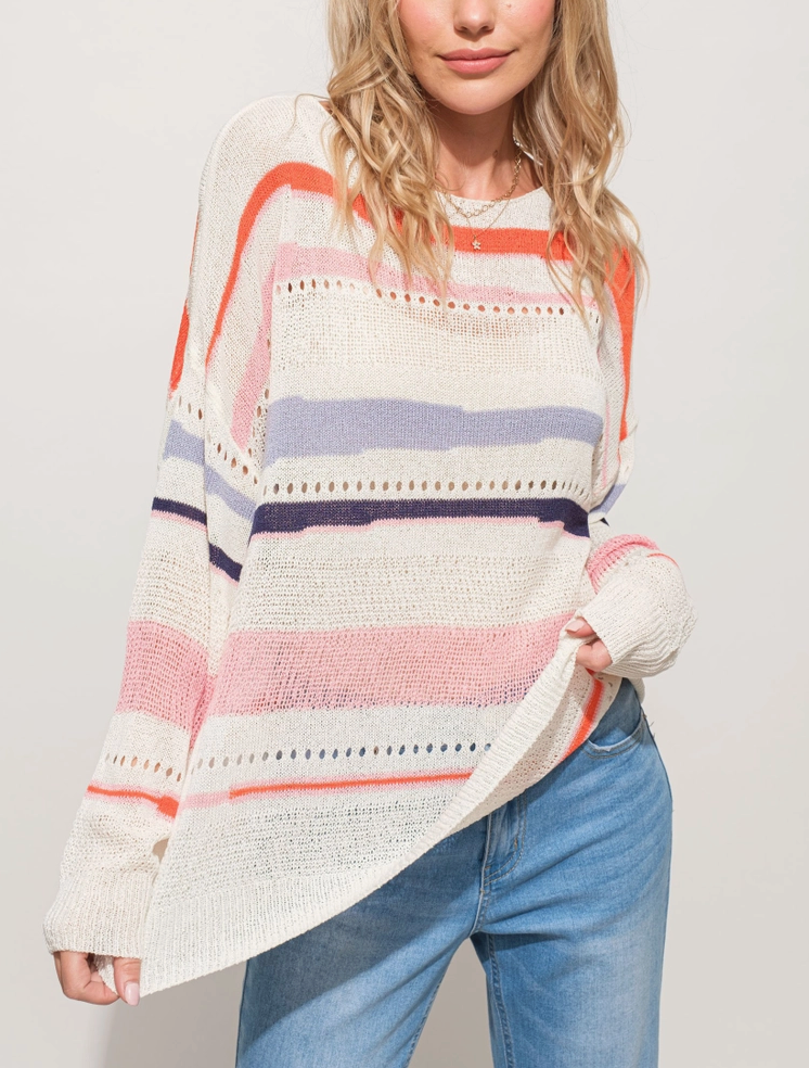 This abstract striped loose fit sweater is SO cute! It features the prettiest woven fabric with colors of ivory, light pink, coral, periwinkle and deep purple. Easy to wear on its own with a tank underneath or throw over a swimsuit!