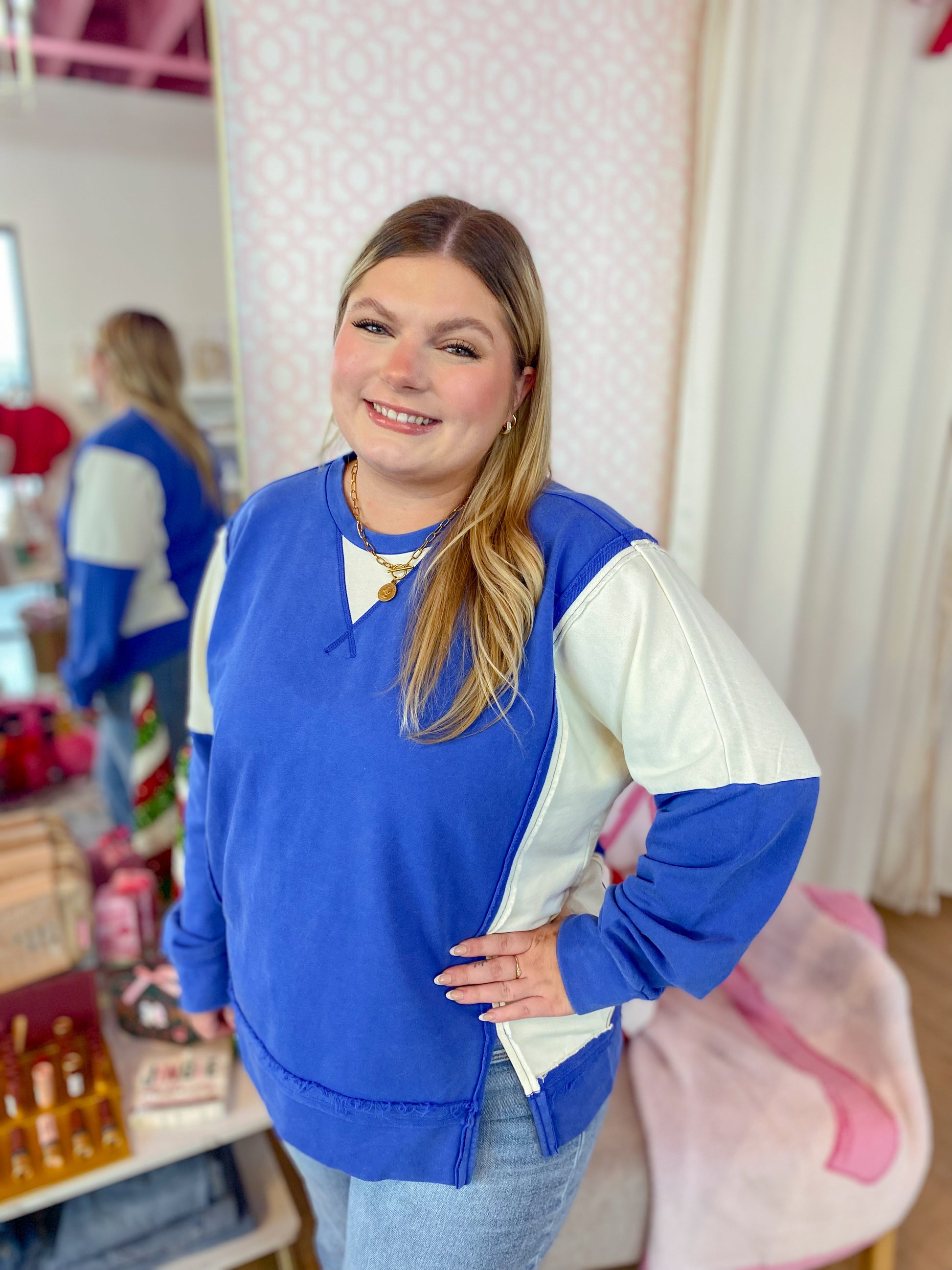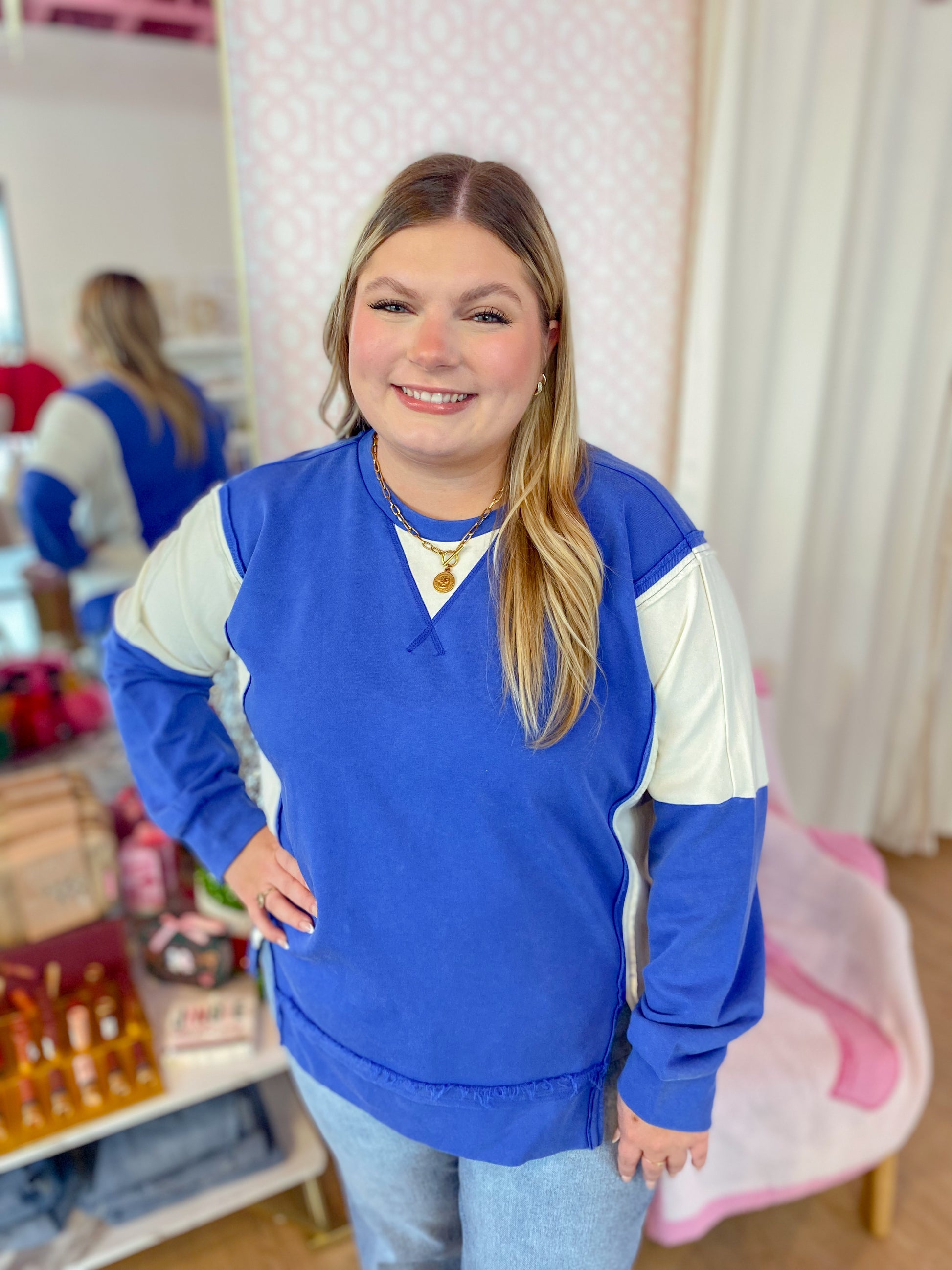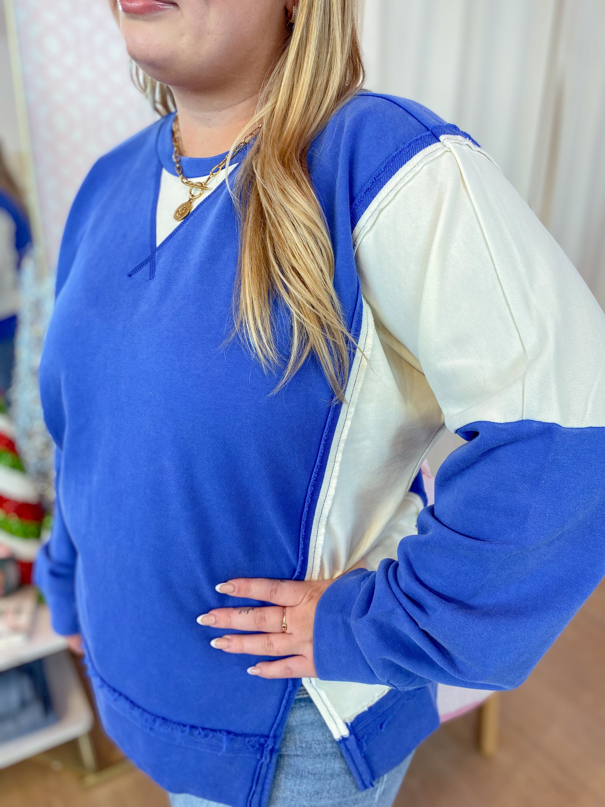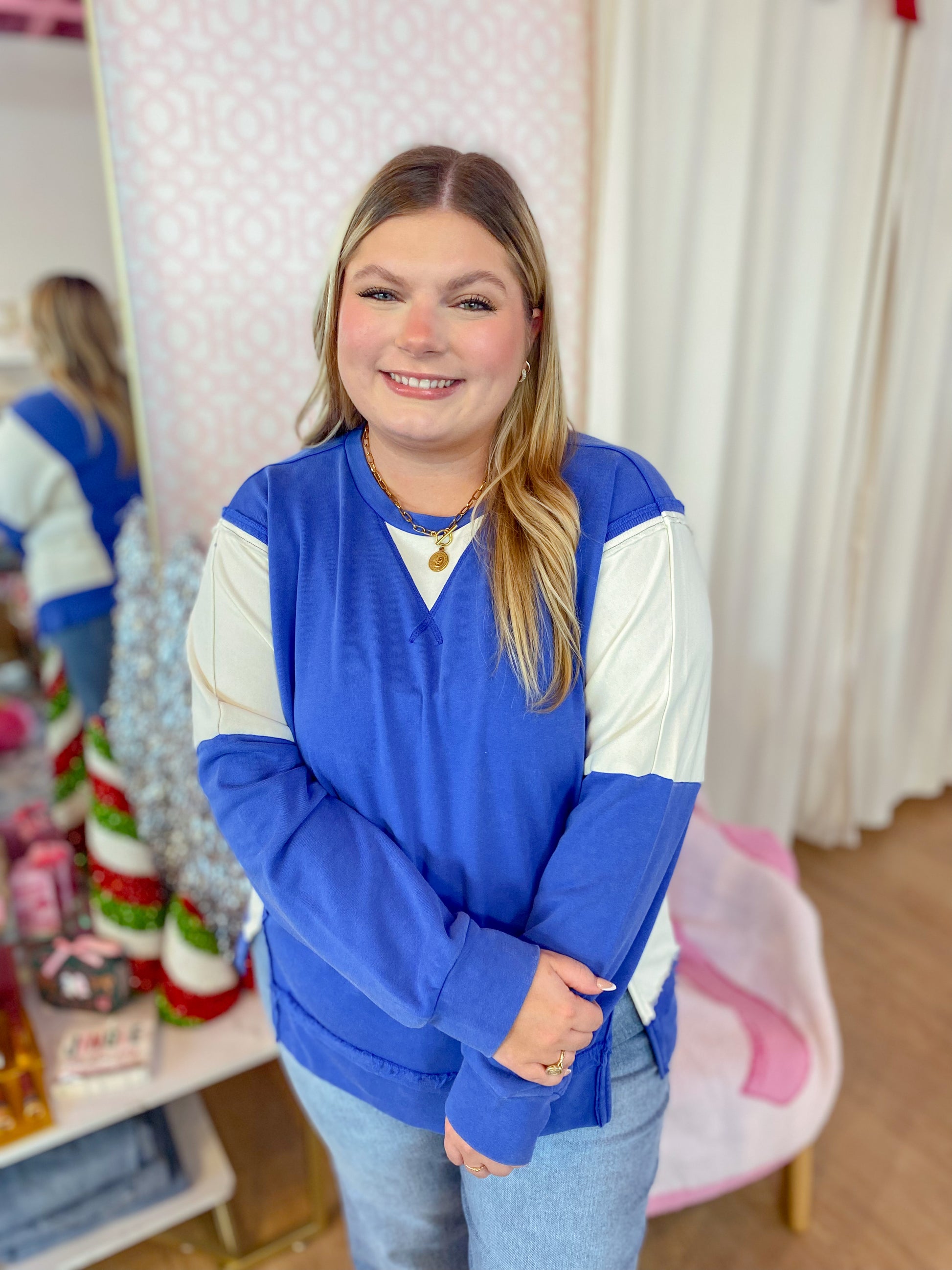 Get game day ready with the All You Need top! This royal blue long-sleeve features bold color blocking, a fun raw cut detail, and a flirty v-notched neckline. The slit hem adds just the right amount of edge while keeping you comfy and cool. Perfect for cheering on your team in style!