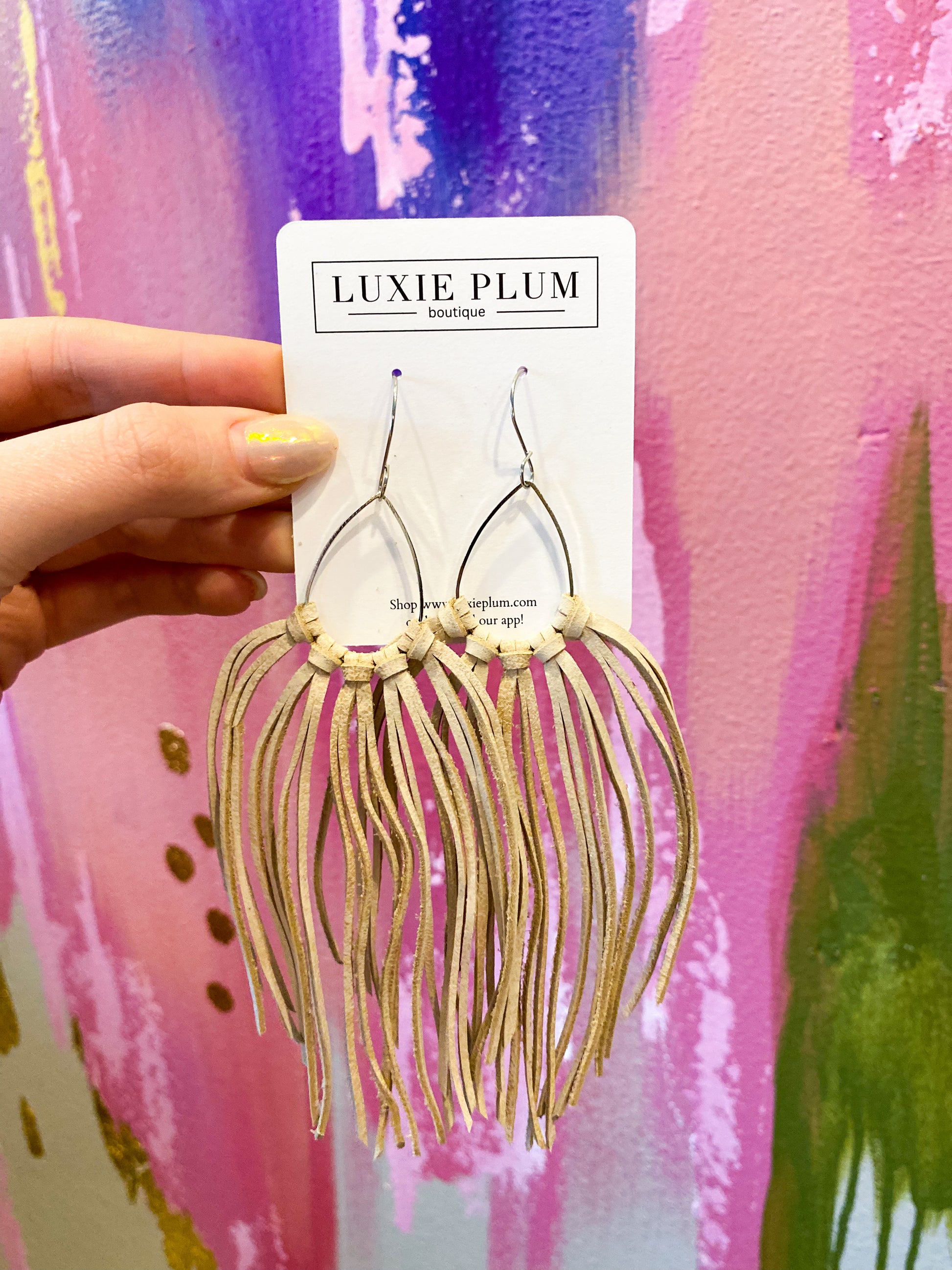 These beige fringe earrings will match all of your Rodeo/Country Concert gear! The feature a silver tear drop style with long beige fringe! Super neutral and so fun!