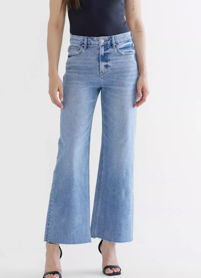 Avery Mica Denim features super high-rise, wide-leg jeans in a bright jack blue. They mix retro style with comfort, making your legs look longer and your outfit fun and fresh!