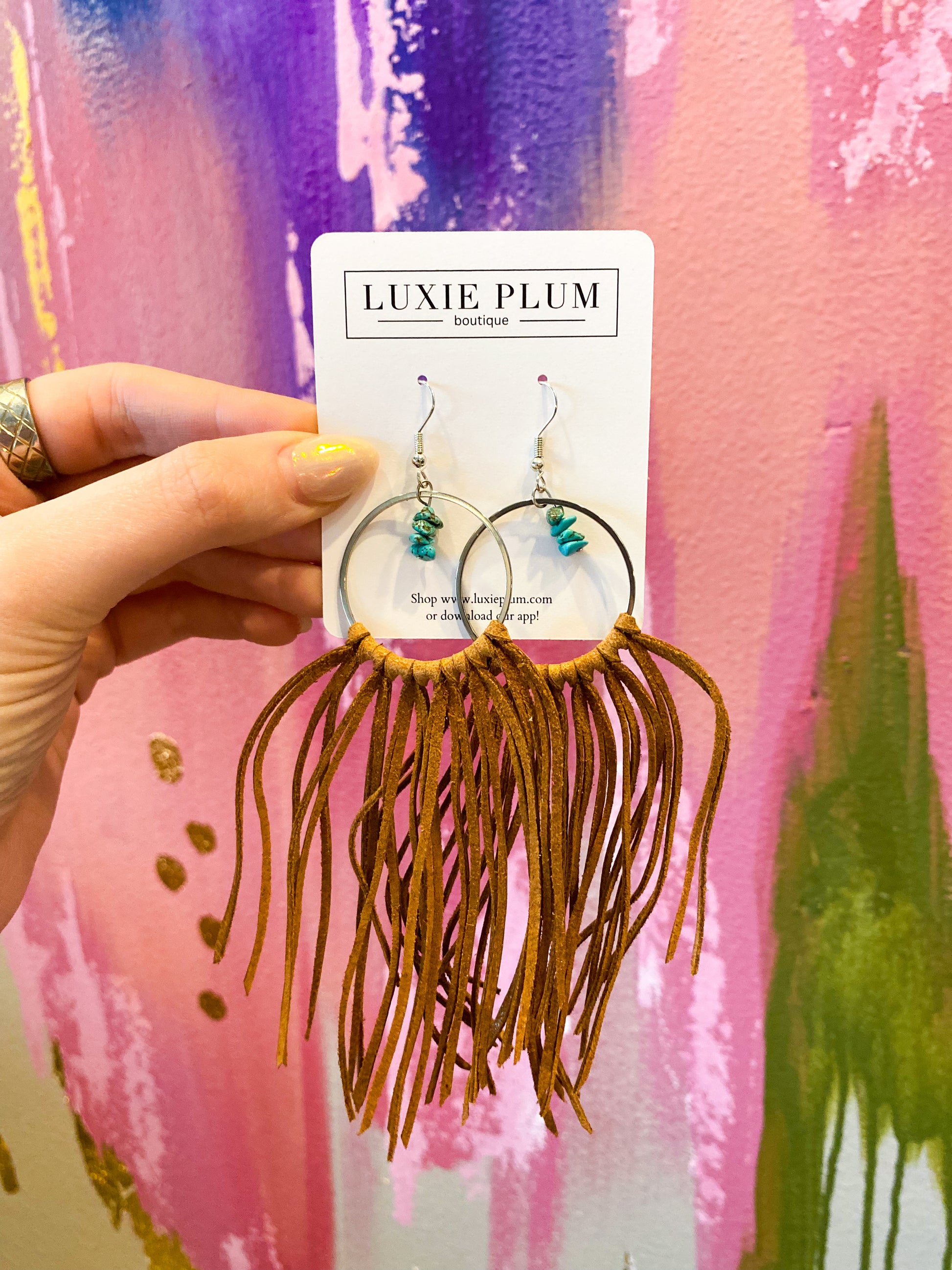 These earrings are so fun and perfect for Rodeo/any country concert you have coming up! They feature a silver hoop drop with a turquoise charm hanging from the center and long fringe tassels! We have two colors: White and Camel!