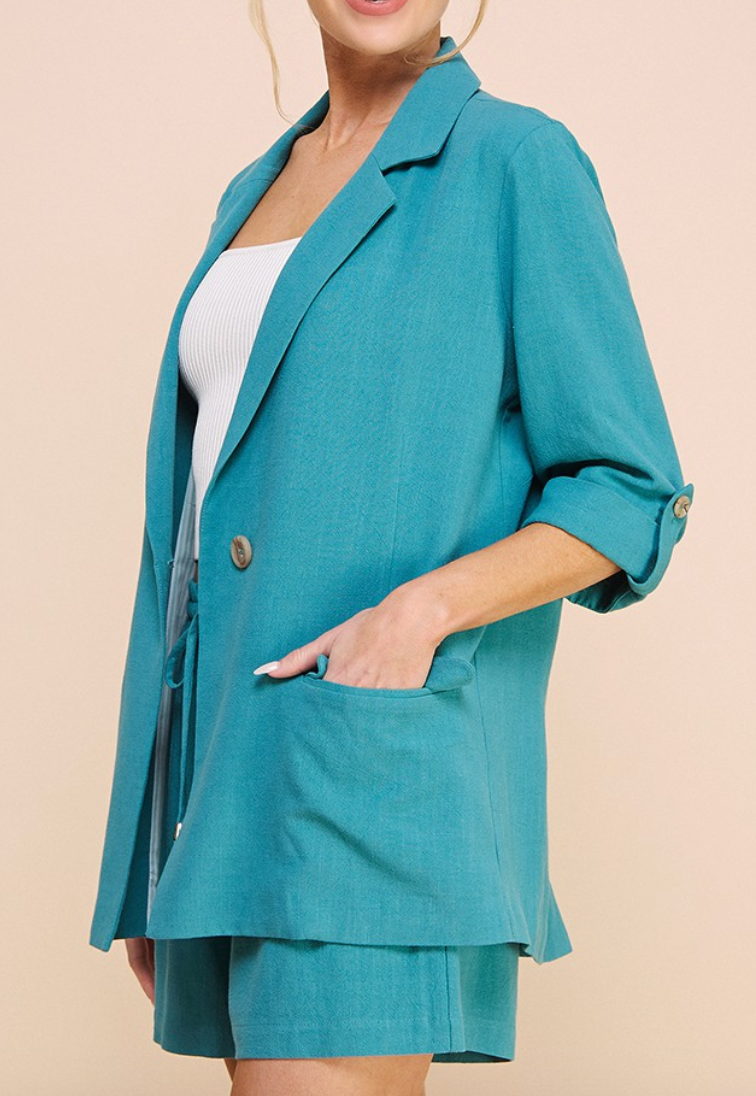 This linen set is everything you need to feel like a boss babe this Spring/Summer! The blazer features a soft linen material with 3/4 roll tab sleeves, a button closure above the waist and faux pockets. The shorts feature the same soft linen fabric with an elastic waistband, a functioning tie at the waist and pockets on both sides! Pair with a white tee or tank underneath and your favorite sandals/wedges!