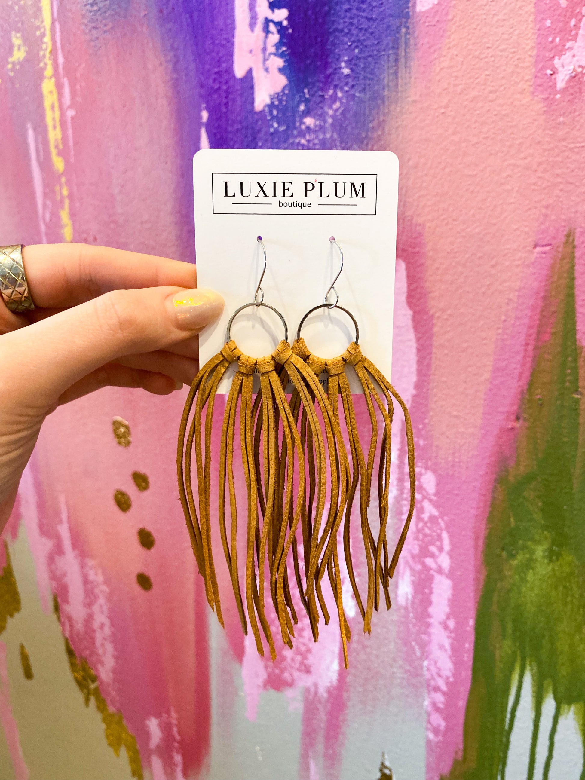 These Camel fringe earrings are to die for! They feature a silver circle drop with camel colored fringe tassels! Super cute and perfect for your country concerts/Rodeo!