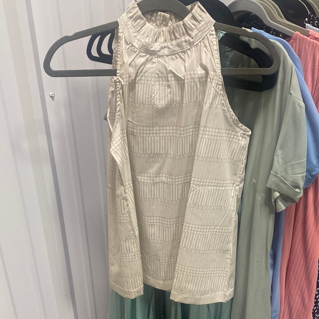 This top is so cute! It features a high neck with no sleeves. It has ruffles on the neckline and has the cutest light grey print. Pair this with any denim/shorts this summer!