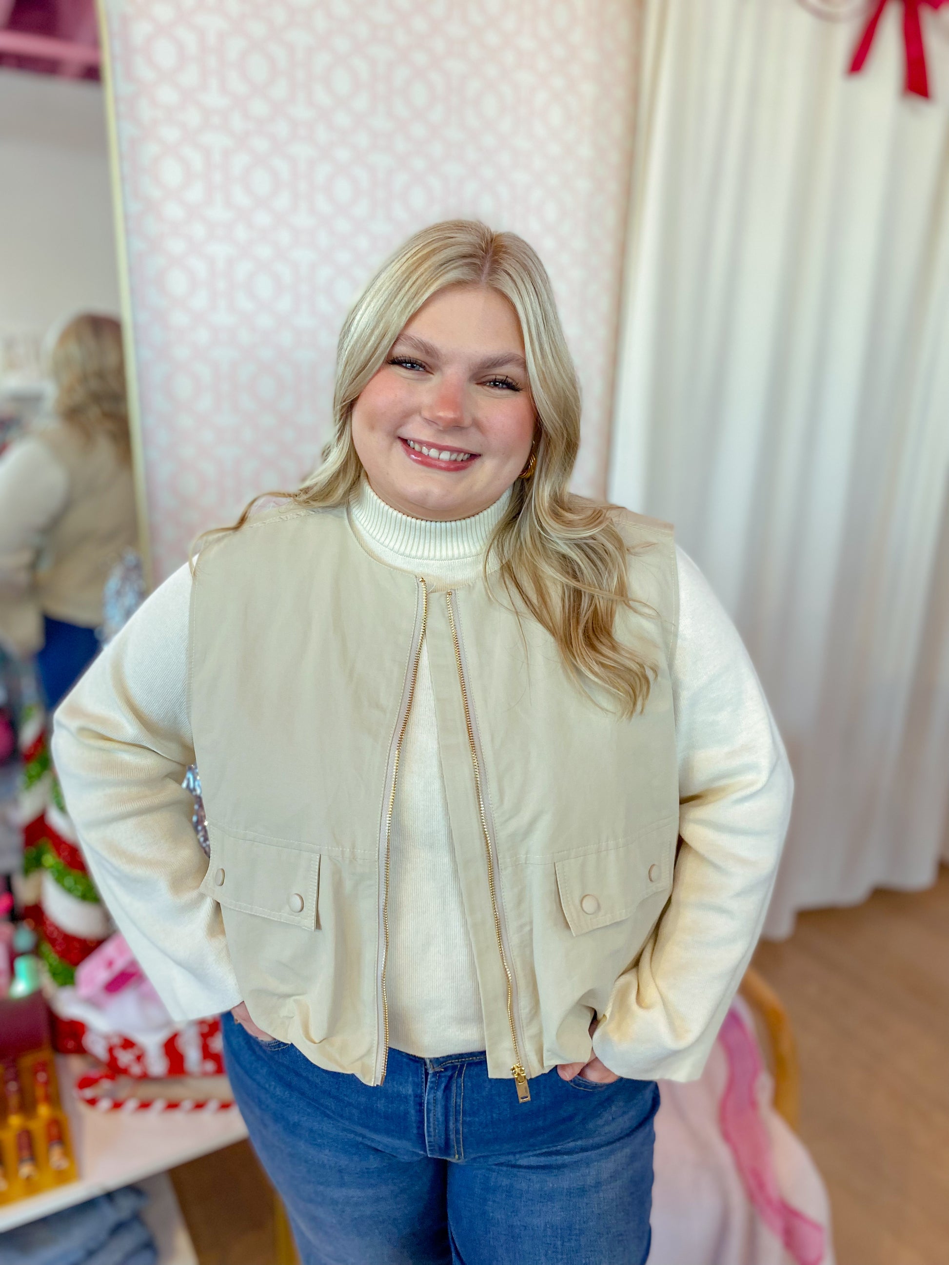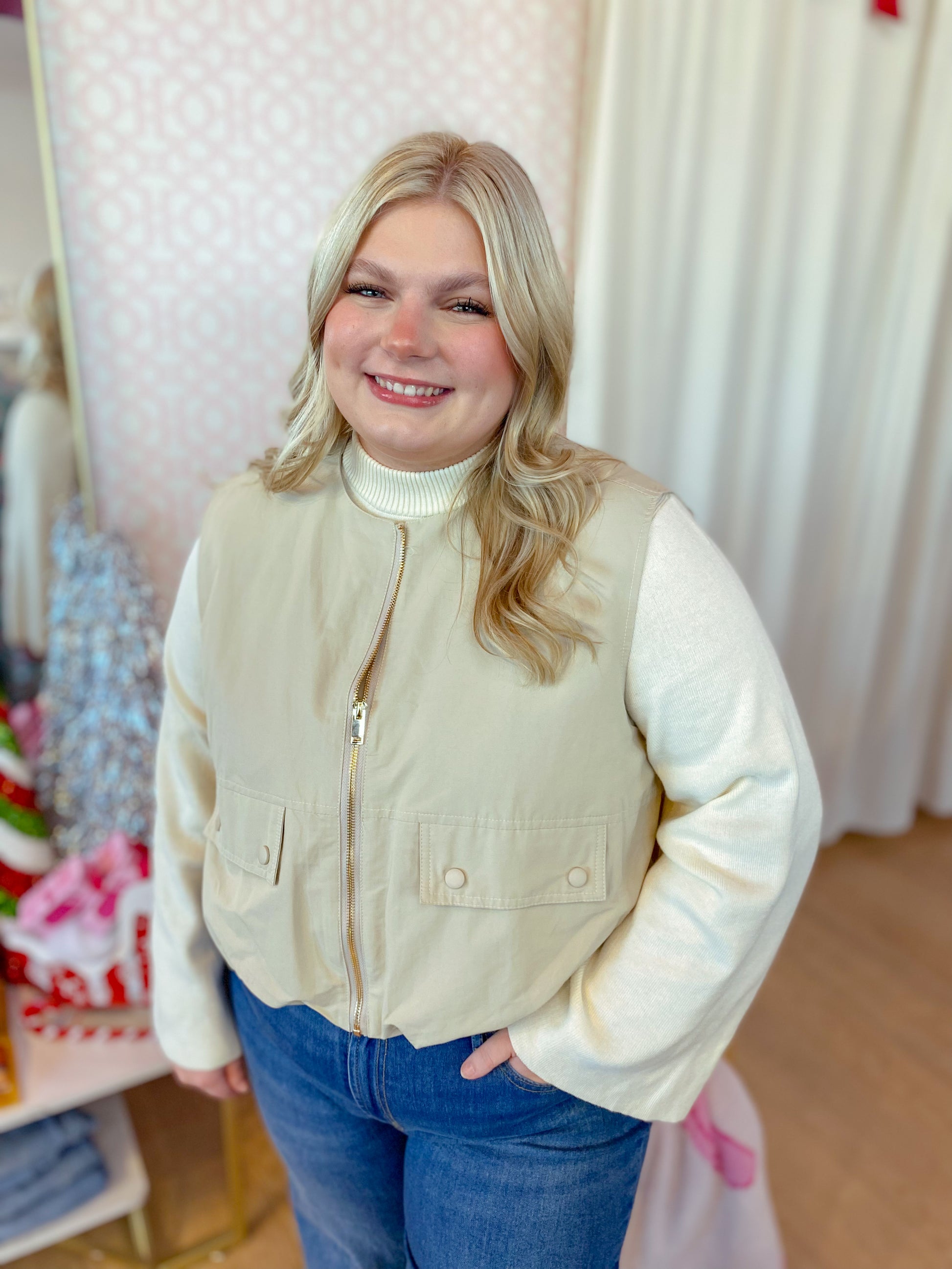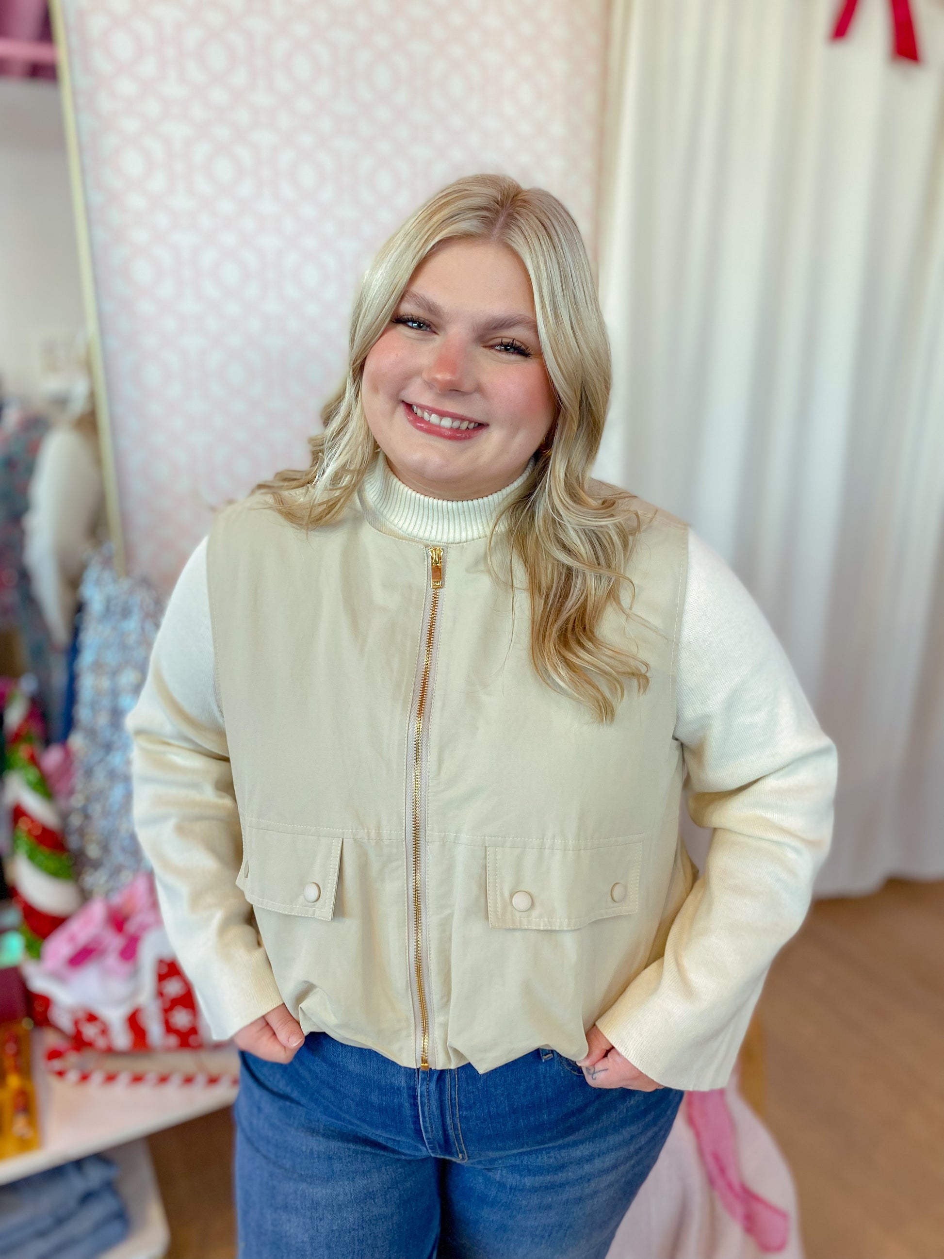 Stay cozy and cool in this cream solid sleeveless zip-up vest, designed with flap pockets and snap closures for all your essentials. The back loop detail and inverted pleat add a fun twist of volume and flair, making it perfect for layering your playful looks!