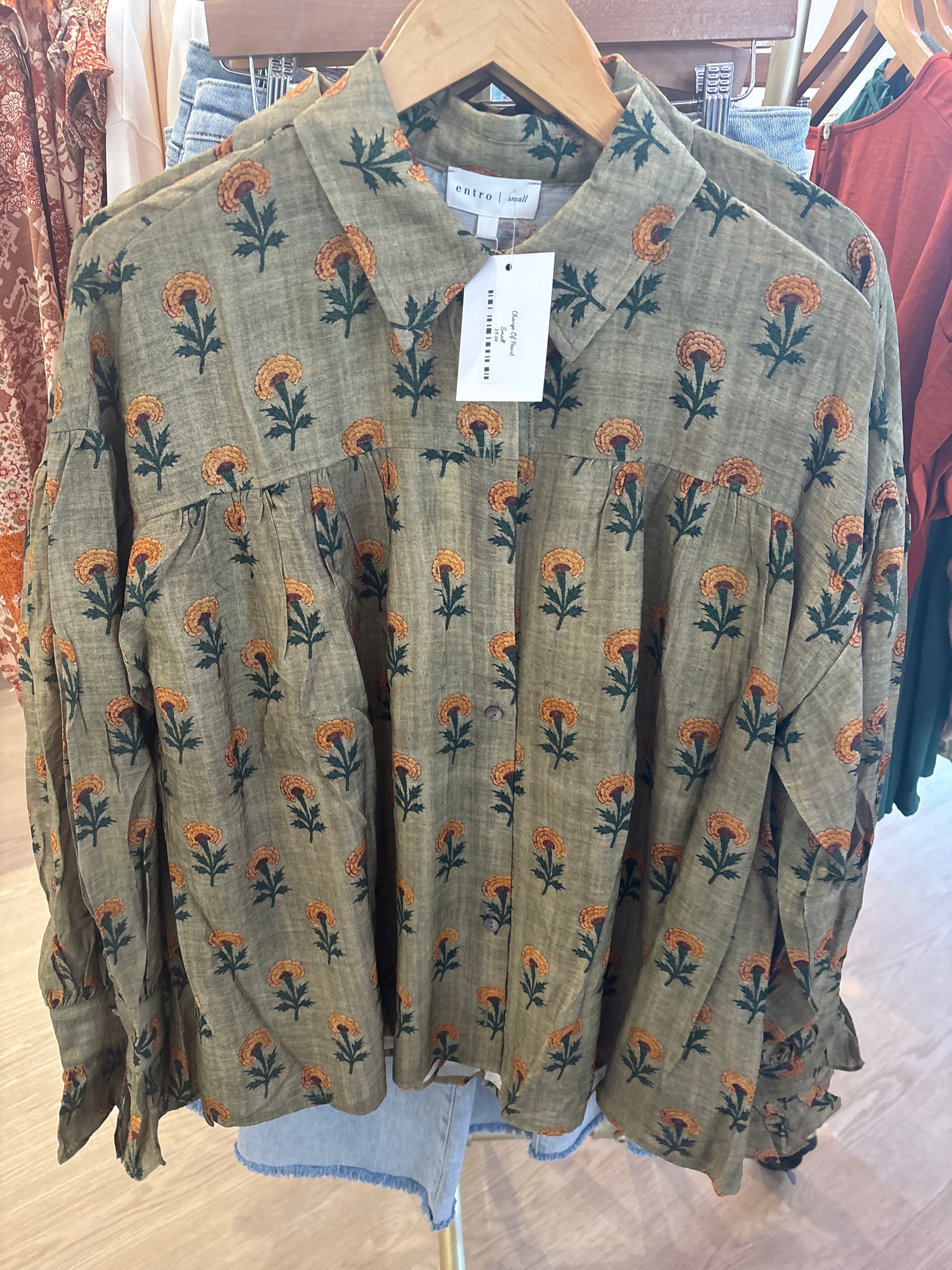 Bring a fresh twist to your wardrobe with the Change Of Heart top. This olive floral print button-down delights with a spread collar and playful ruffle cuffs finished with charming button details. Perfect for adding a flirty touch to your look while keeping things effortlessly stylish!