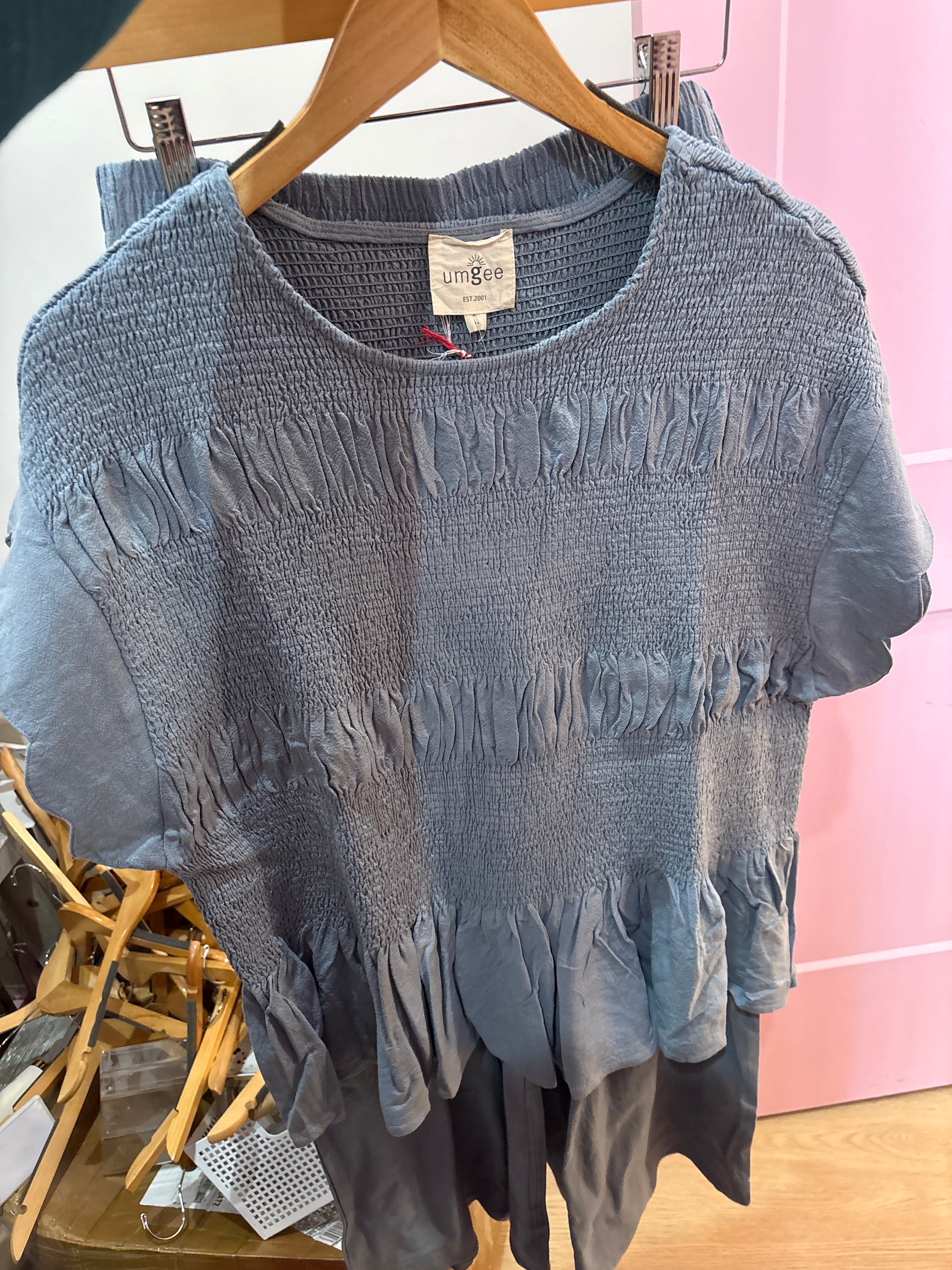 Escape into effortless elegance with the Darling Daydream Set. This charming steel blue linen blend ensemble features a smocked peplum blouse with a sweet round neckline and delicate scallop-edge short sleeves that add a touch of whimsy. The ruffled peplum hem creates a playful silhouette that pairs perfectly with the matching flowy pants. Unlined for breathable comfort! This set is your go-to for days when you want to look put-together without trying too hard!