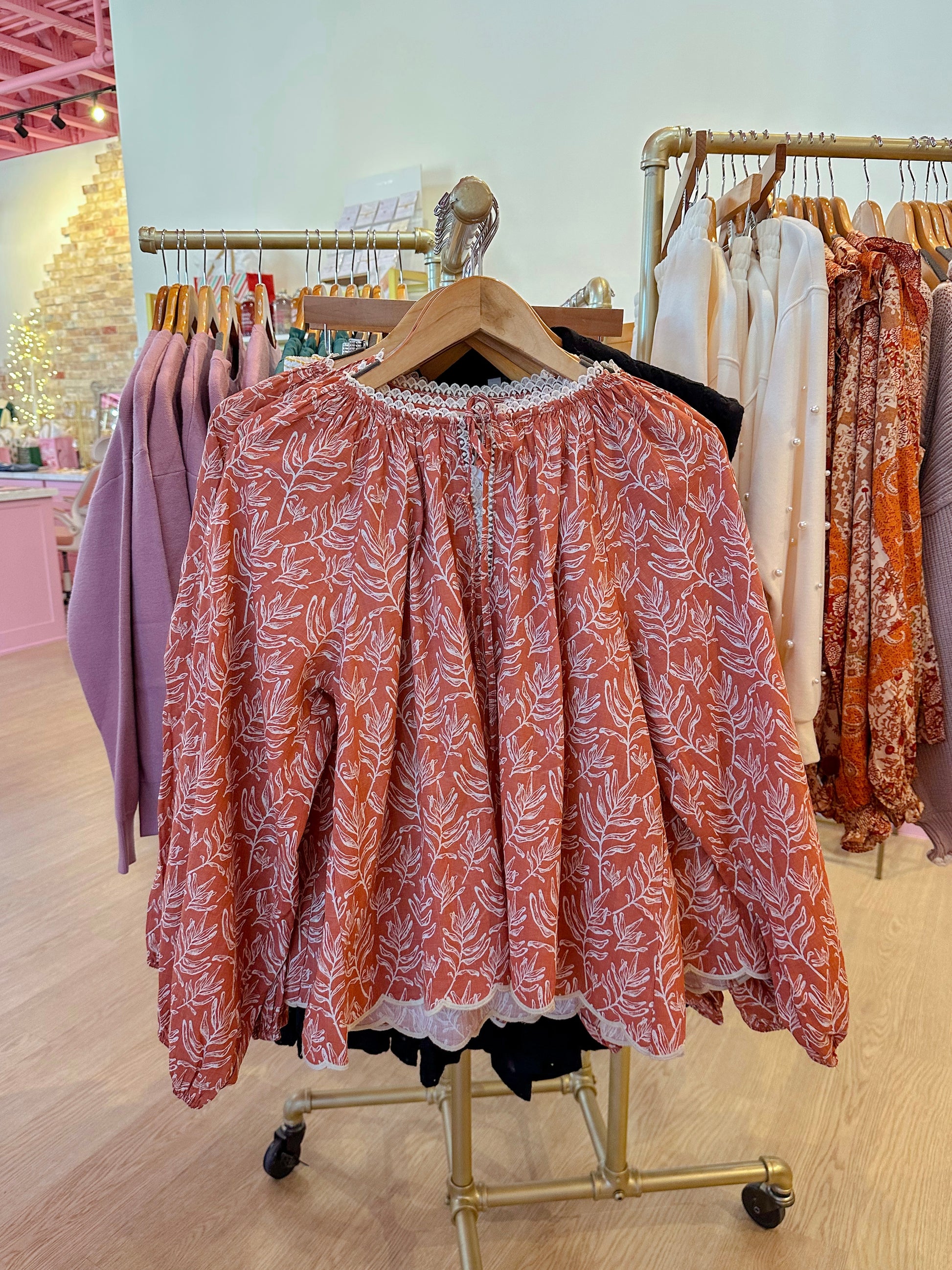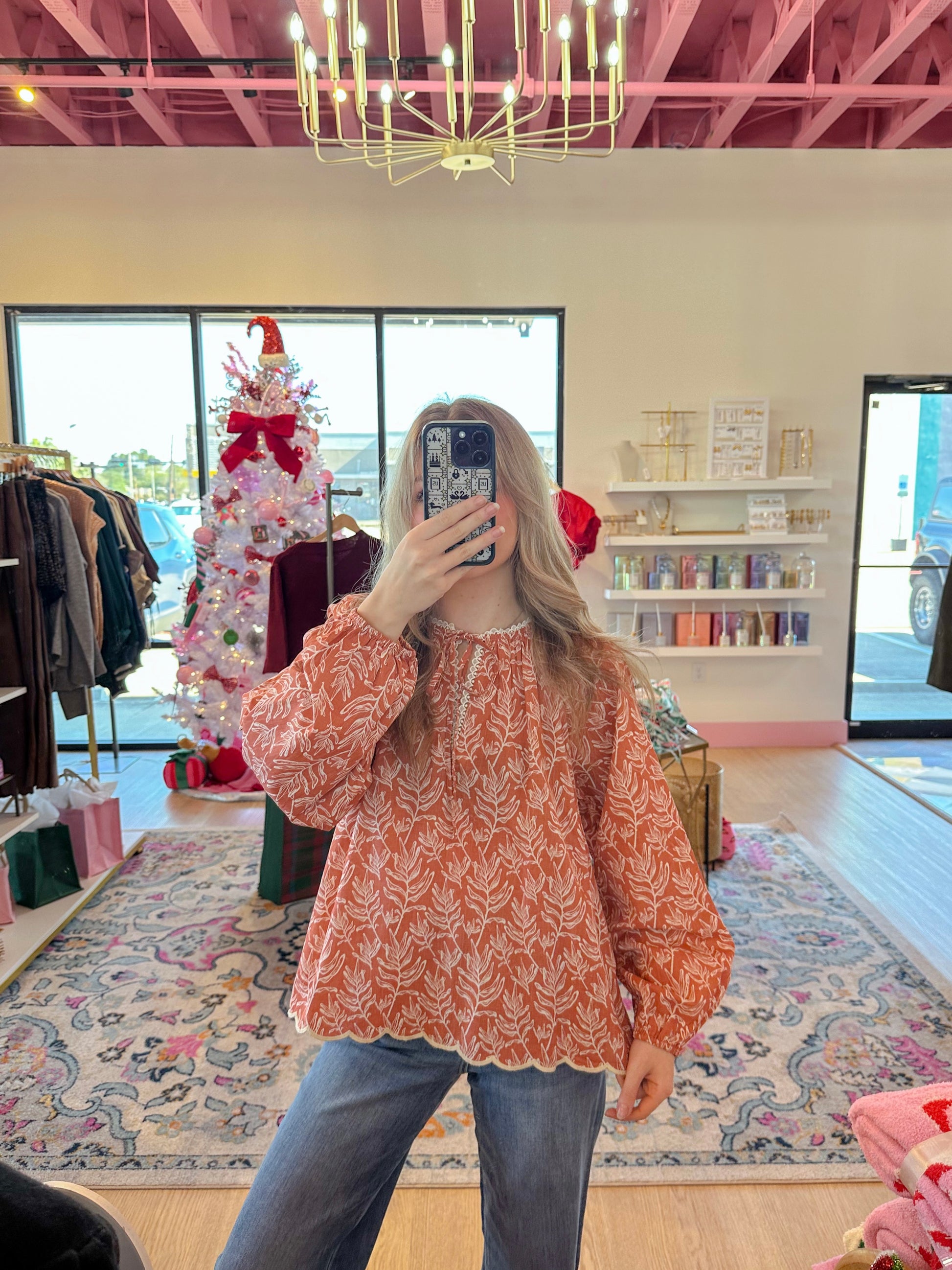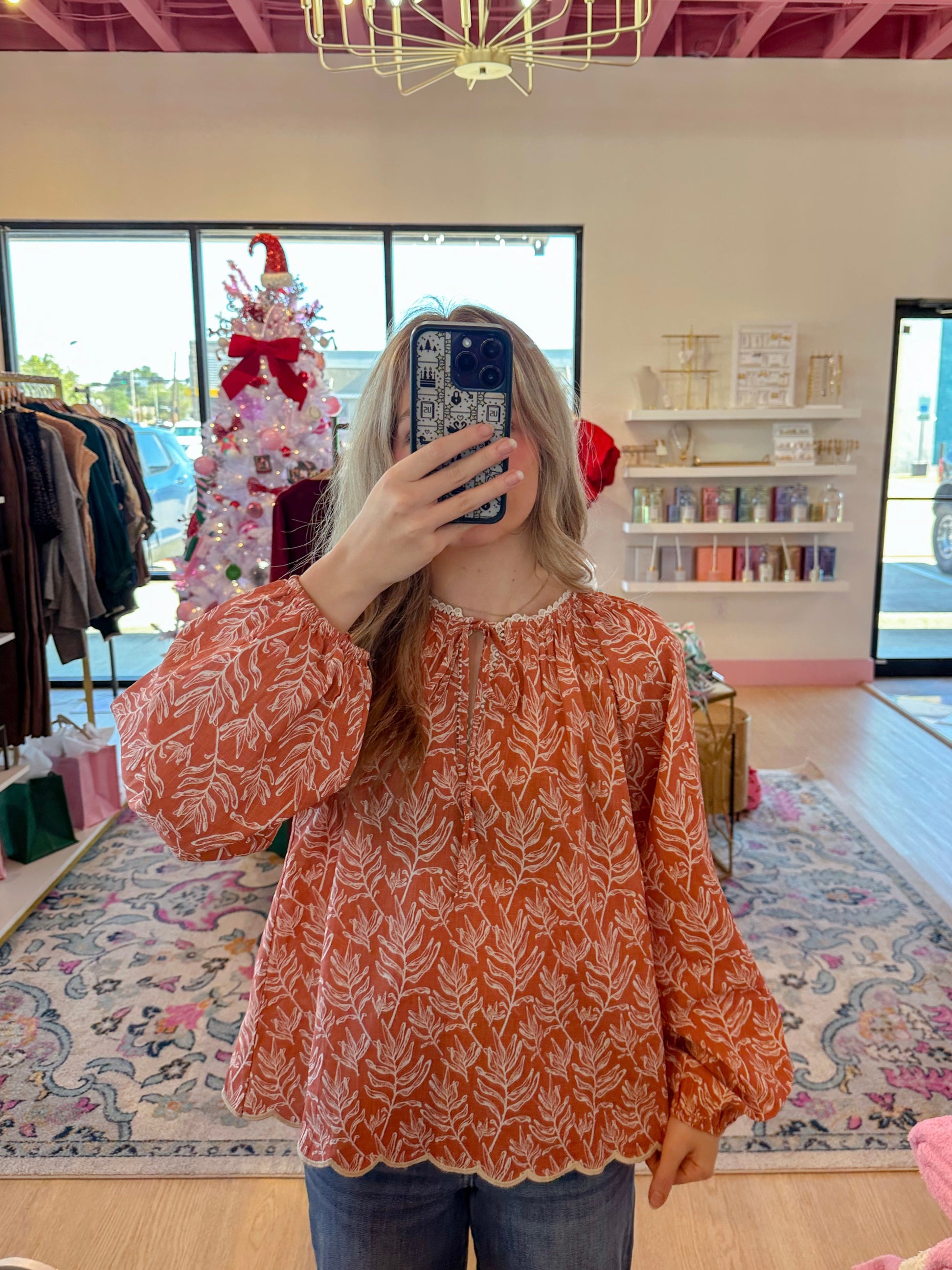 Add a fun twist to your wardrobe with this brick orange long-sleeve peasant top! Featuring a charming leaf print, delicate lace contrast at the neckline, and an embroidered scallop hem, it’s playful and unique. Perfect for those who love to do things differently while staying cozy and stylish.