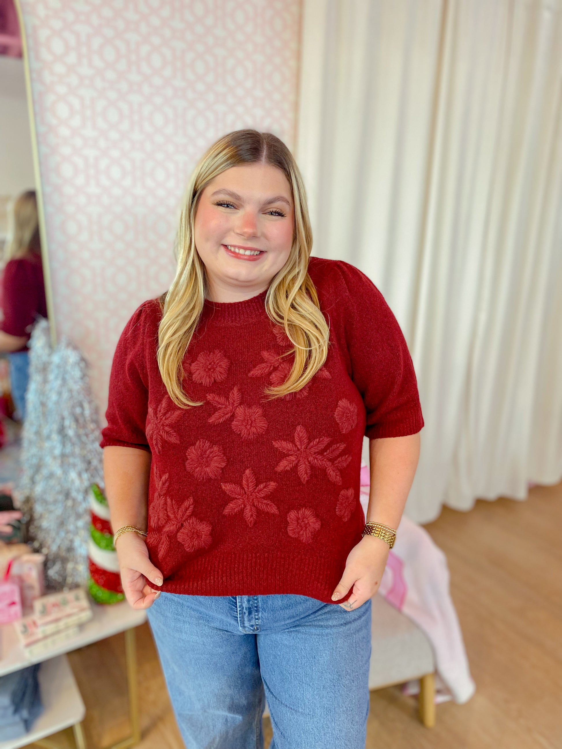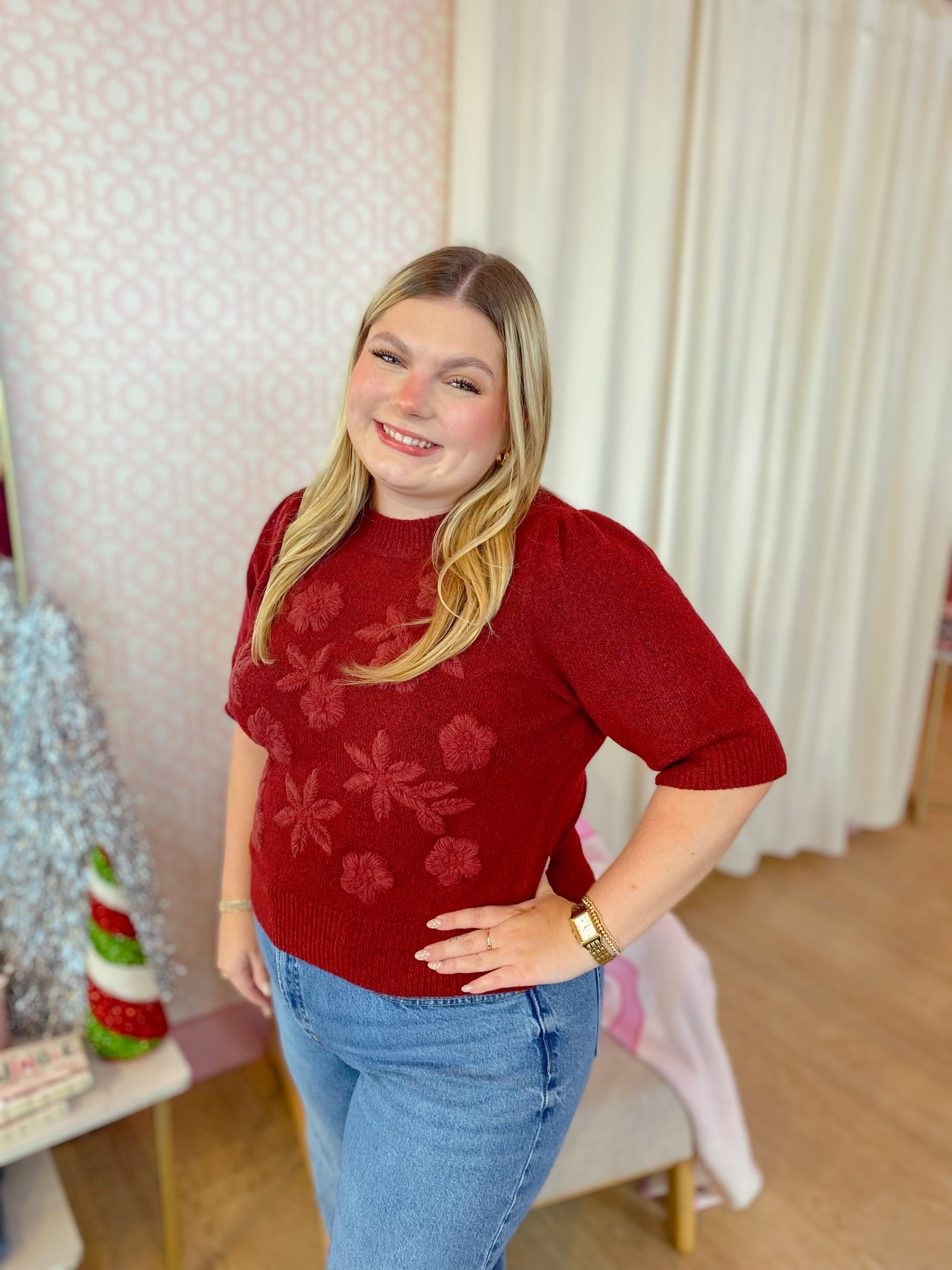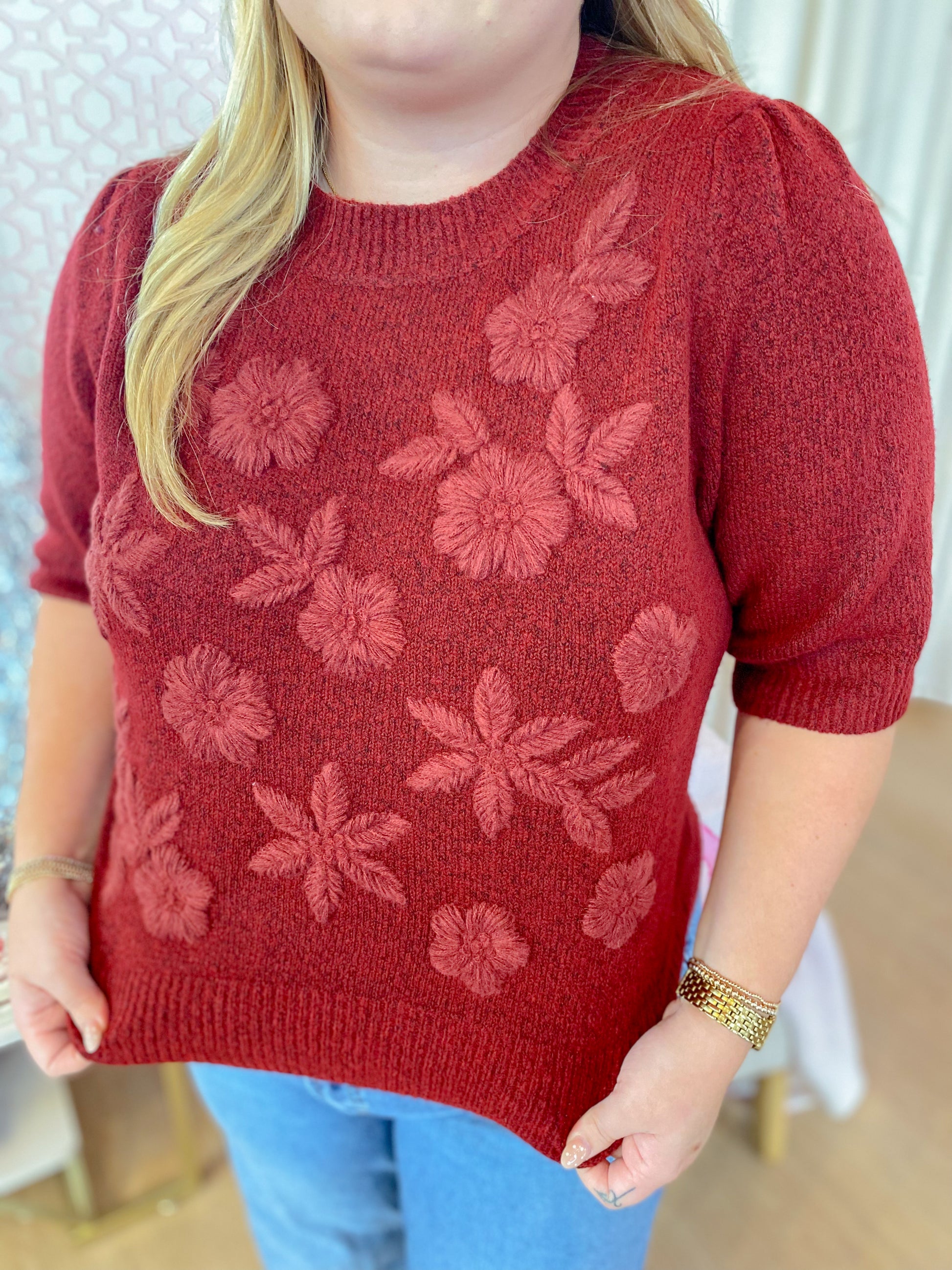 Embrace cozy charm with this burgundy knit top, designed with playful short puff sleeves and delicate floral applique details. Its soft, unlined knit fabric offers comfort while adding a touch of whimsy to your look. Perfect for layering or wearing solo, this sweater brings bold style and sweet femininity together effortlessly.