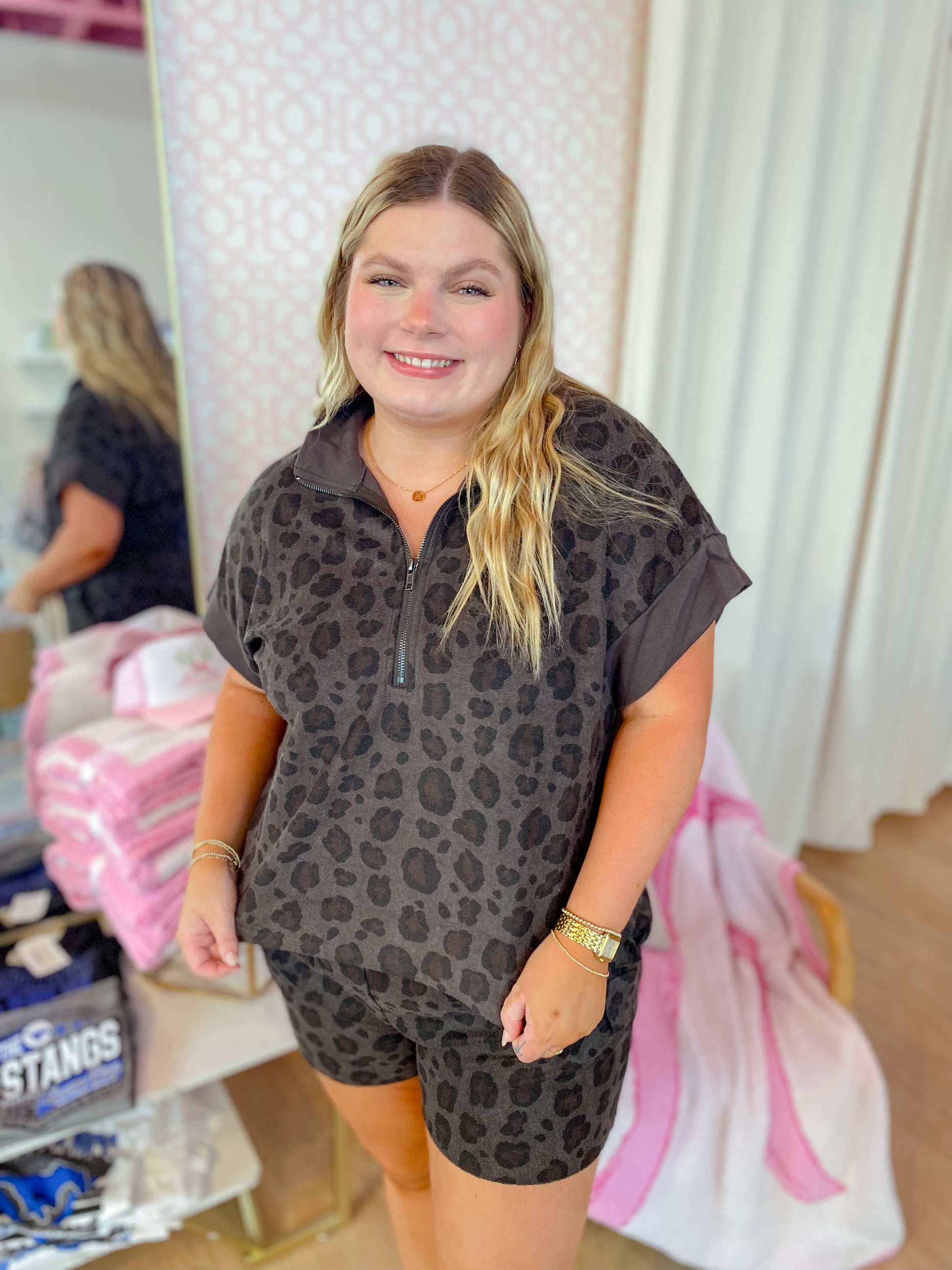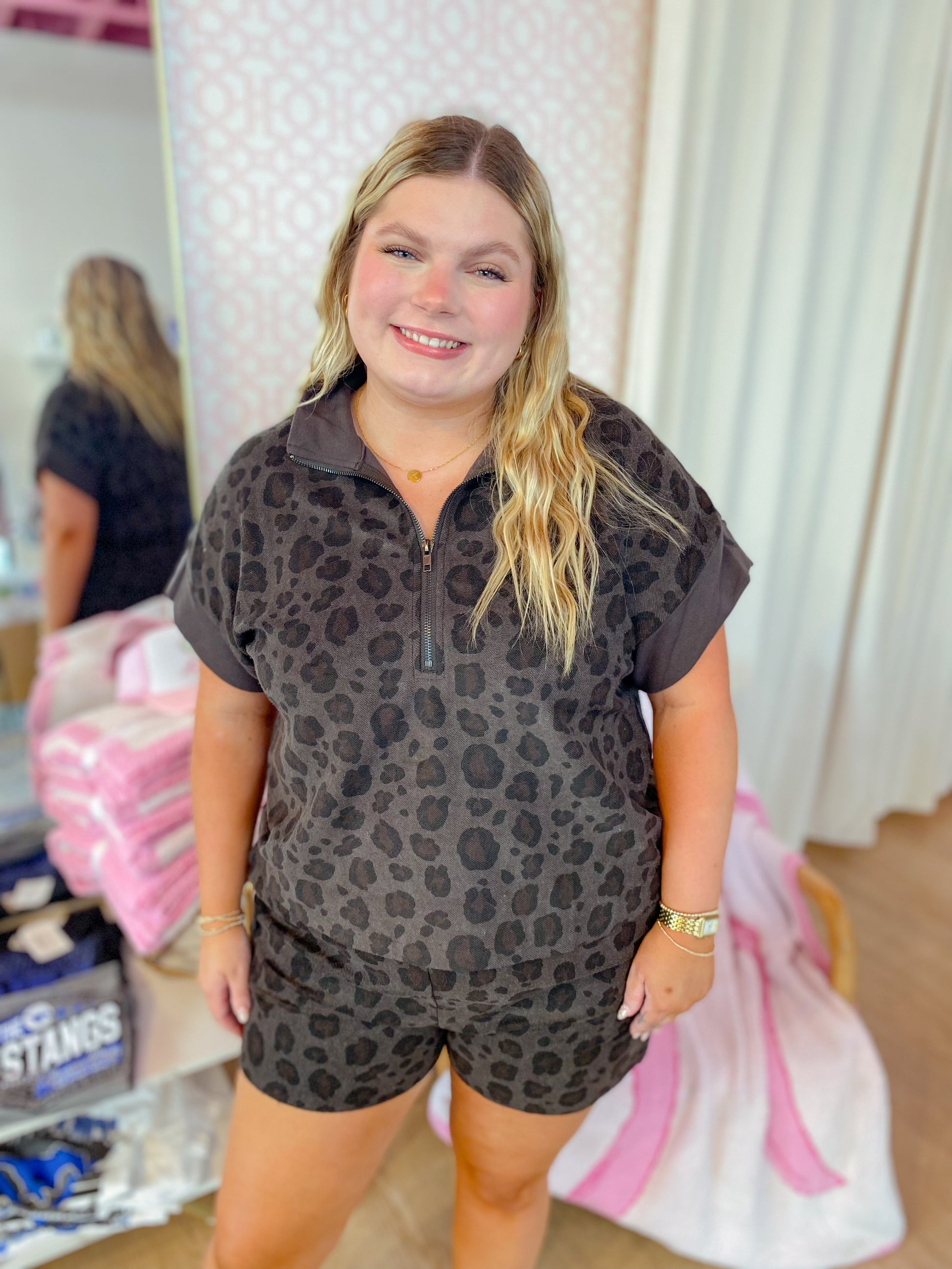Unleash your wild side with the Feeling Pretty Good Set! This charcoal leopard print duo features cozy knit shorts with an elastic waist and handy pockets for effortless comfort. The half-sleeve, half-zip mock neck sweatshirt adds a dash of fun and flair, perfect for lounging or casual adventures. Stylish, comfy, and ready to play—this set is your go-to for feeling fabulous every day.