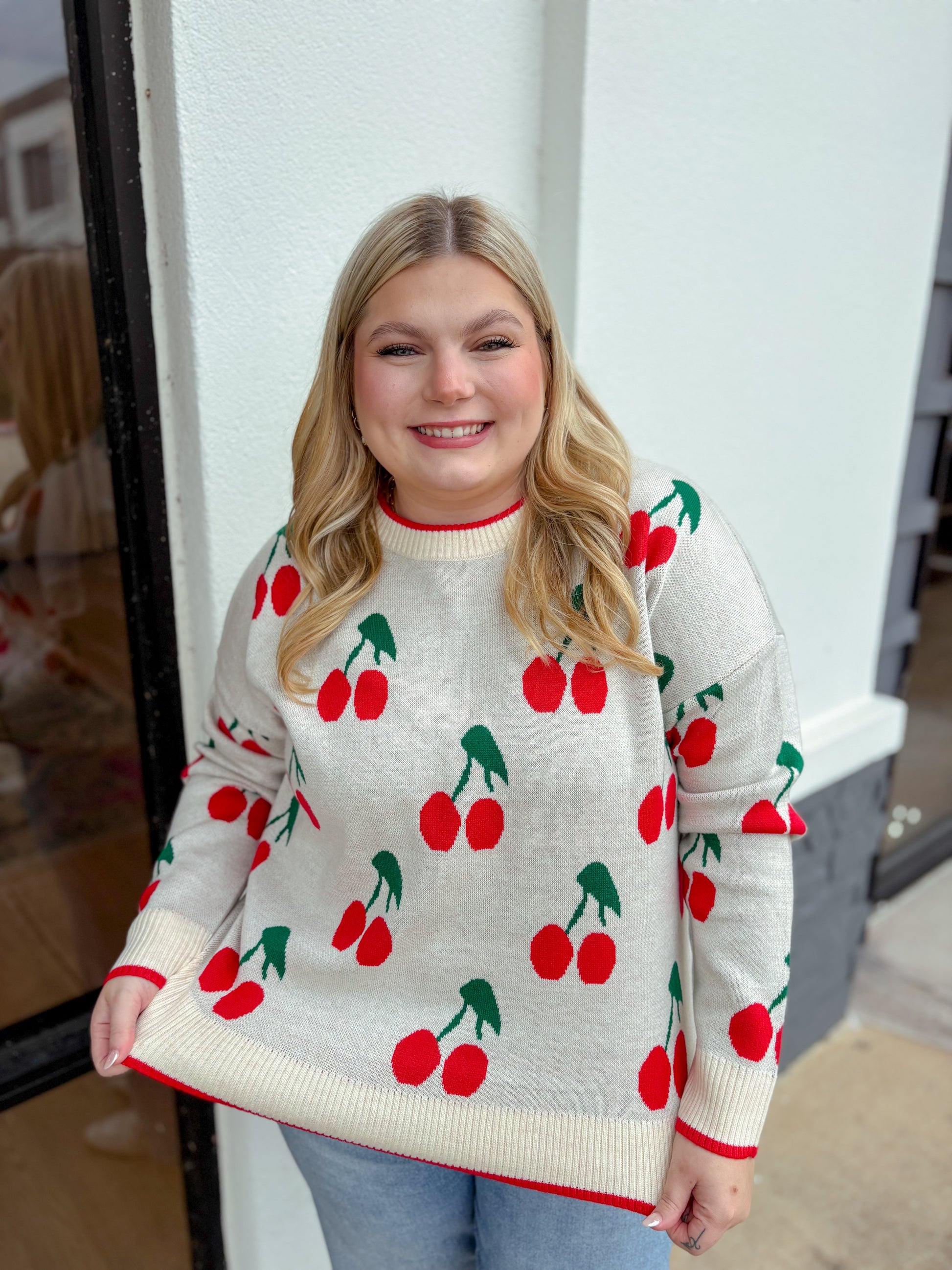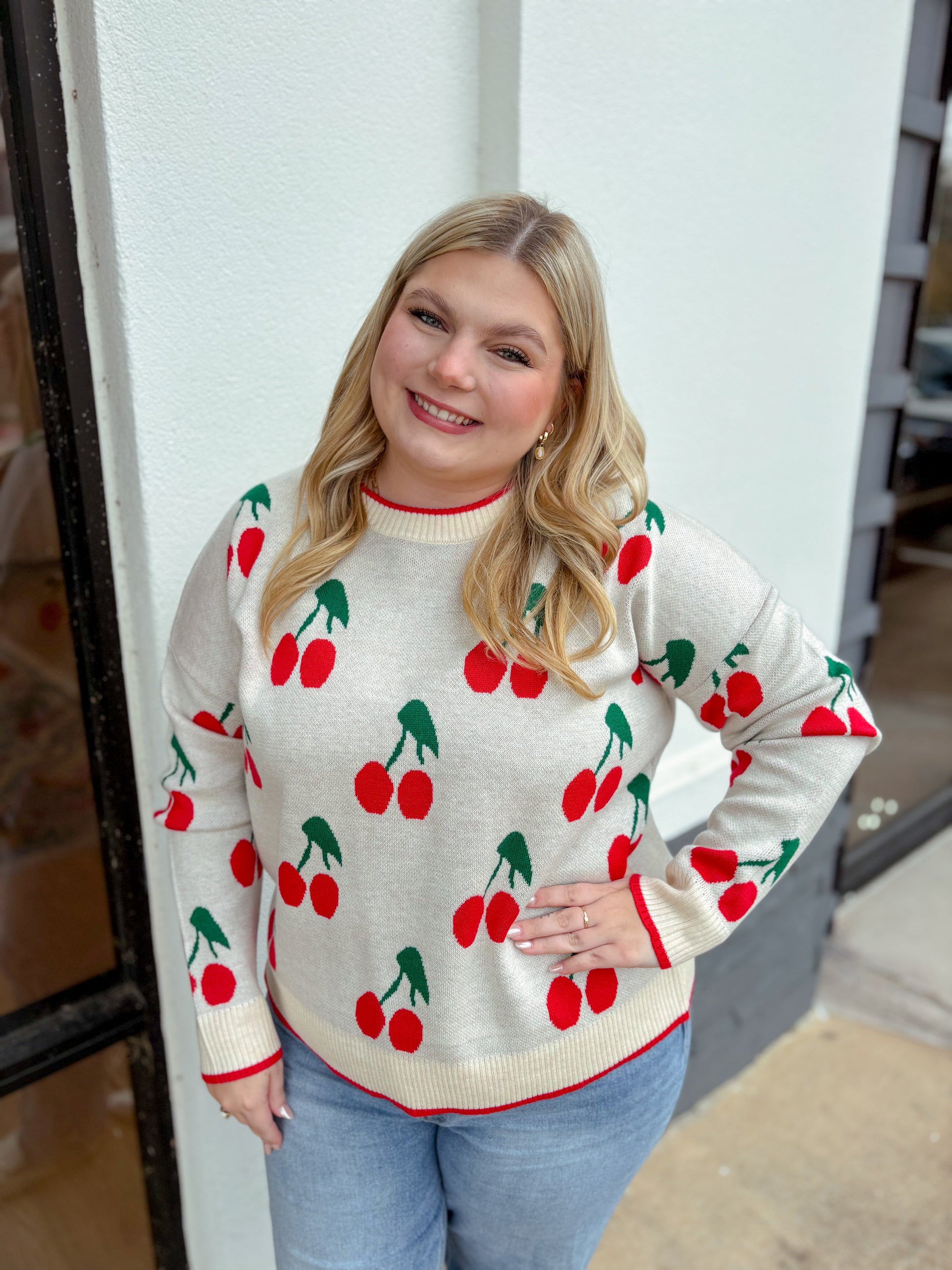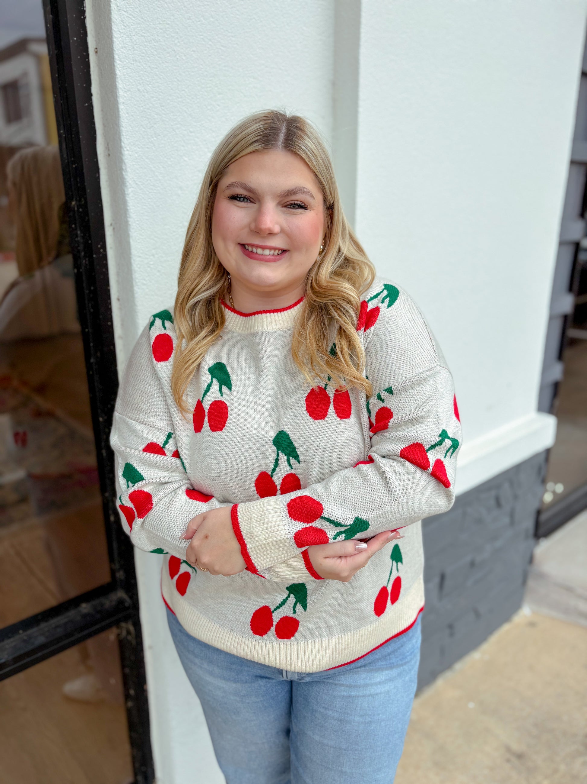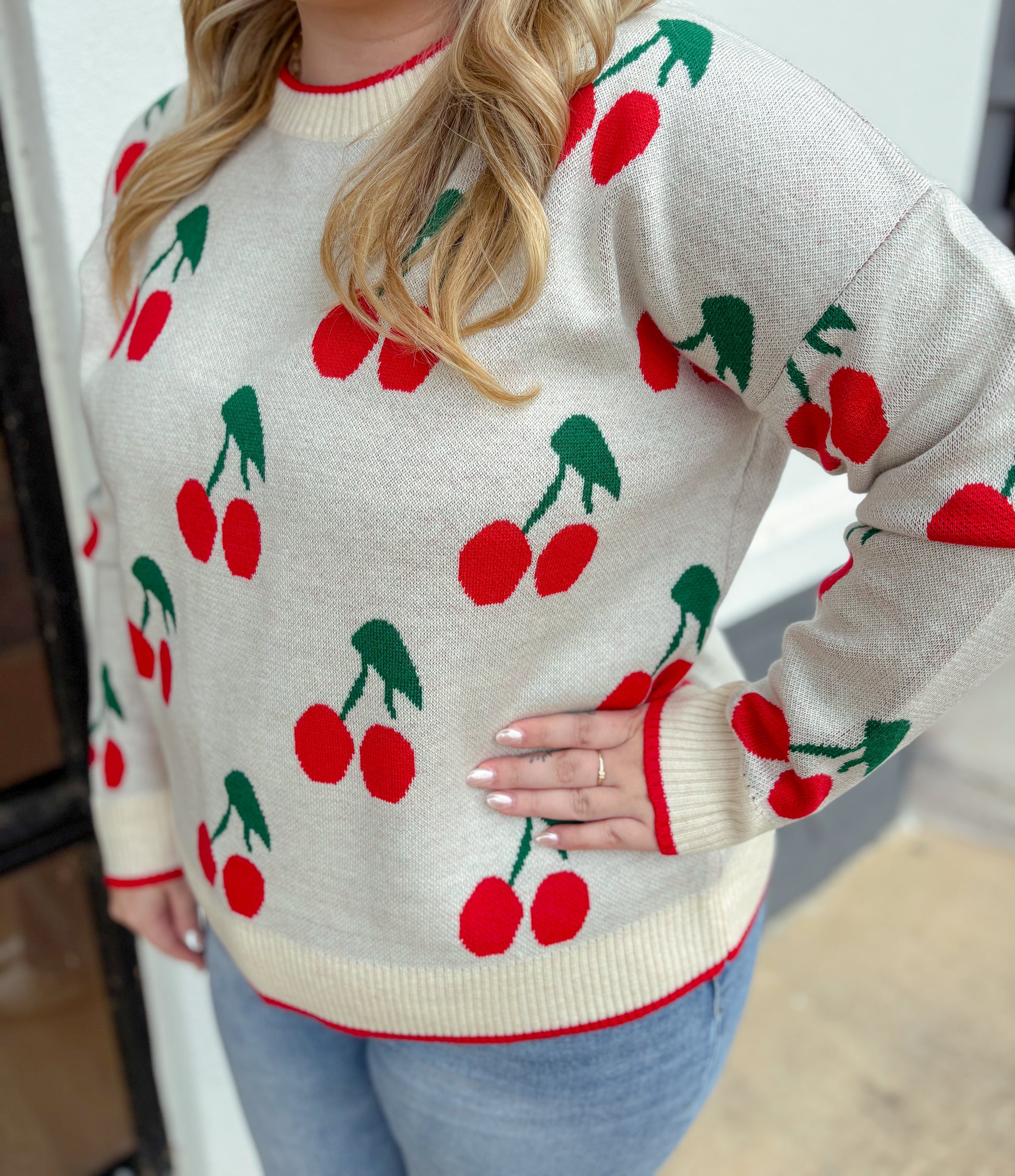 Cozy up in this charming pullover sweater featuring a delightful cherry pattern against a creamy backdrop. The long sleeves and classic crew neck make it perfect for layering through the seasons, while the playful red cherry design adds a fun pop of personality to your everyday wardrobe. A timeless piece that feels as good as it looks!