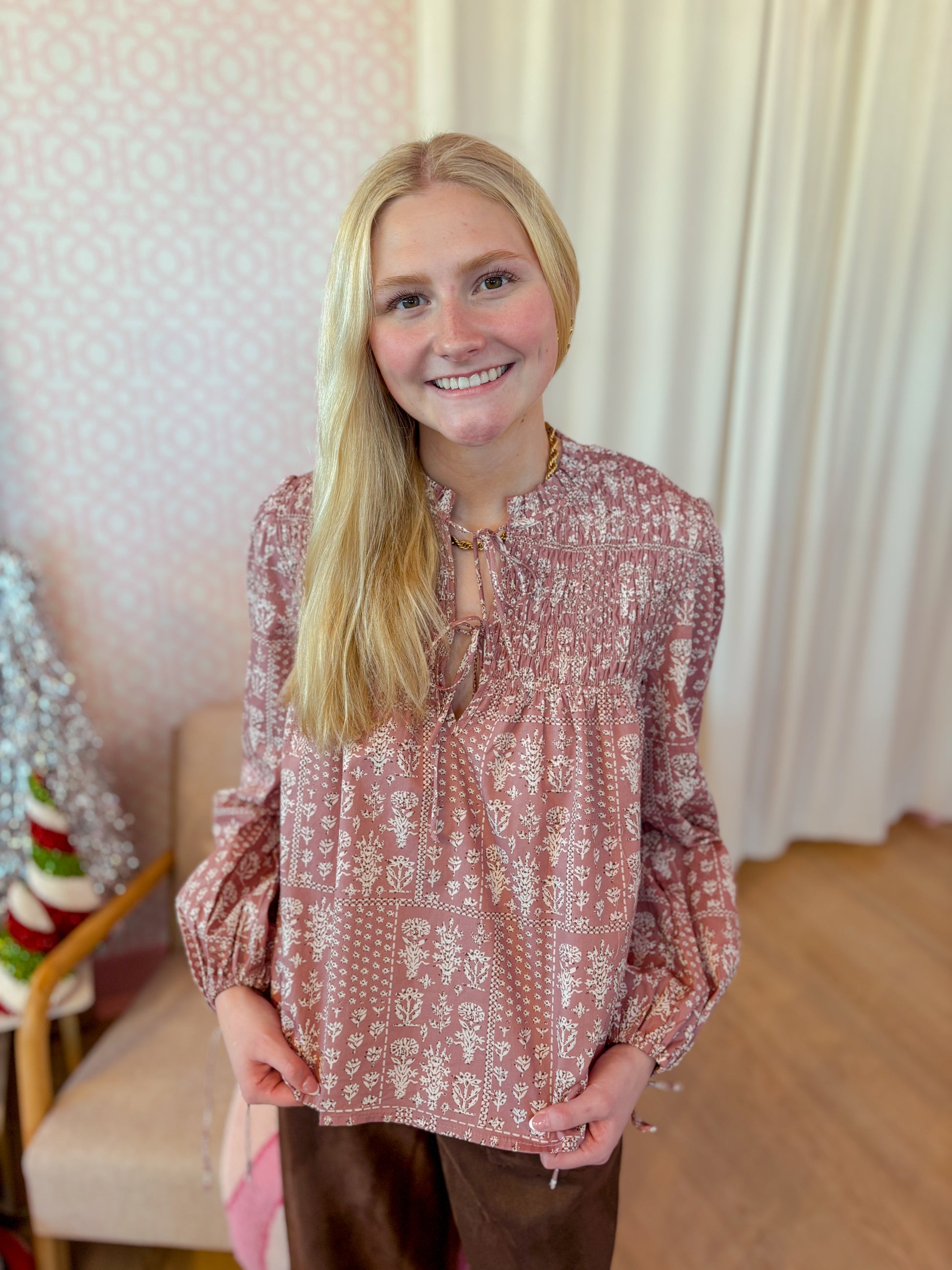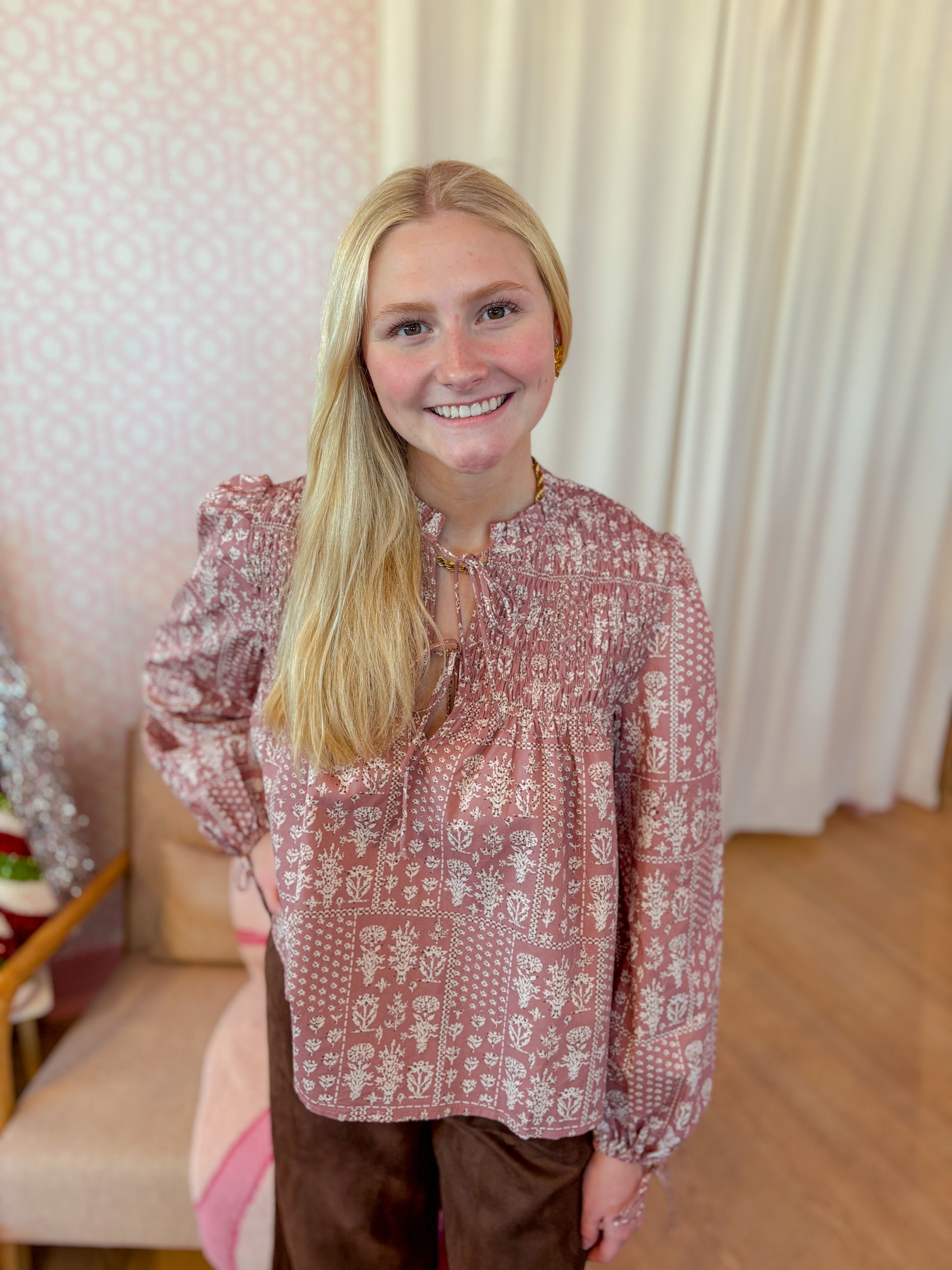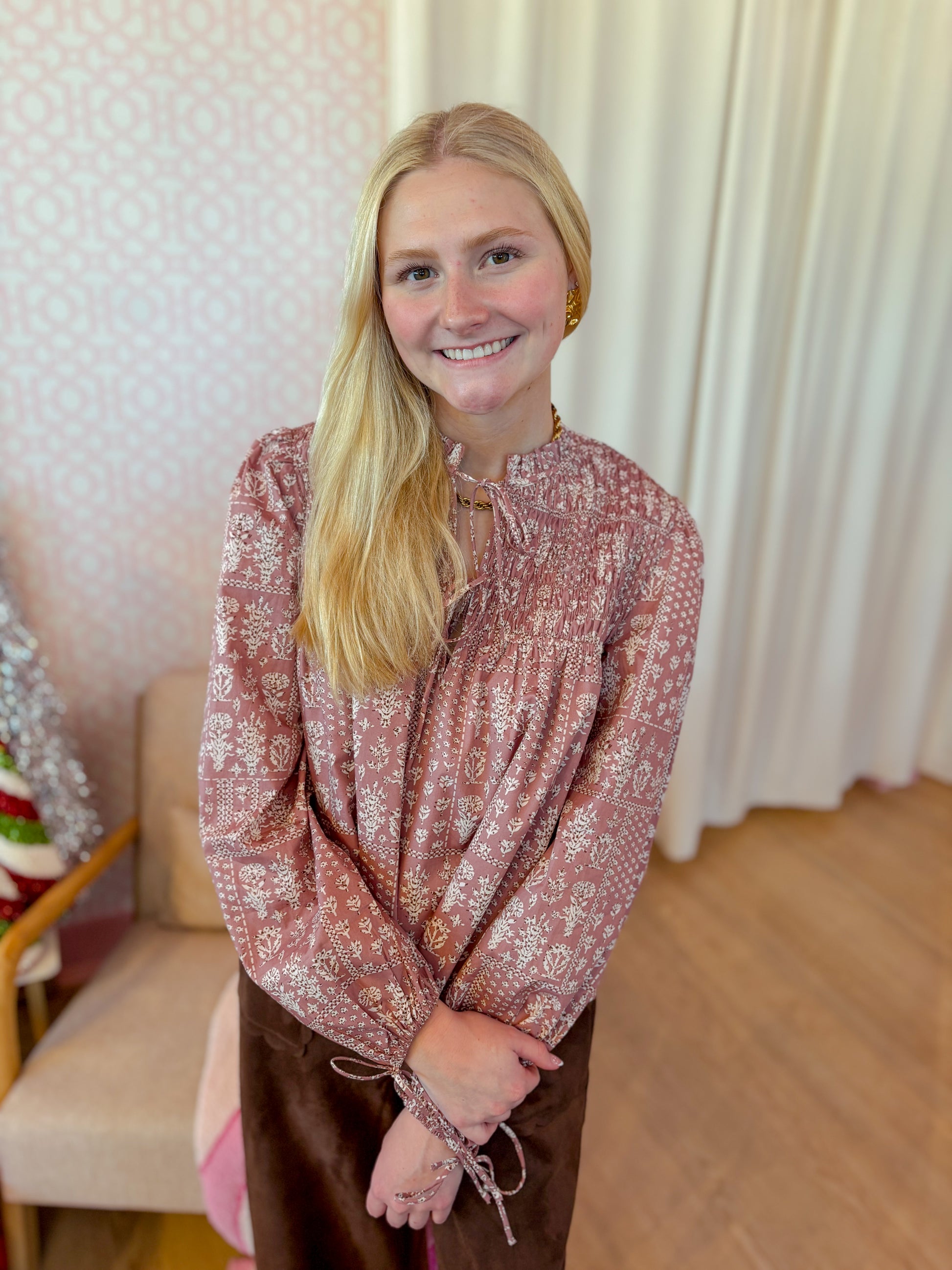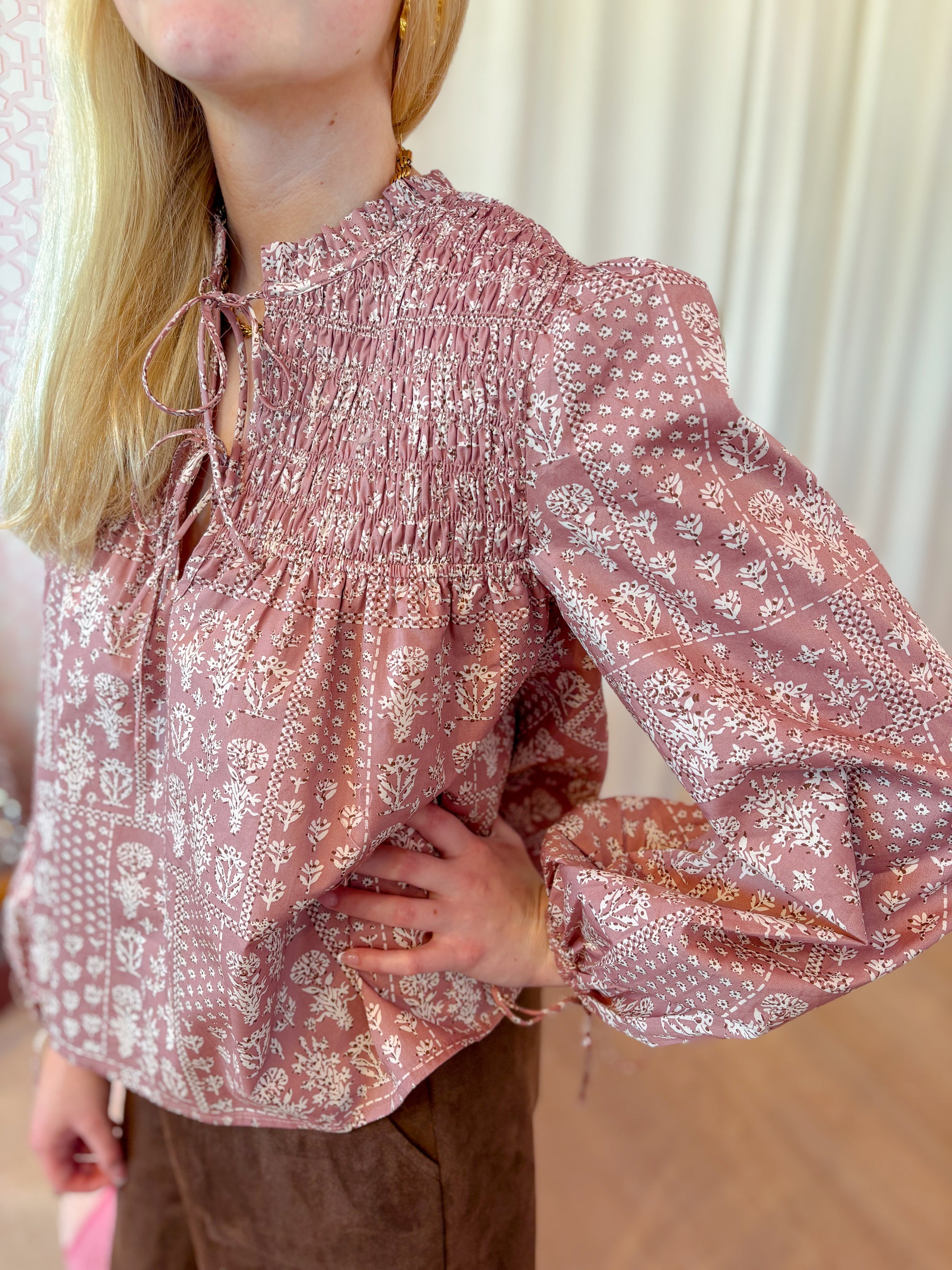 The First Crush top in mauve pink is made from crisp cotton poplin with a comfy smocked yoke. It has adjustable front ties and elasticated sleeves with ties for a fun, easy style!