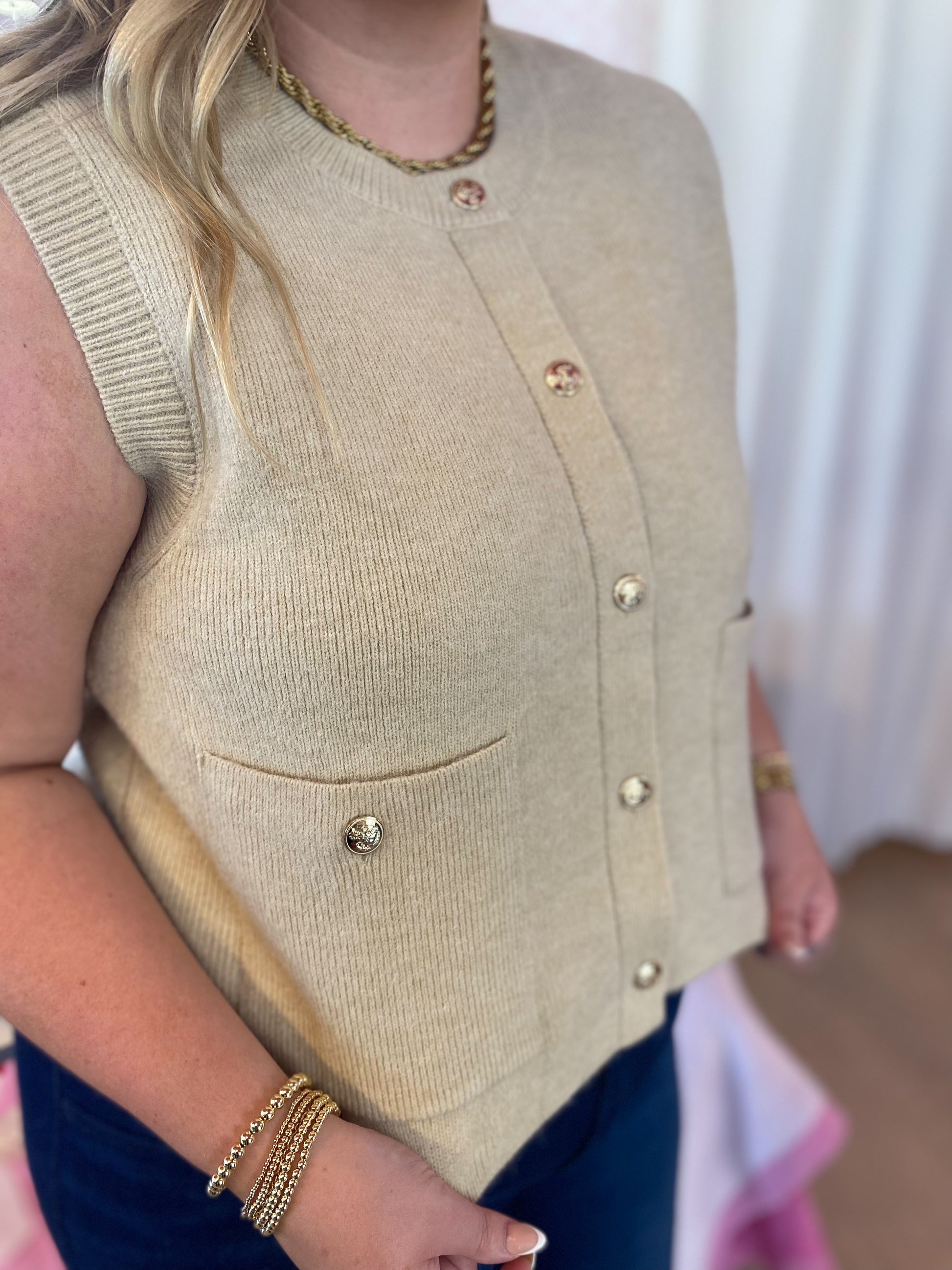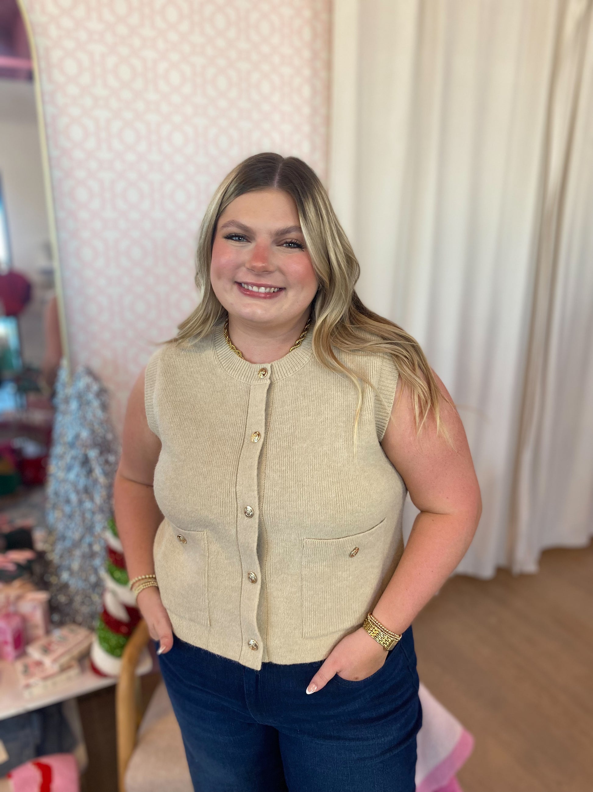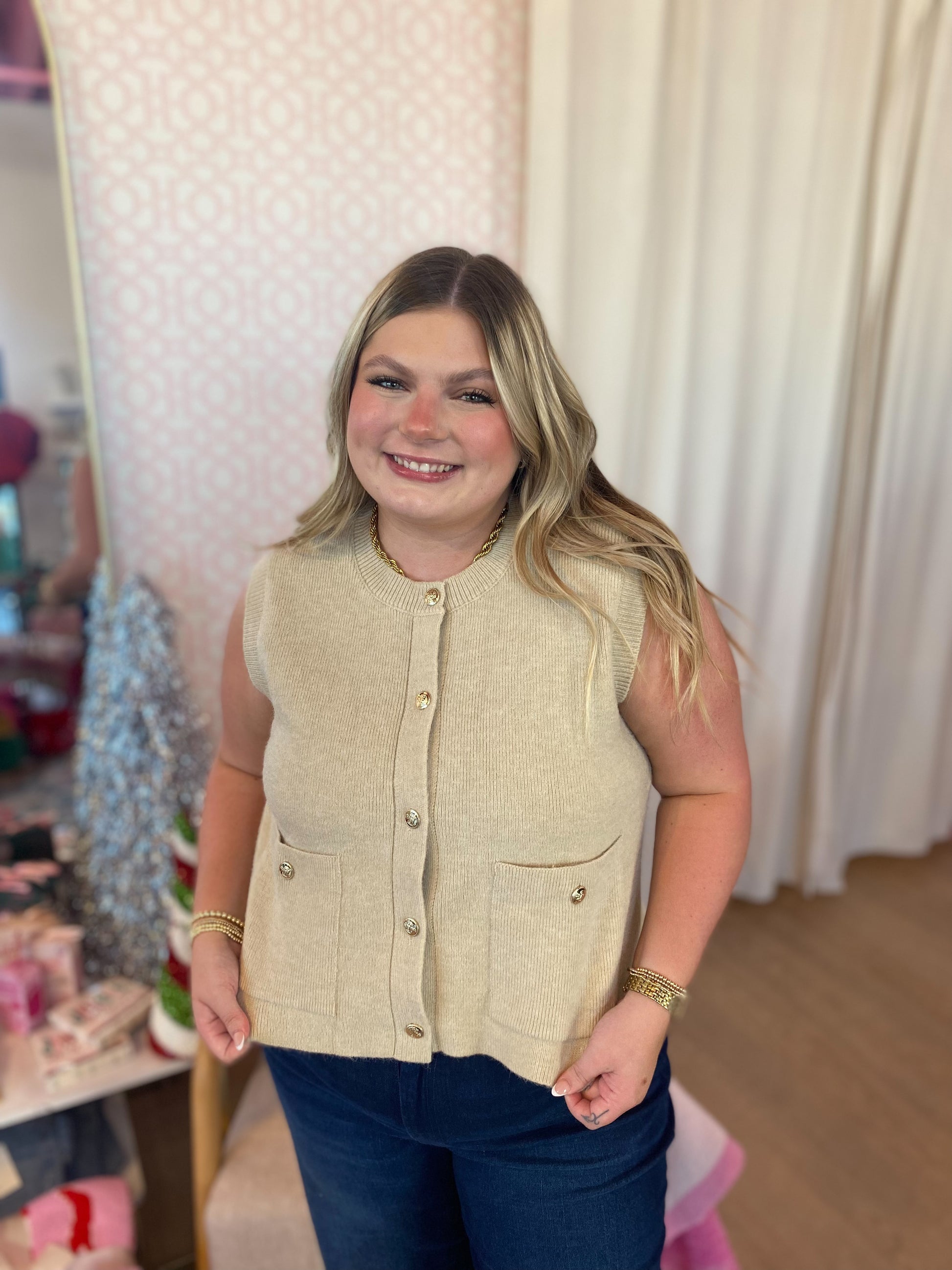 This ecru sweater knit vest is your new go-to for cozy-chic vibes. Featuring shiny gold buttons that add a pop of glam, plus handy front pockets for stashing little treasures. Unlined for a lightweight feel that layers perfectly or shines on its own—giving thanks never looked so stylish!