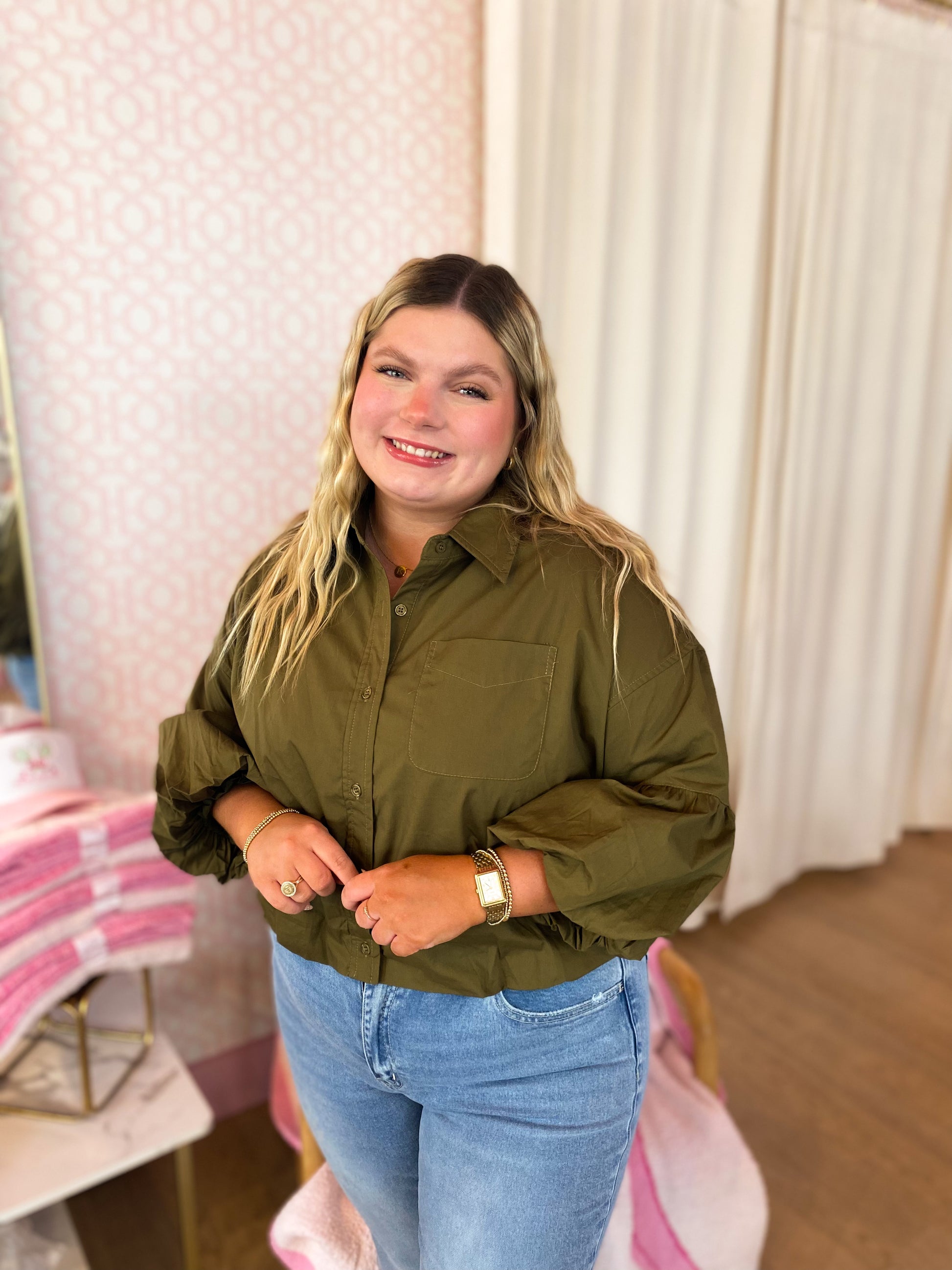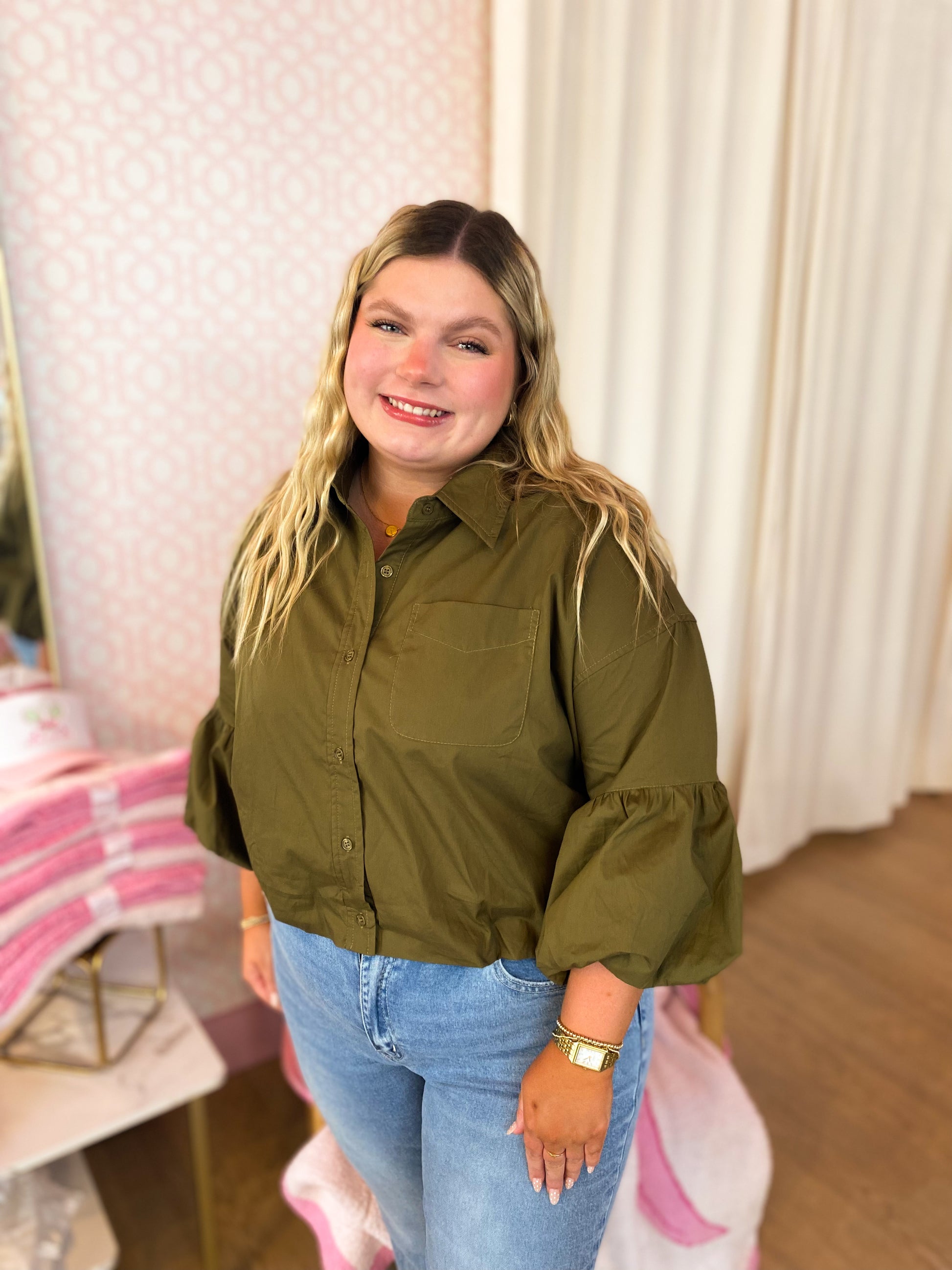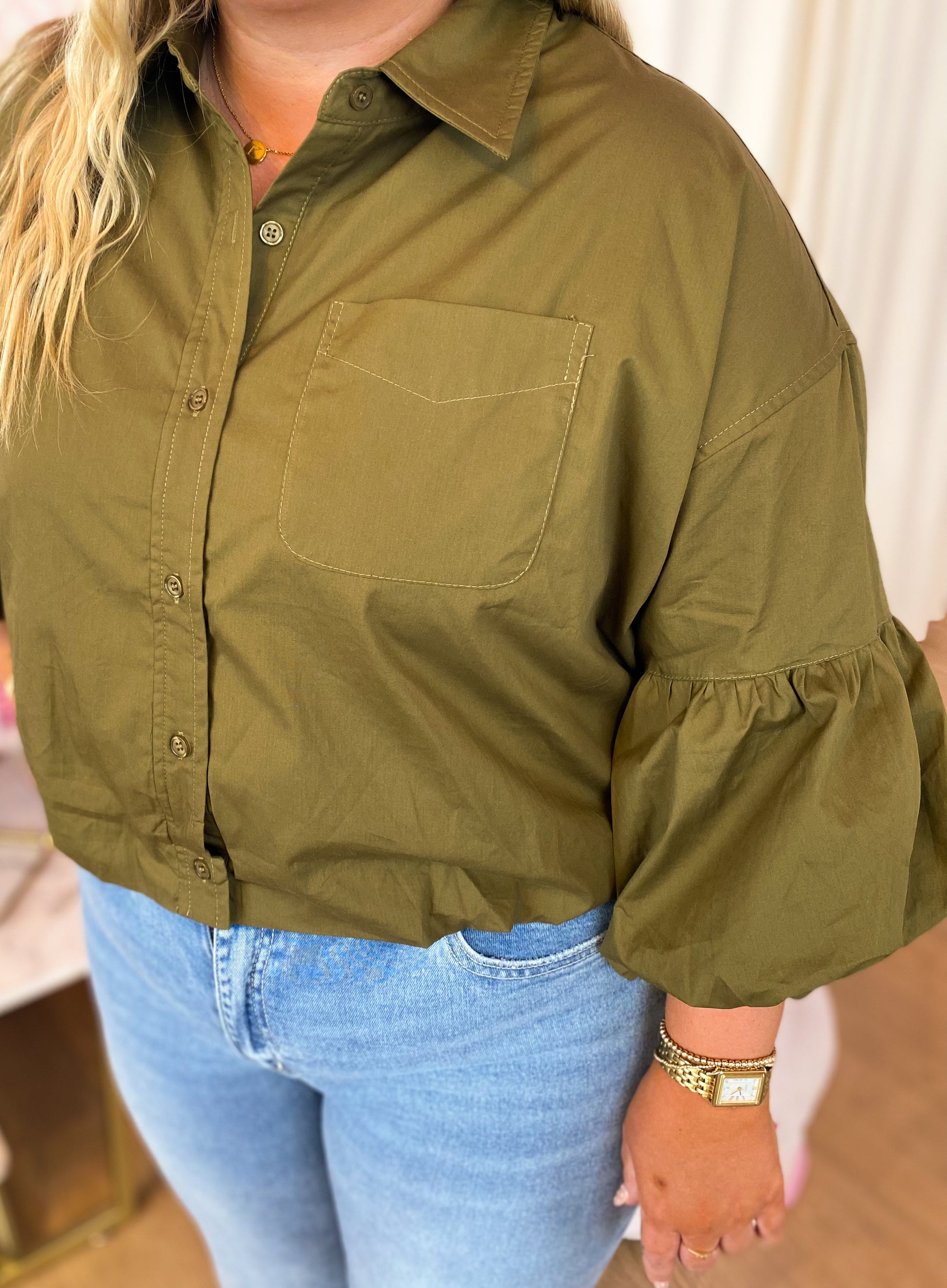 This playful ash olive top has a collared neckline, button-down front, and drop shoulders. Its 3/4 balloon sleeves and bubble hem add a fun, flirty vibe to any look!
