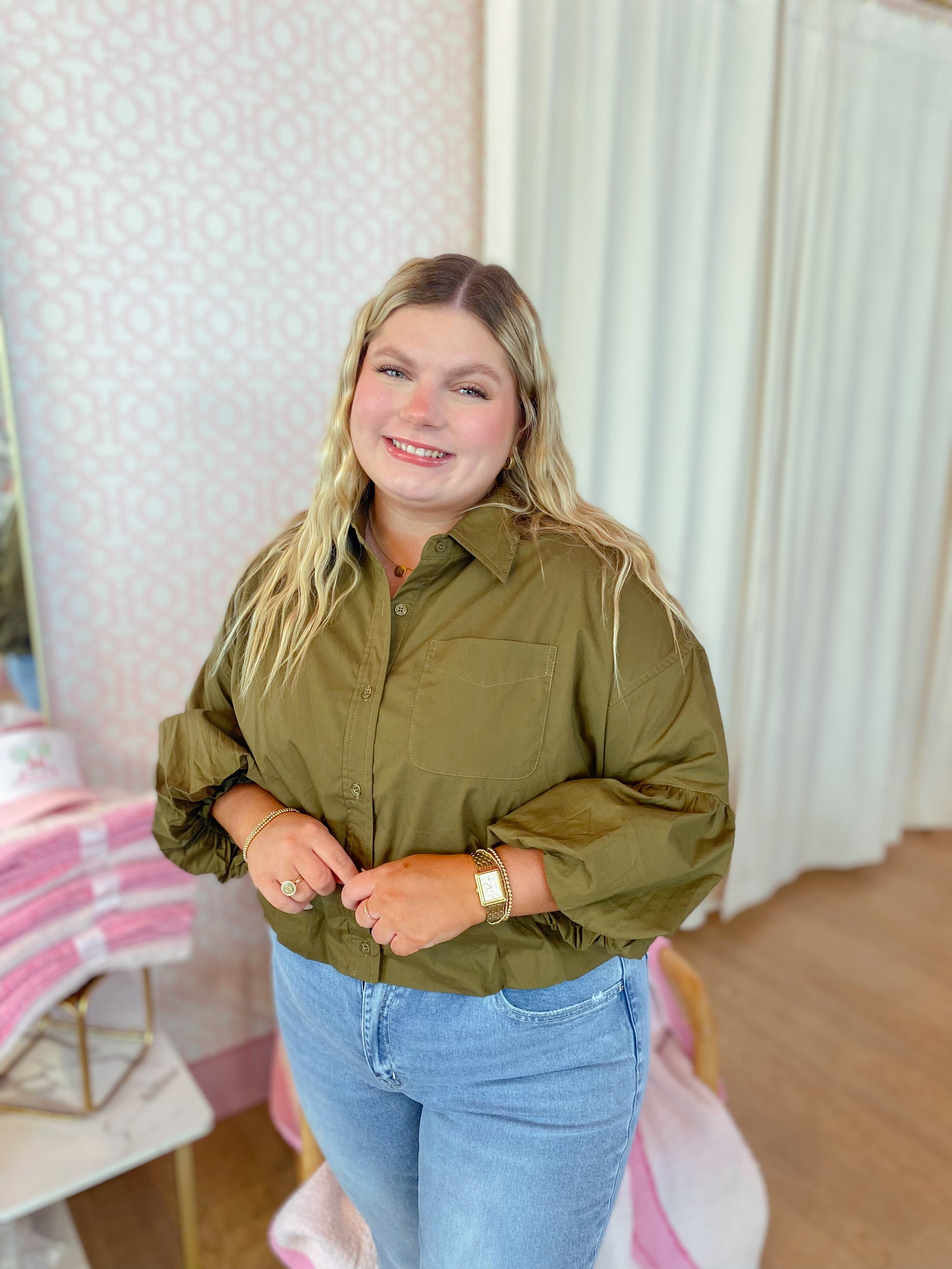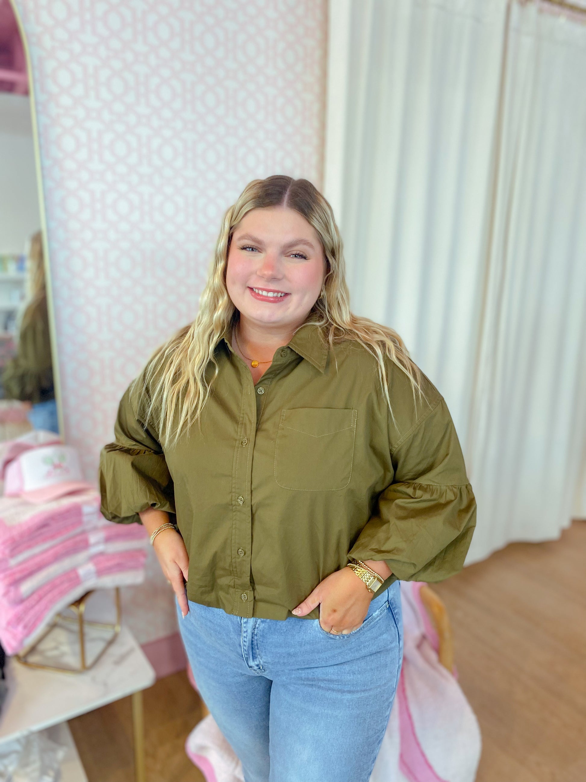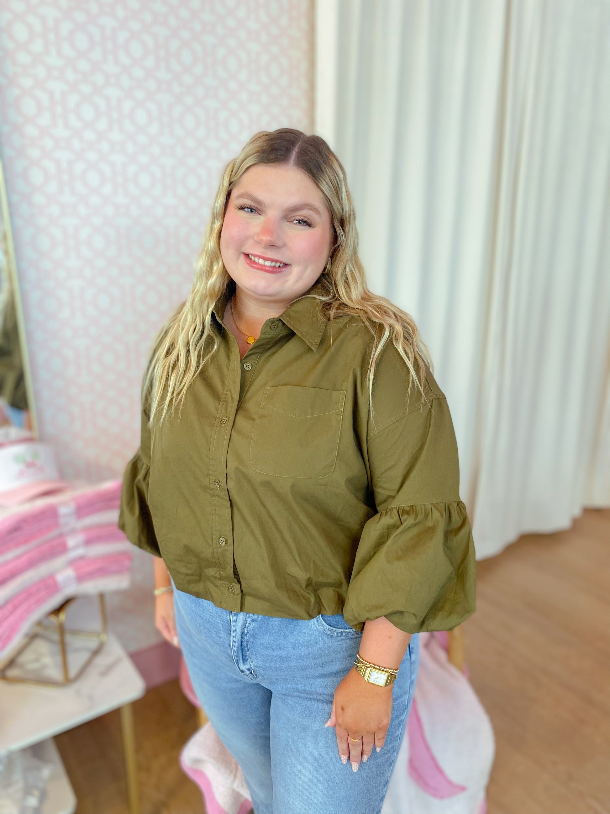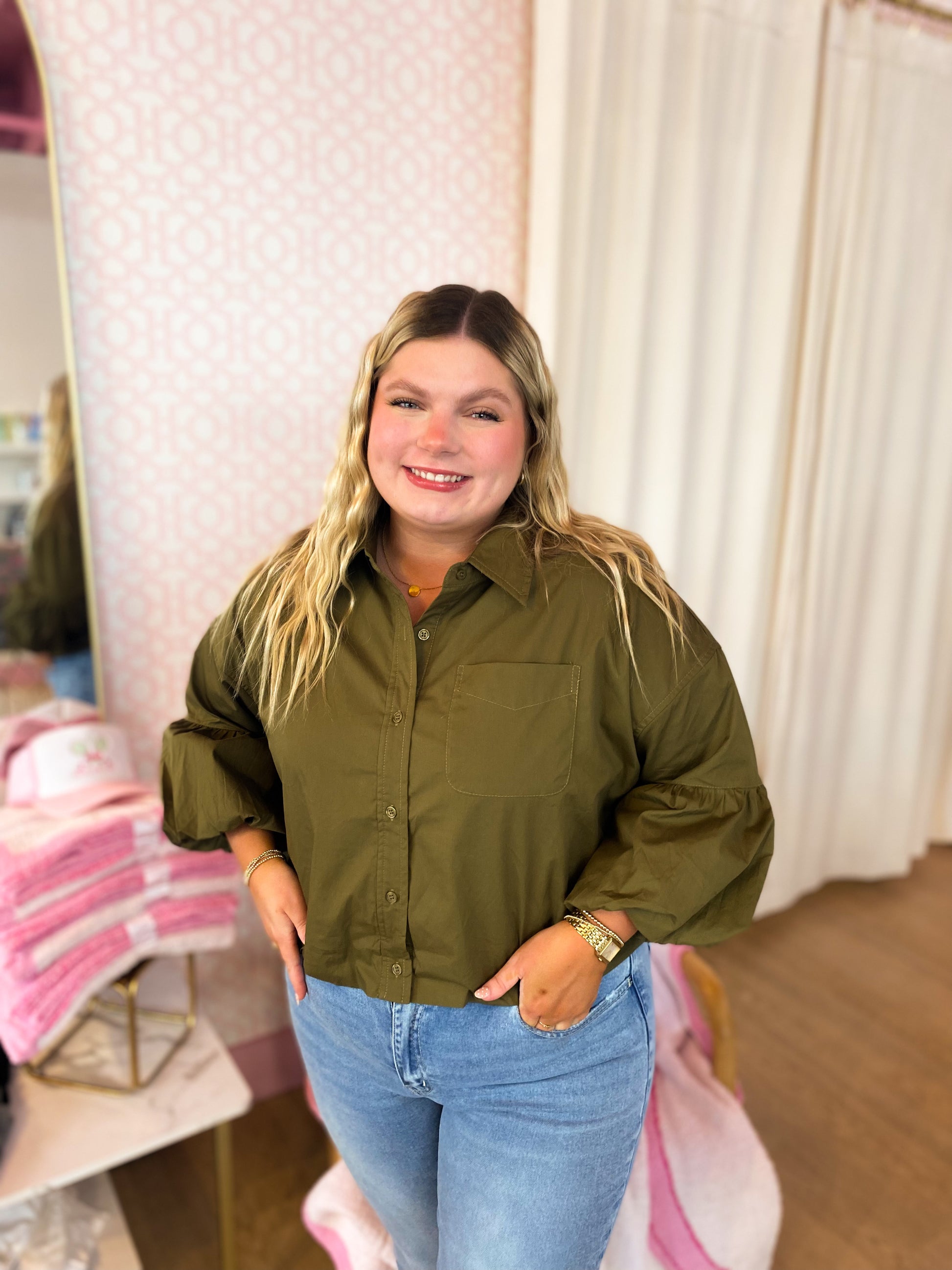 This playful ash olive top has a collared neckline, button-down front, and drop shoulders. Its 3/4 balloon sleeves and bubble hem add a fun, flirty vibe to any look!