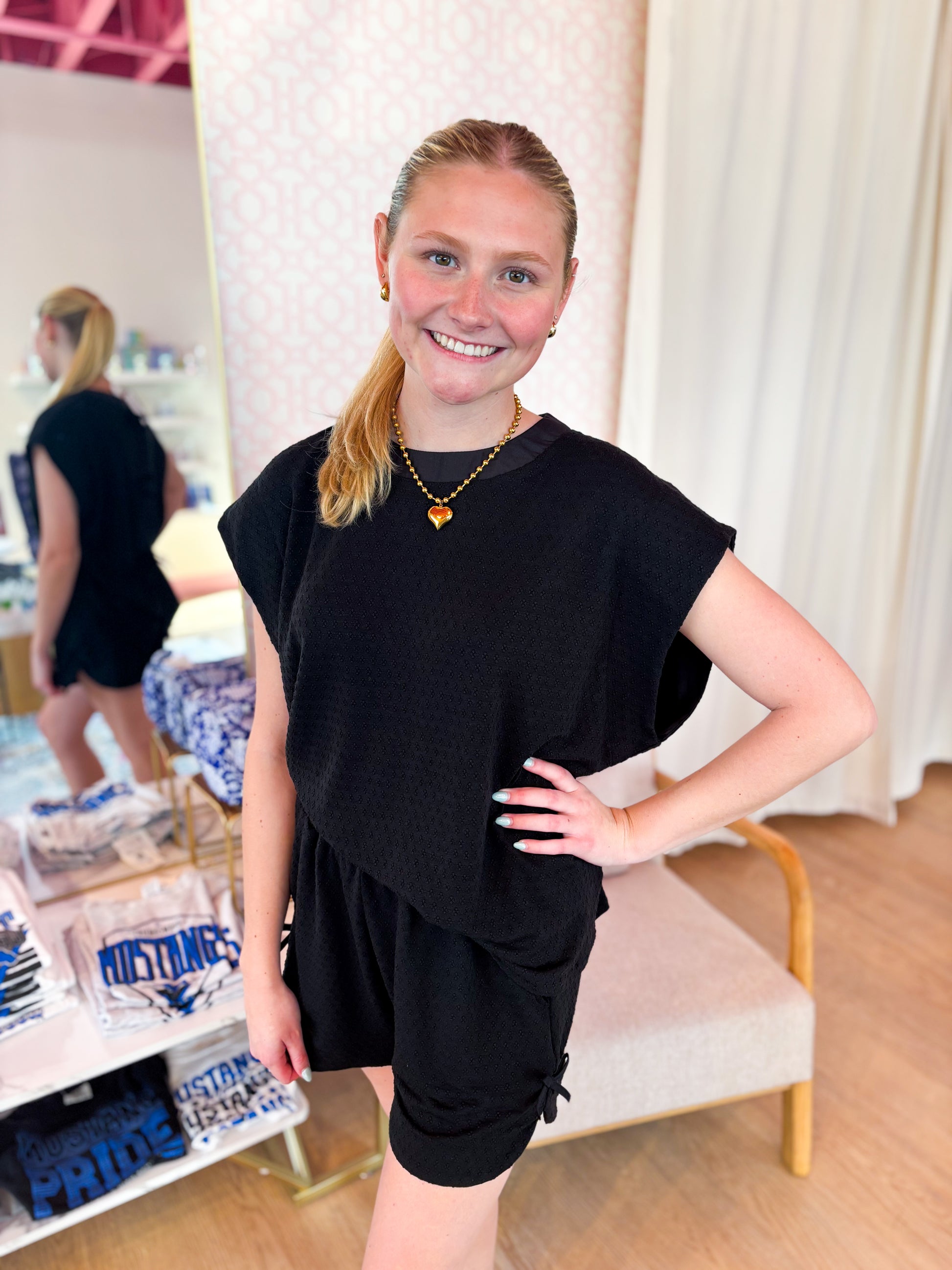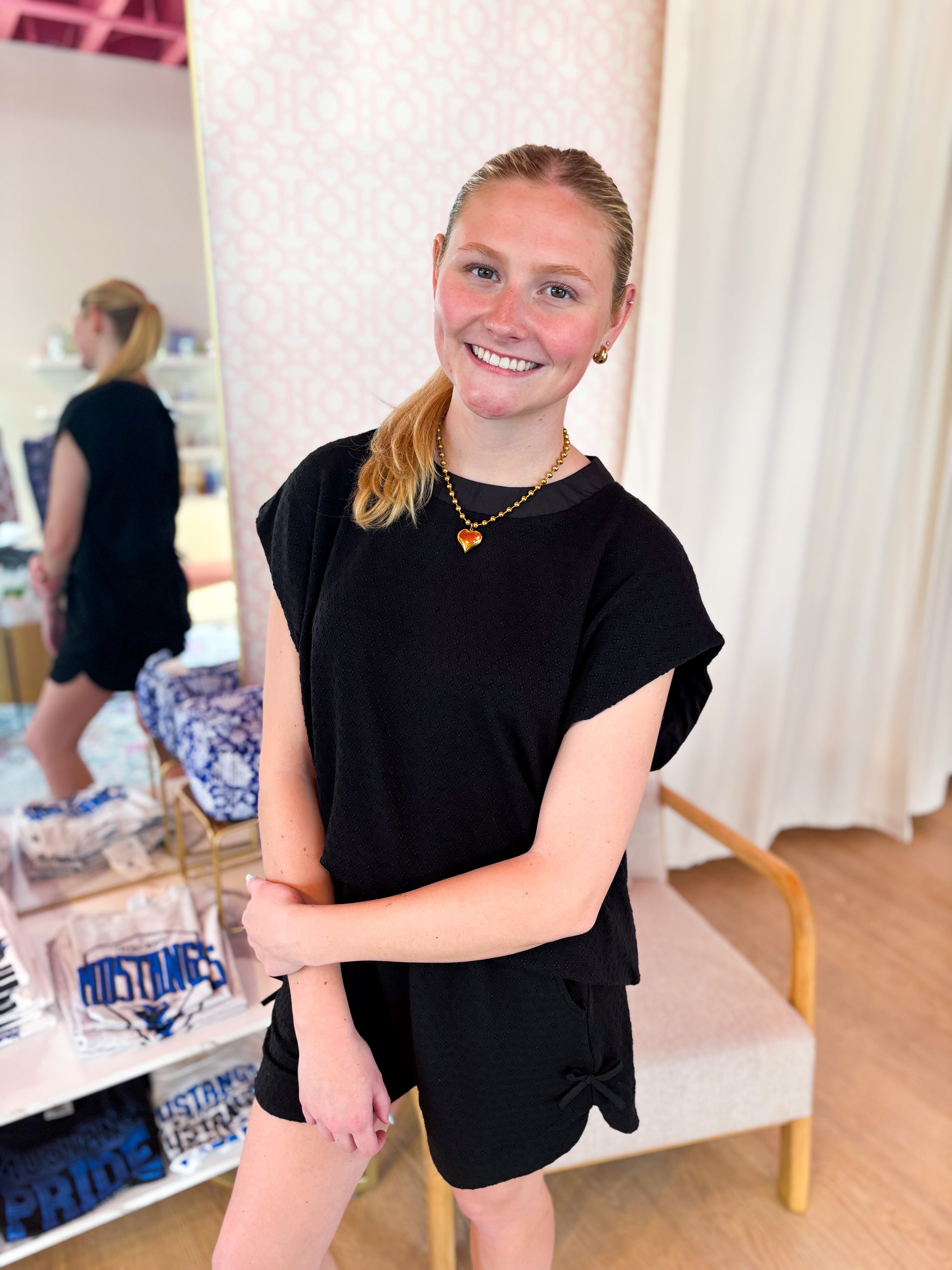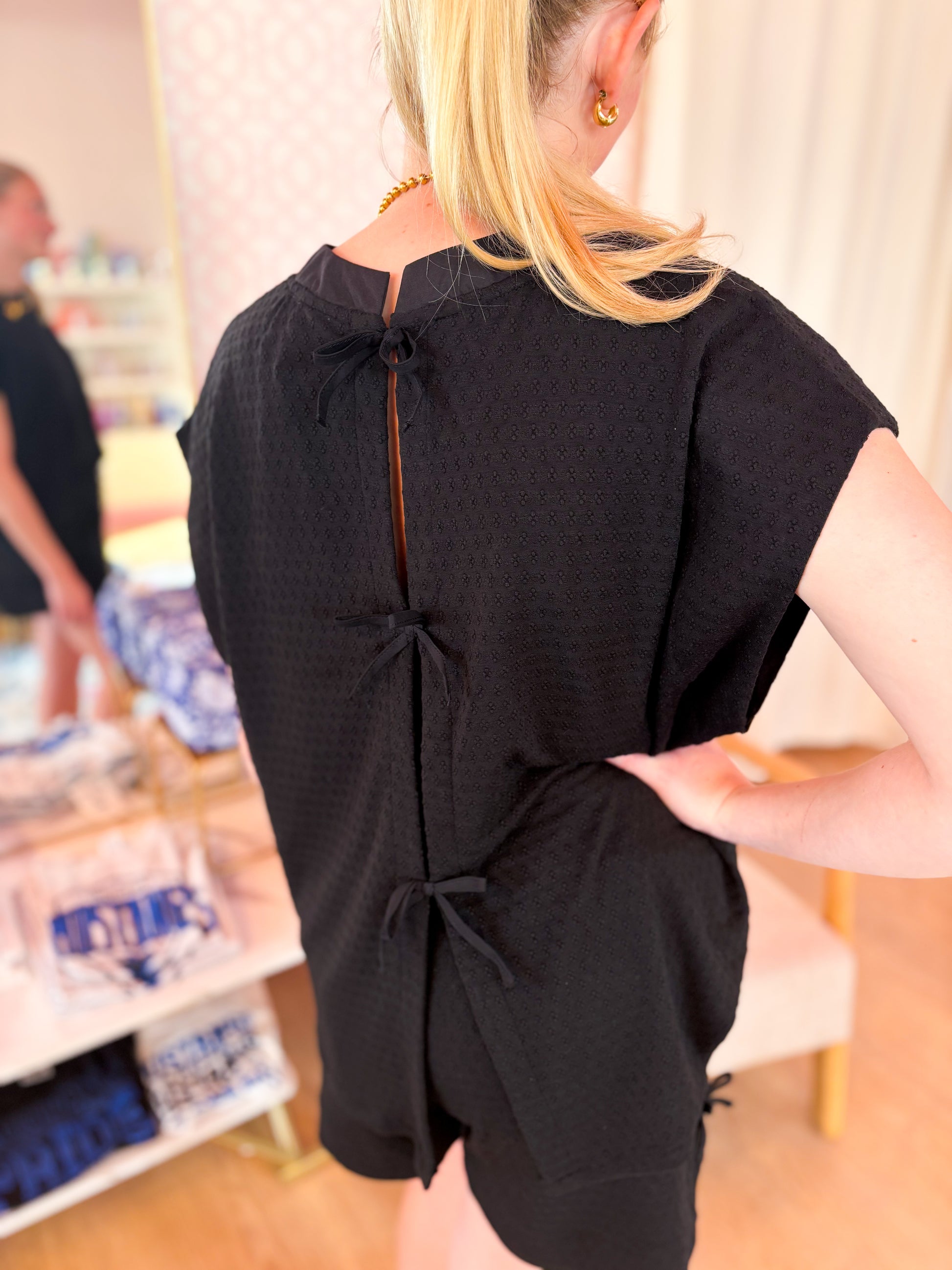 Get ready to obsess over this set! Made from jacquard jersey material, this black shirt and shorts combo is both comfortable and stylish. Adorable bow detailing adds a cute edge to the shorts and a playful touch to the plain front top with bow tie details on the back. Add some fun to your wardrobe with this unique set!