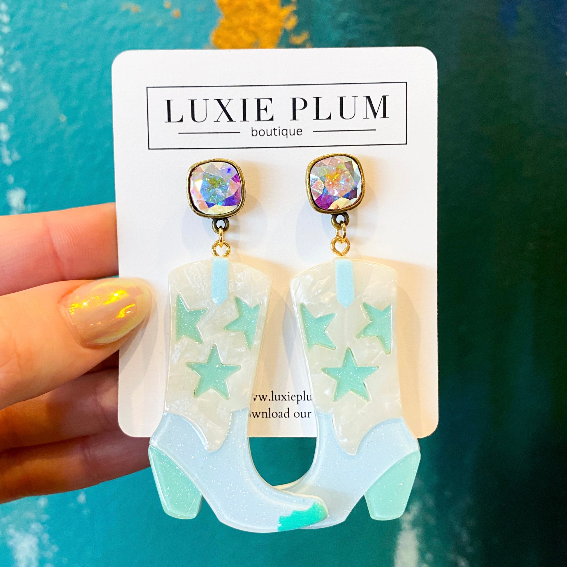 How adorable are these teal/light blue acrylic cowboy boot earrings?! Perfect for rodeo/country concerts!