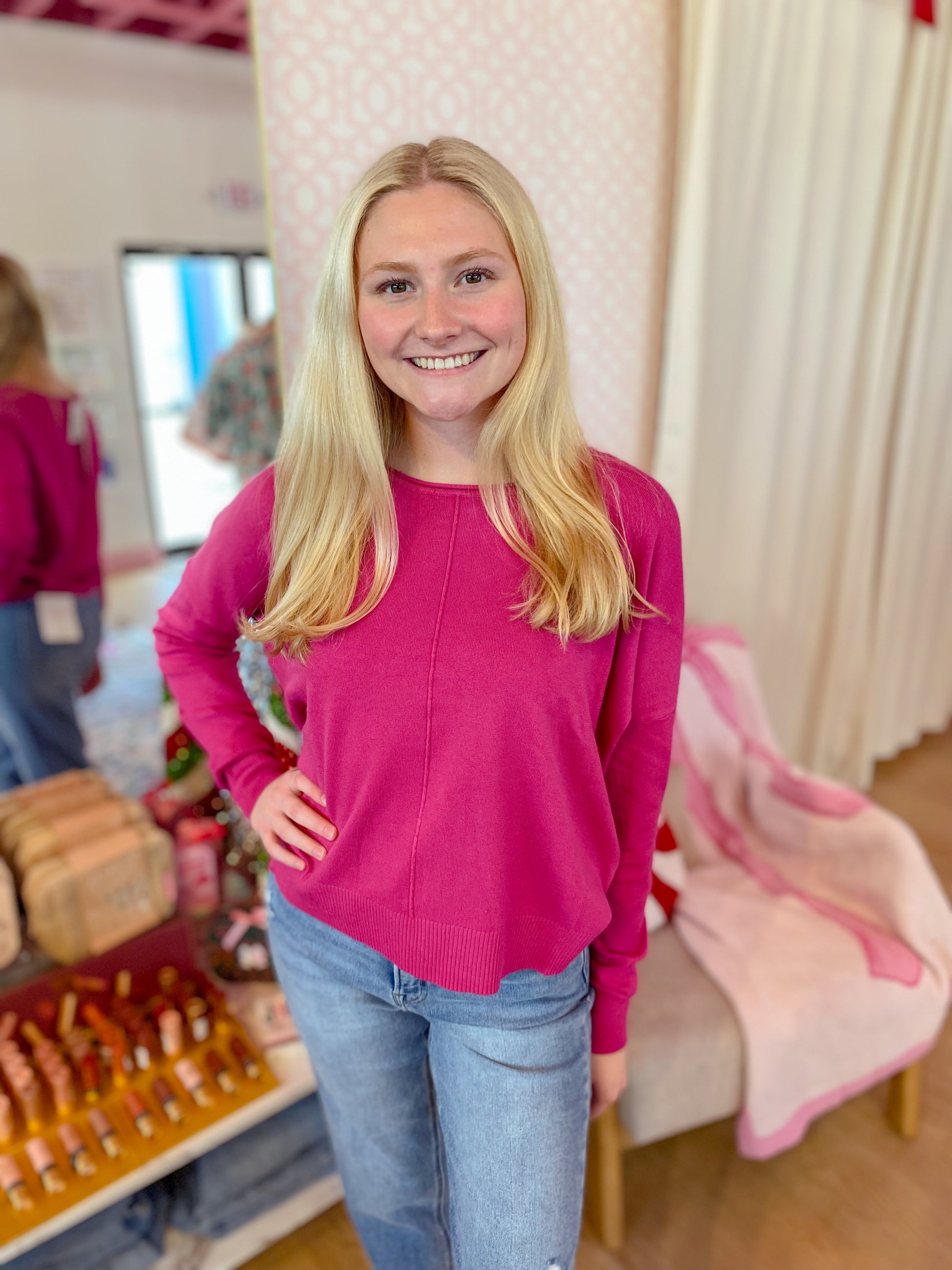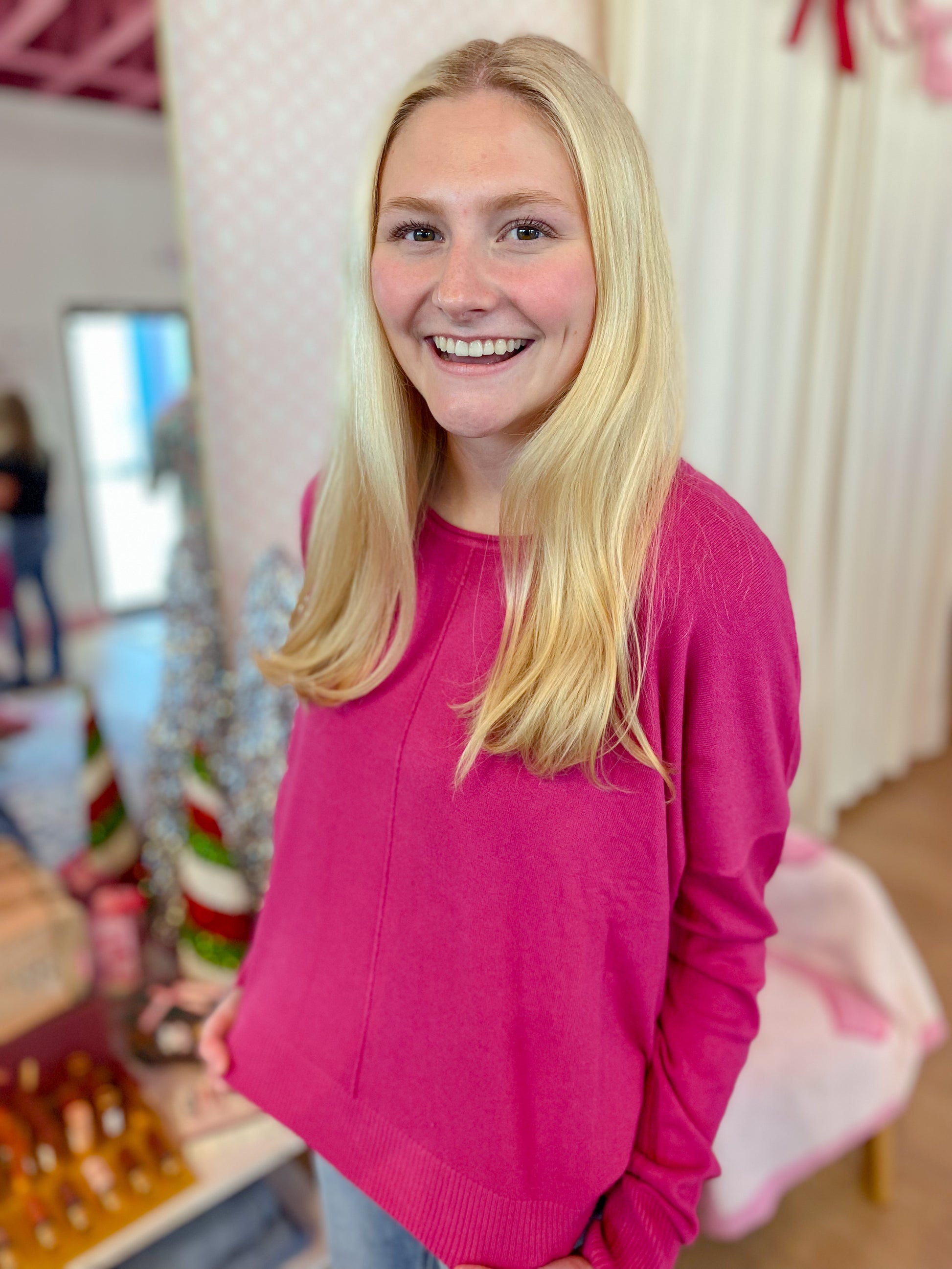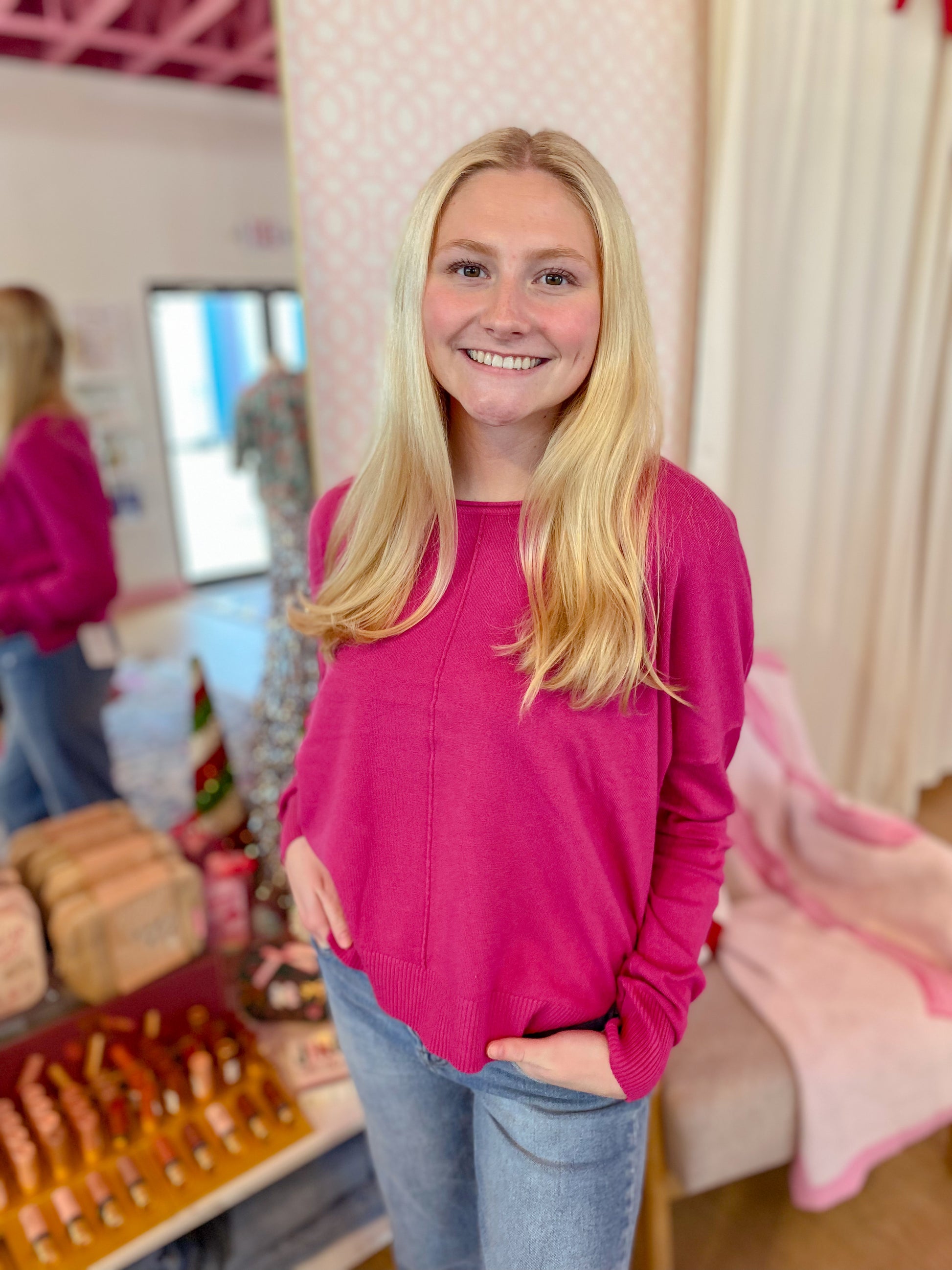 The Leave With Somebody sweater in Viva Magenta is soft, lightweight, and perfect for any season. It has a round neckline, long sleeves, ribbed edges, and a fun split hem with outseam detail. Cozy and playful, it’s a great choice for layering or wearing on its own!
