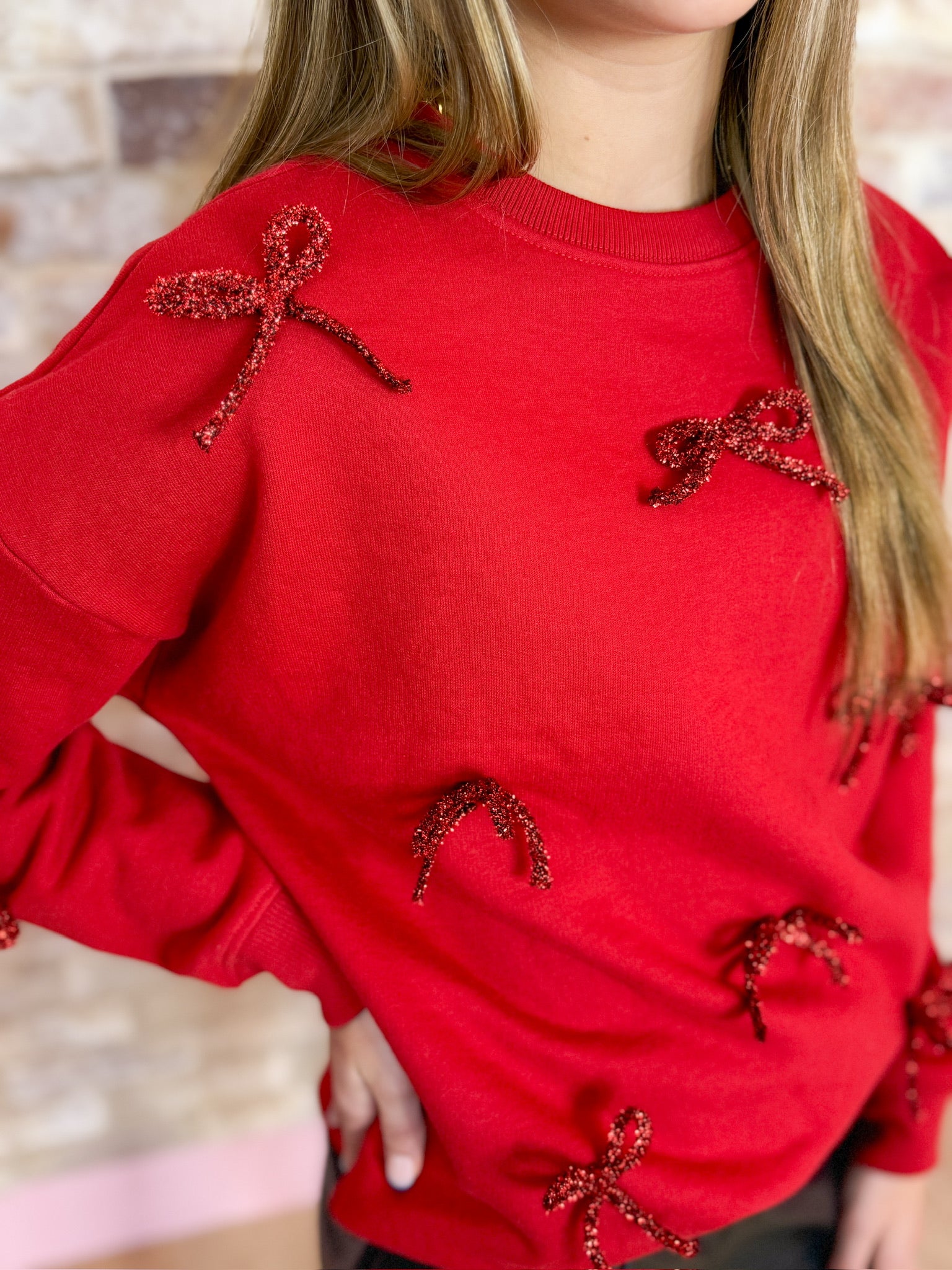 Cozy up your little one in the Little Luxies Bows Crewneck, a red fleece sweatshirt sprinkled with charming tinsel bow appliques all over. Soft and warm, it’s perfect for playful days and festive fun, adding a twinkle of joy to any outfit!