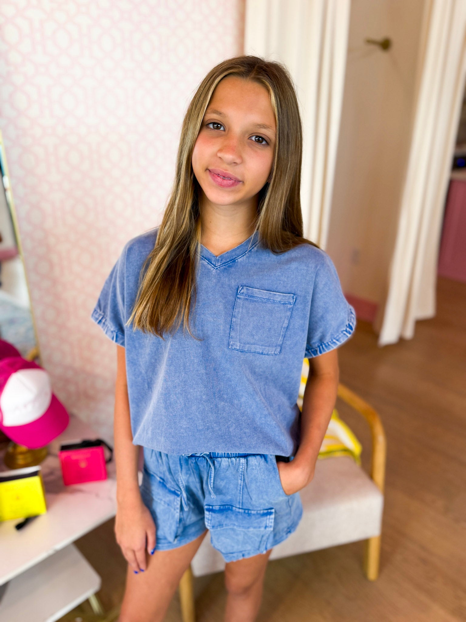These blue Girls Garment Washed Cargo Patch Pocket Knit Shorts are made from soft knit fabric for all-day comfort. Featuring a playful tie front closure and an elastic waist, they offer a perfect fit and easy movement. Ideal for little ones who love pockets and a relaxed, fun style!