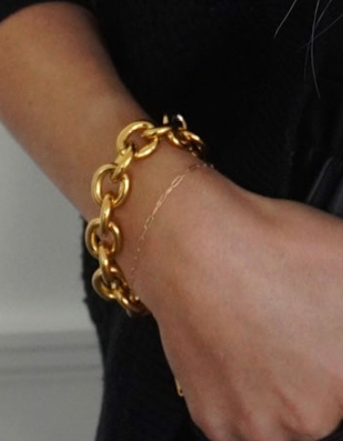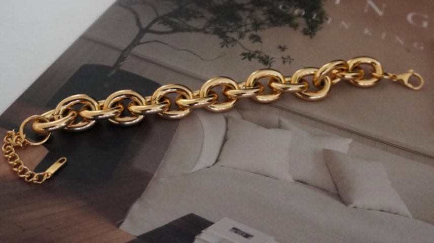 Introducing the Liv Bracelet, made from 18k gold plated stainless steel. This stylish chunky gold bracelet is water resistant and comes with a lifetime warranty. Perfect for everyday wear, the bracelet measures 7-9 inches and adds a touch of elegance to any outfit.