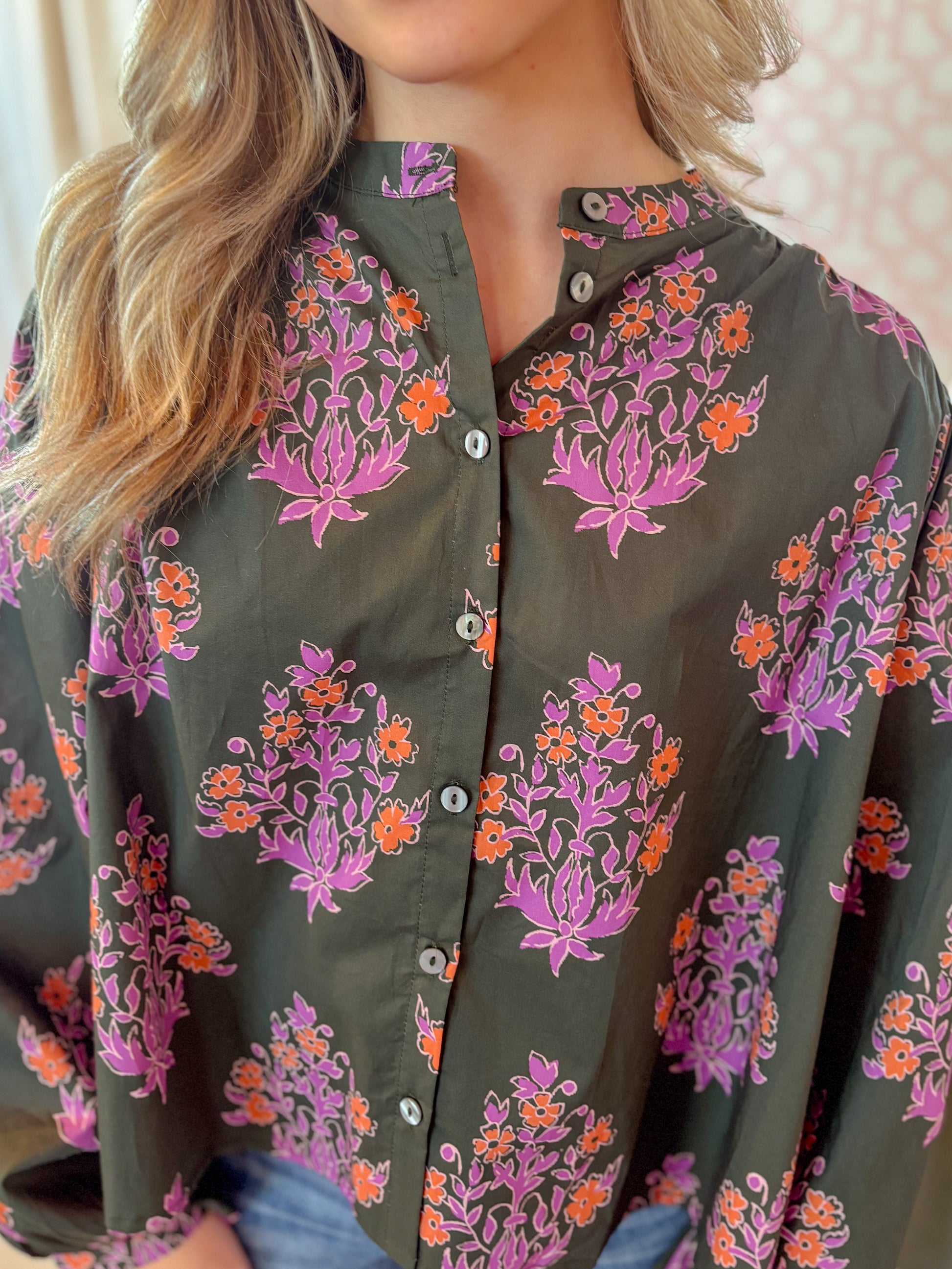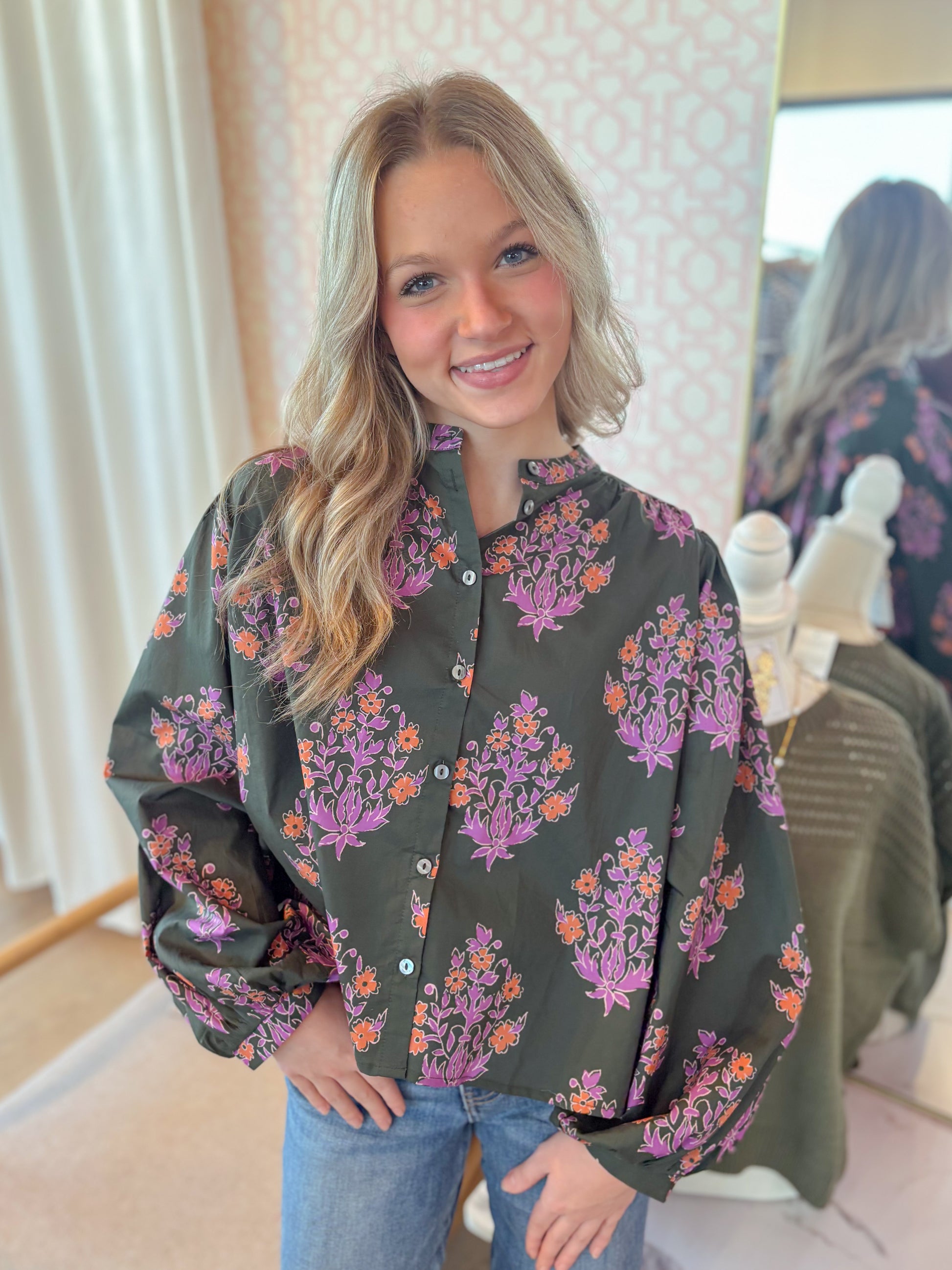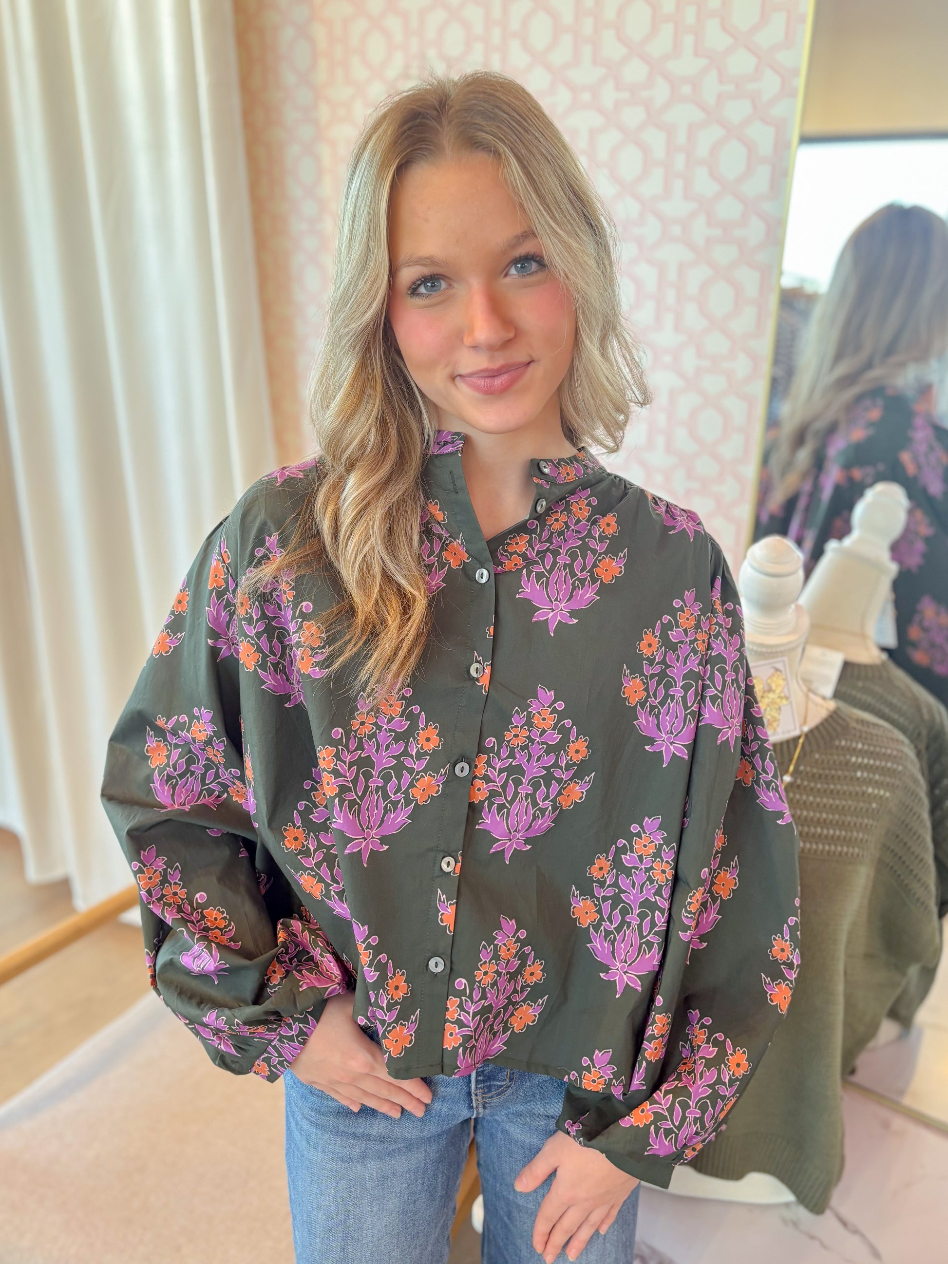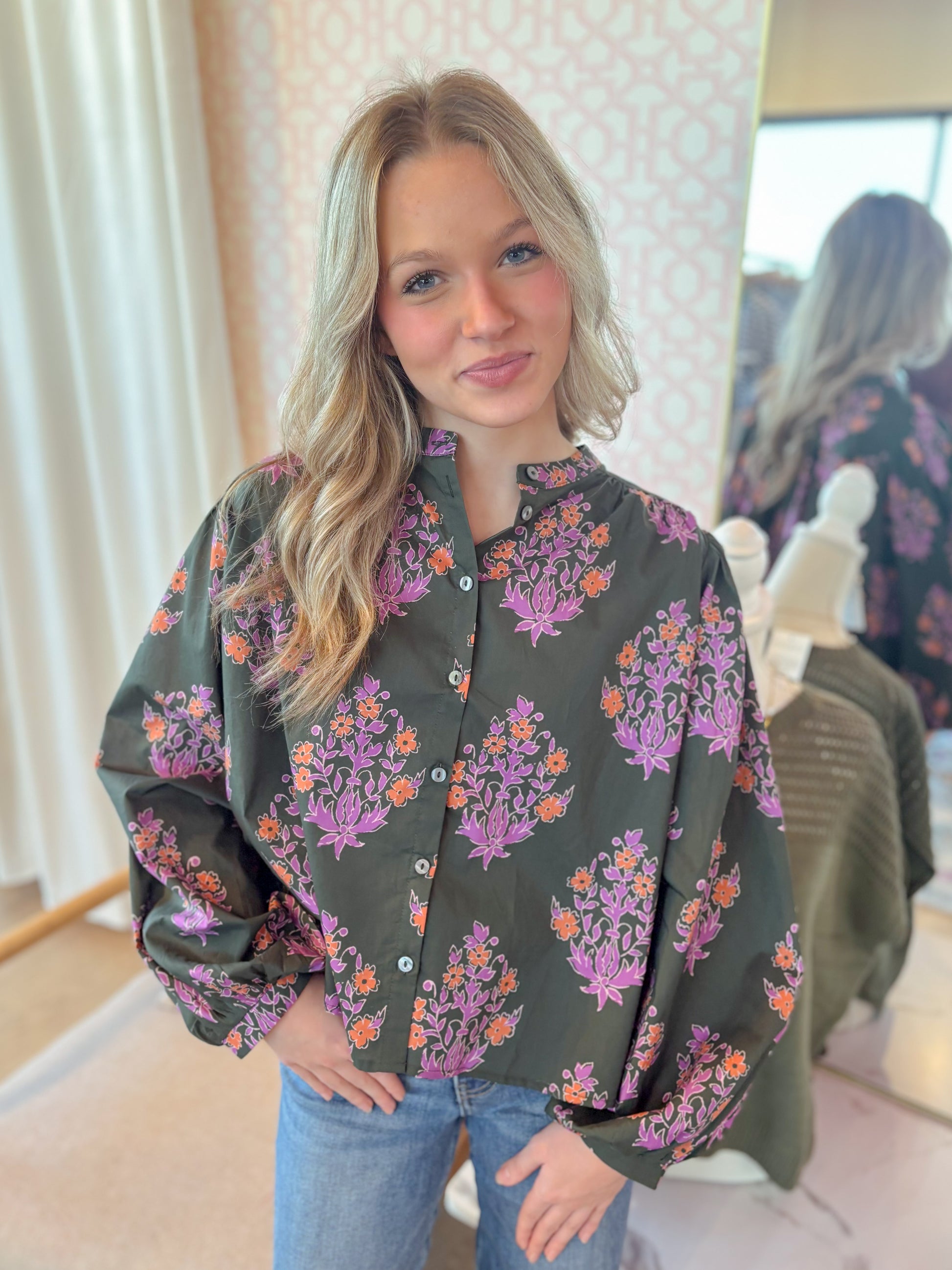 This dark olive floral print top brings playful charm with its long puff sleeves and delicate band collar. The elasticated cuffs add a comfy, snug fit while the button-front closure offers easy wear. Light and unlined, it’s perfect for adding a whimsical touch to your everyday look.