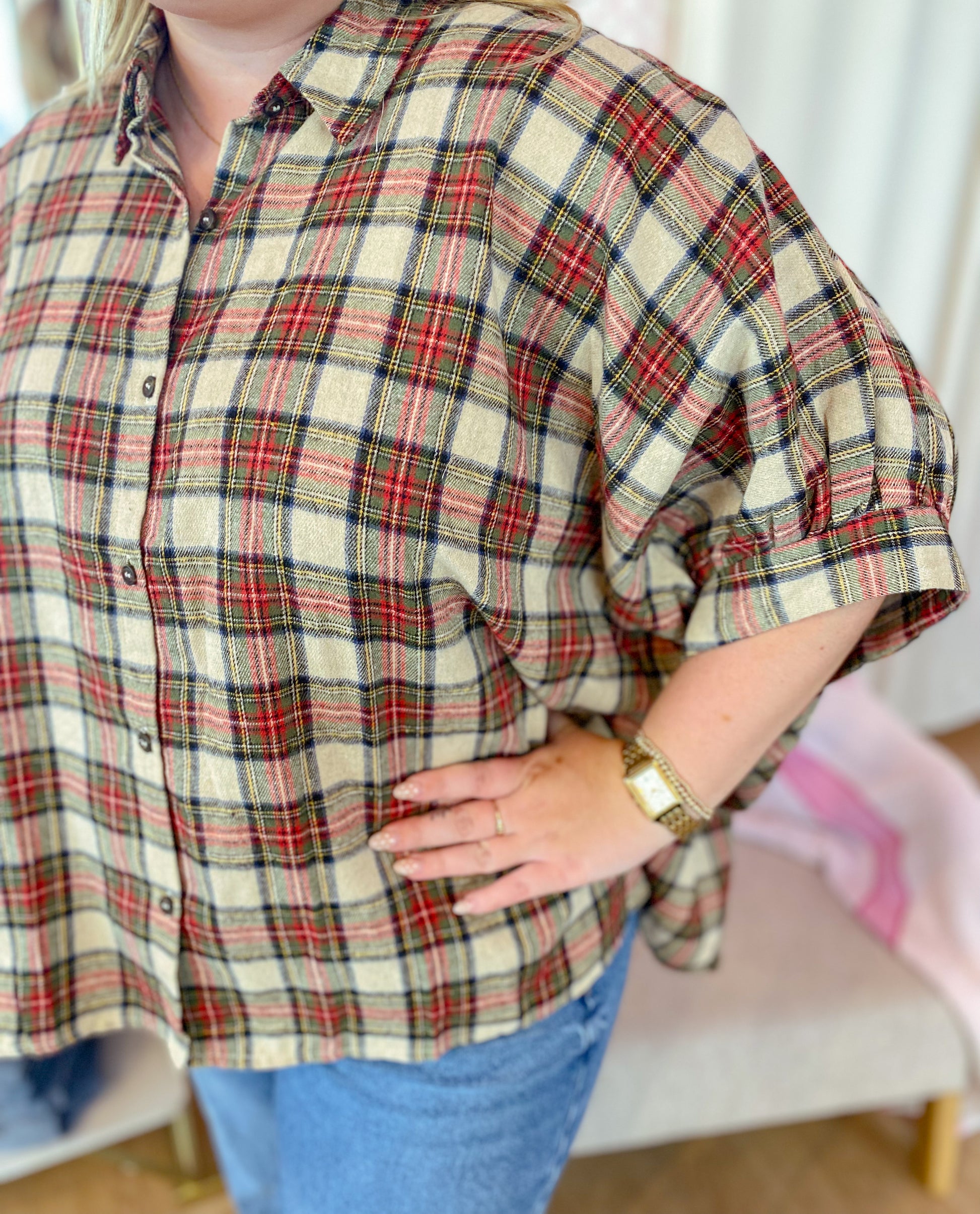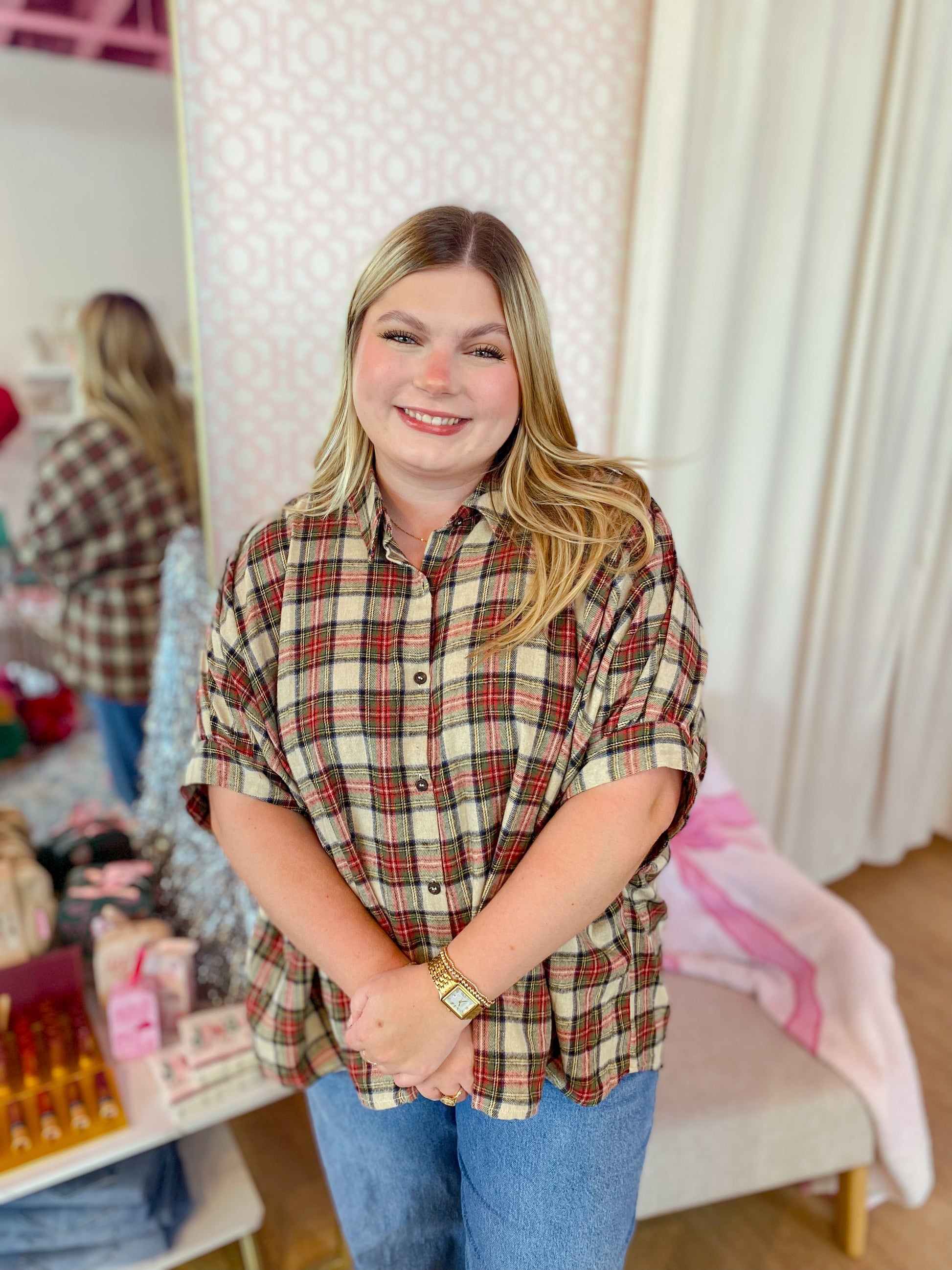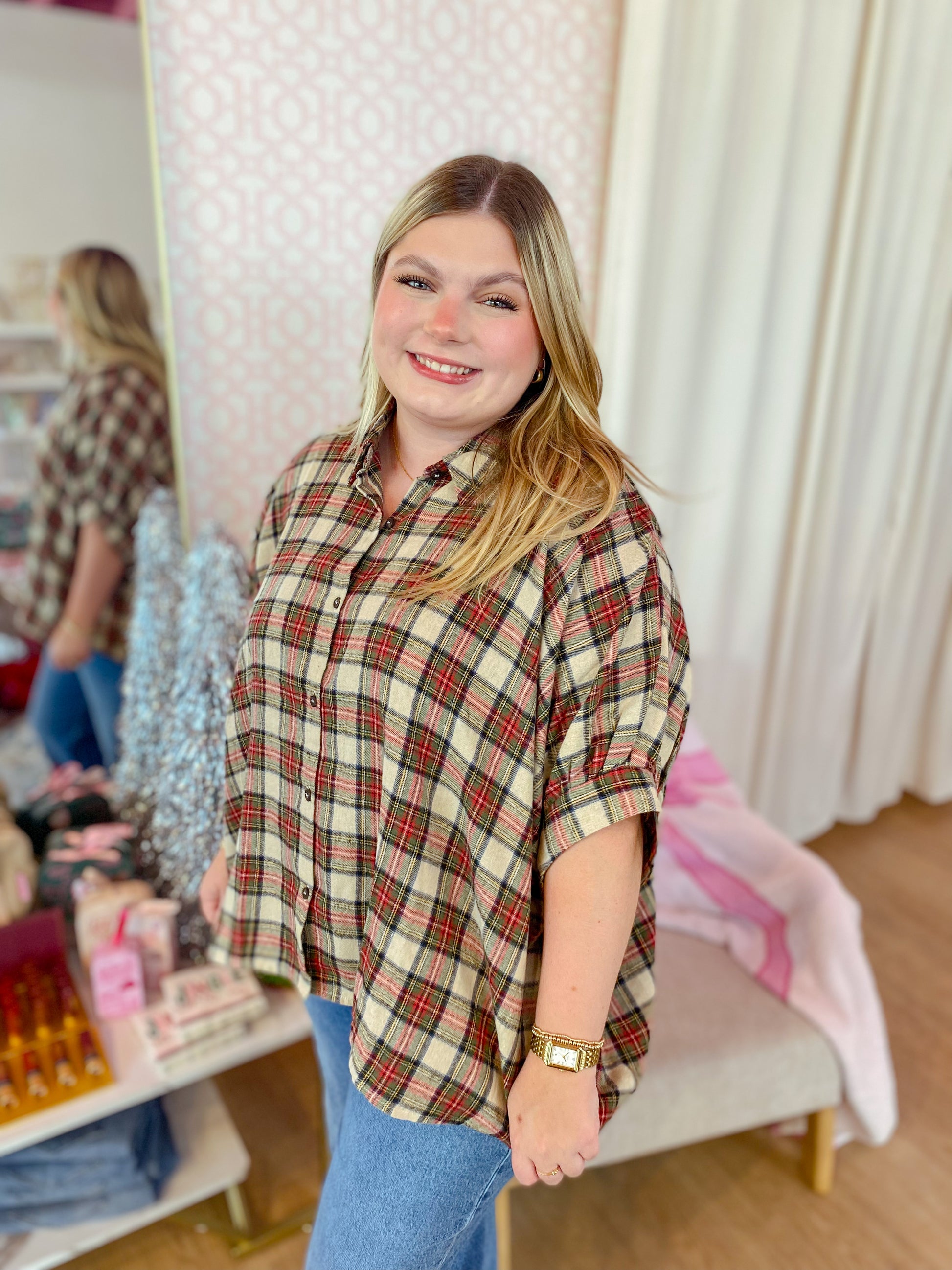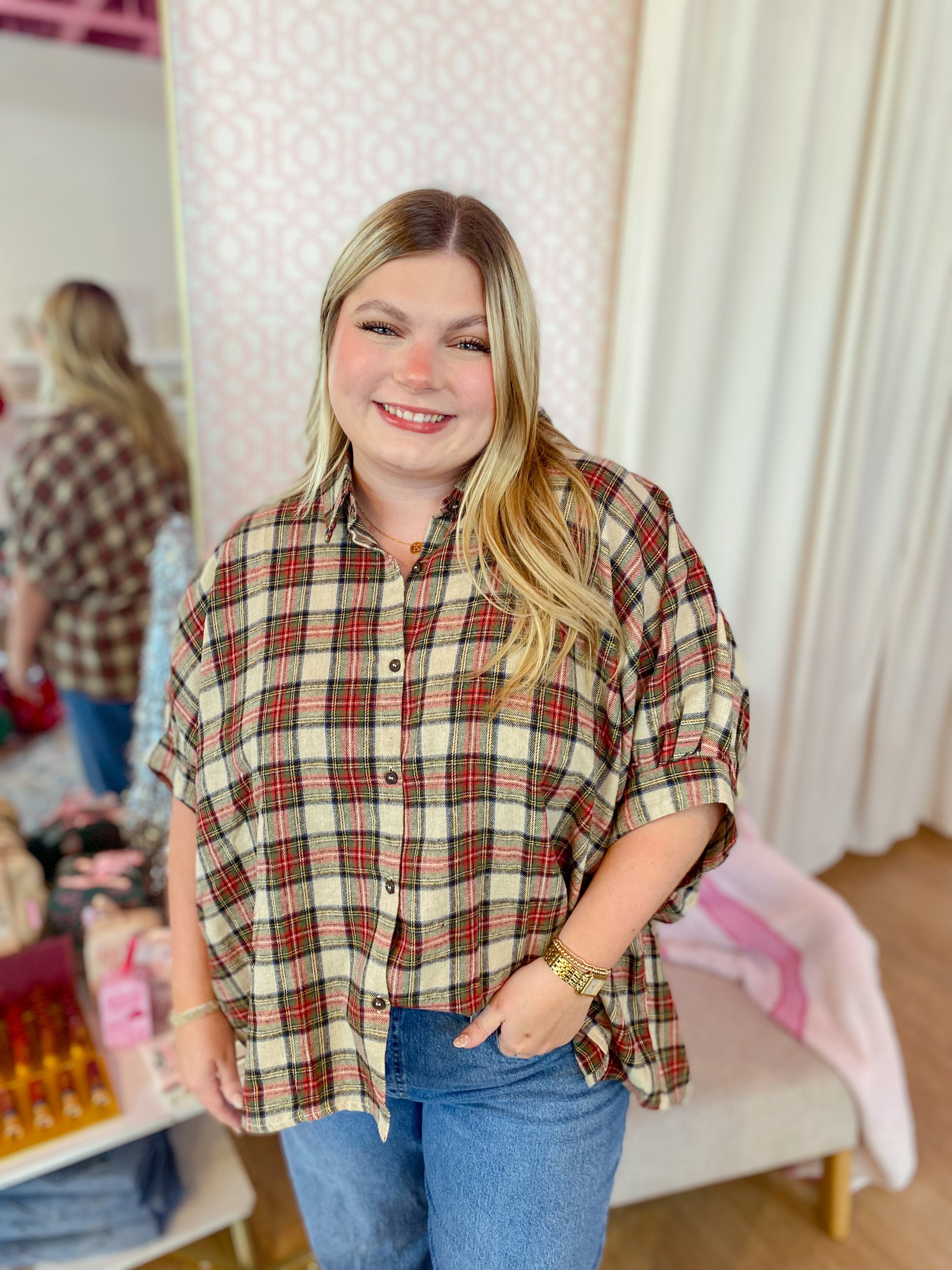 Bring festive cheer to your wardrobe with this tan multi-colored oversized button-down Christmas plaid shirt. Its roomy fit ensures cozy comfort, while the vibrant plaid colors add a playful holiday vibe. Perfect for layering or wearing solo, it’s a fun and easy way to make a statement at any seasonal gathering!