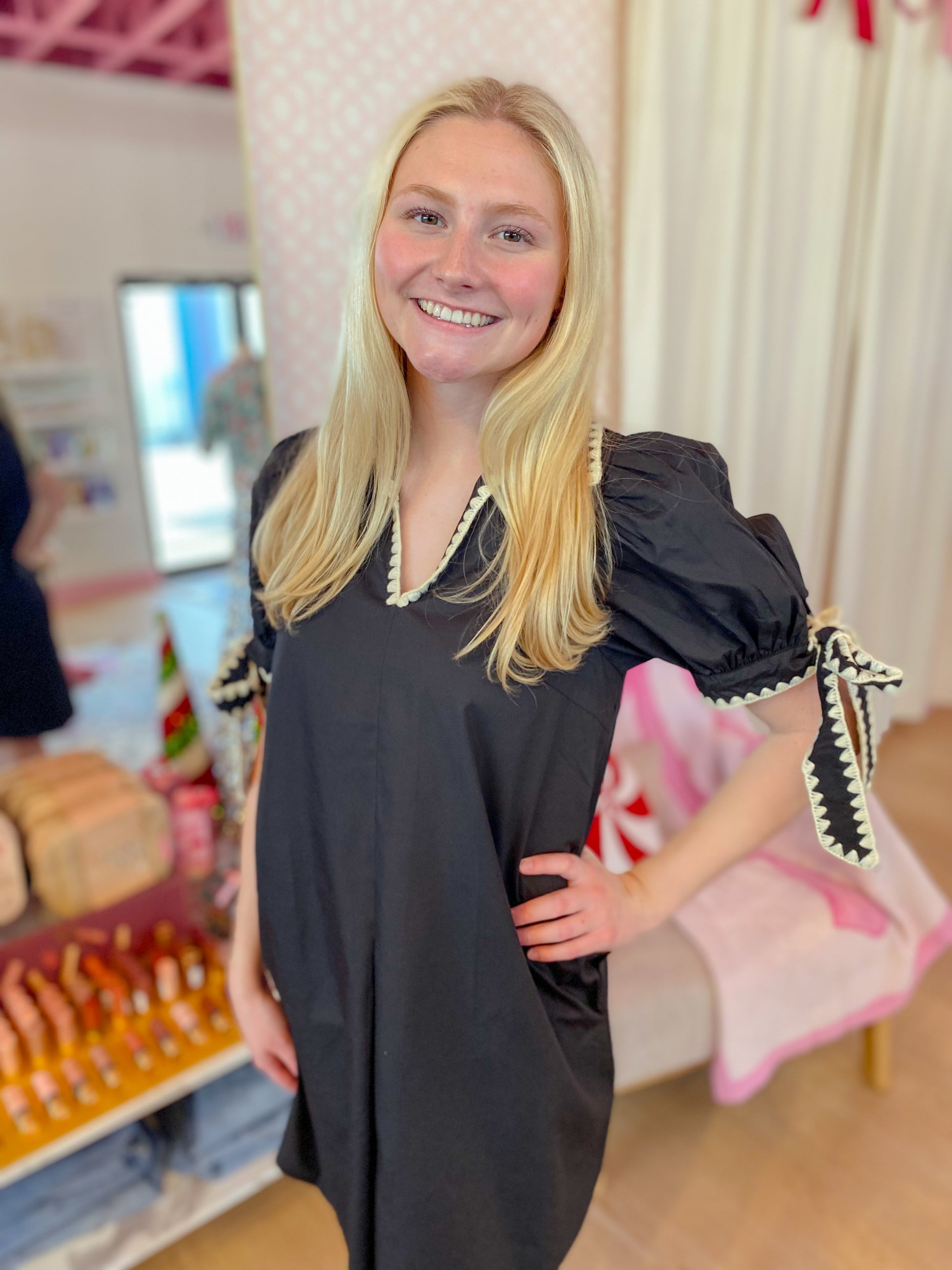 The Need Me Now Dress is a fun mini with puff sleeves, a V-neck collar with scallop trim, and tie cuffs. It has handy side pockets and is fully lined for comfort!