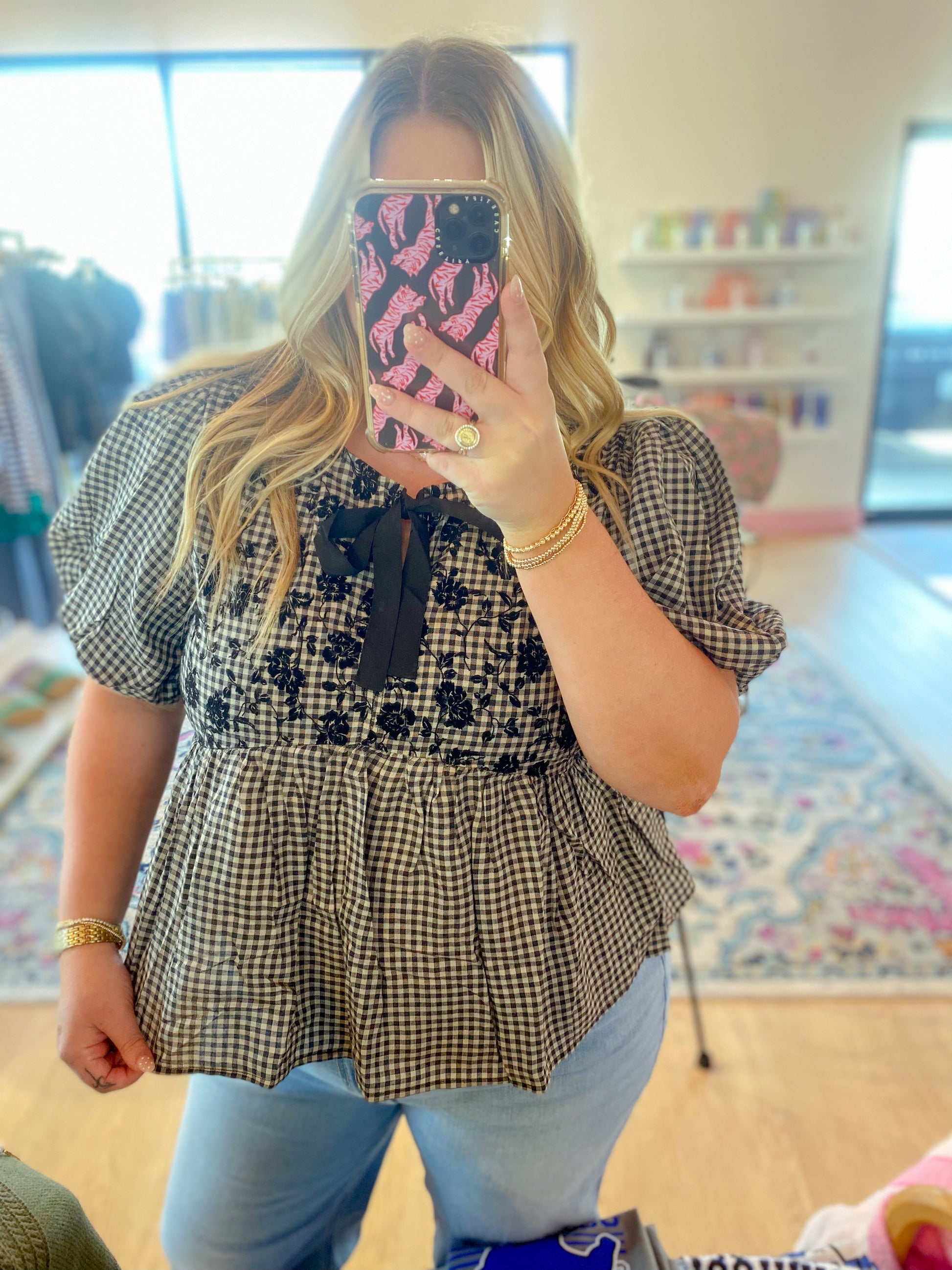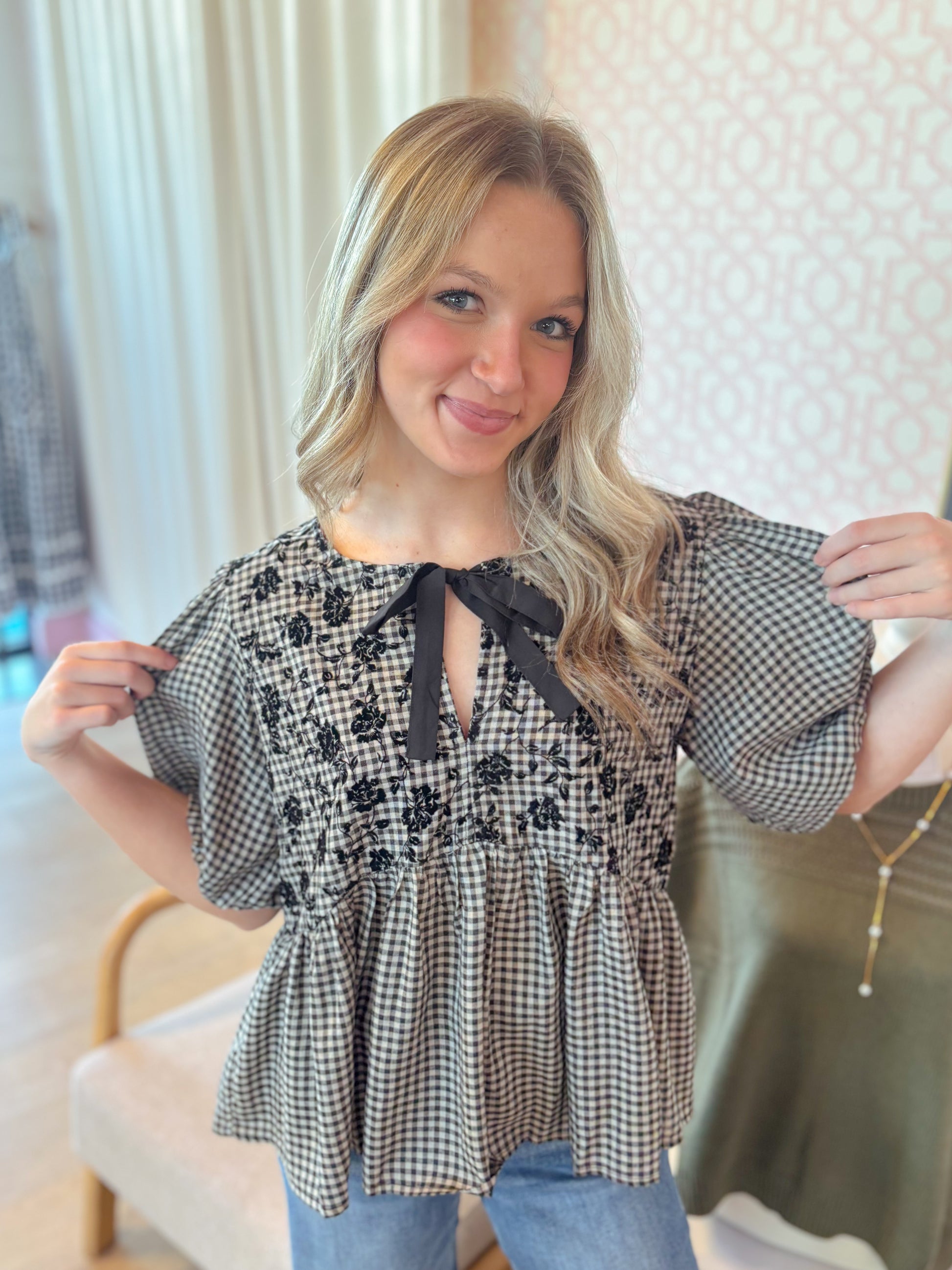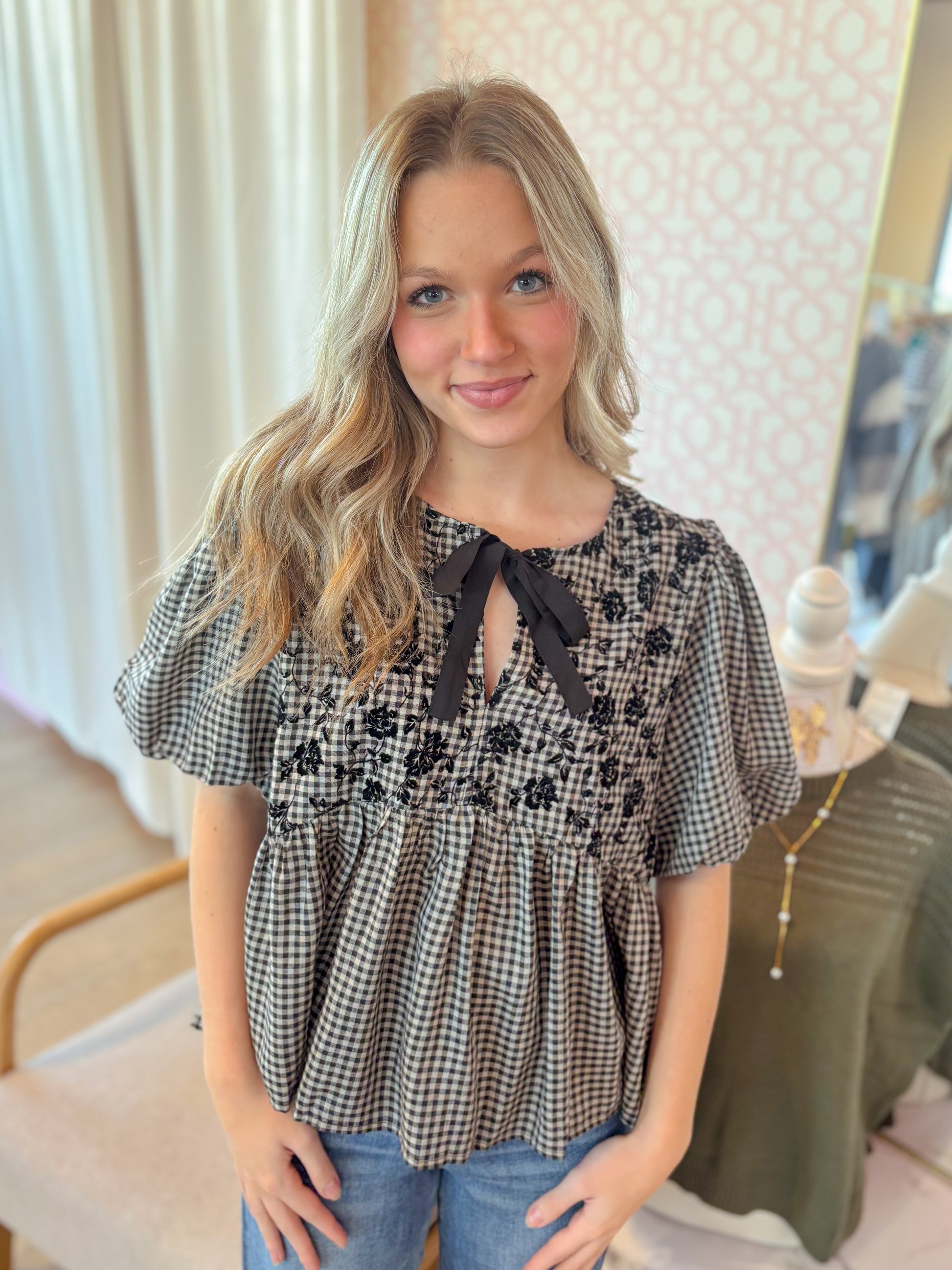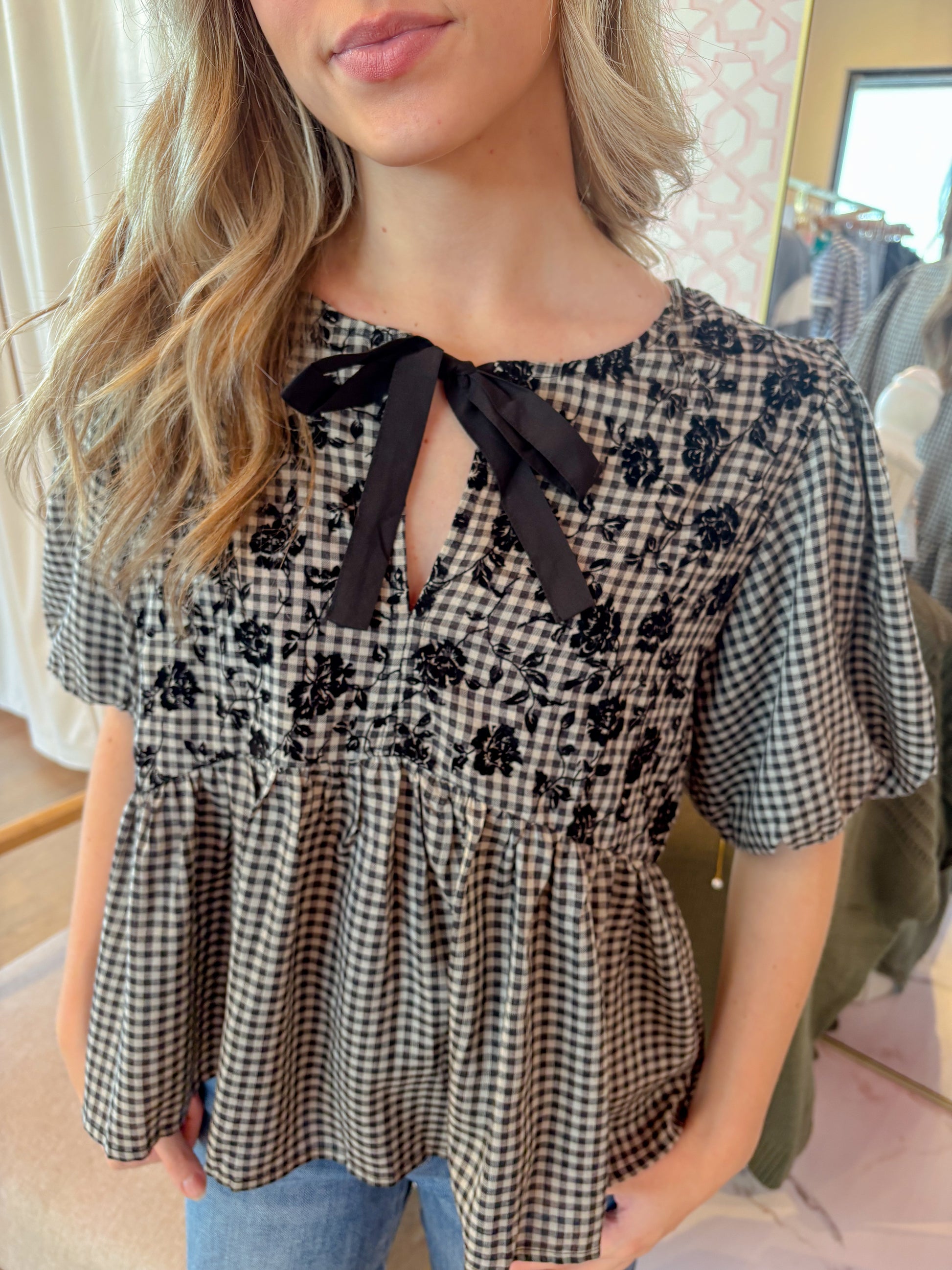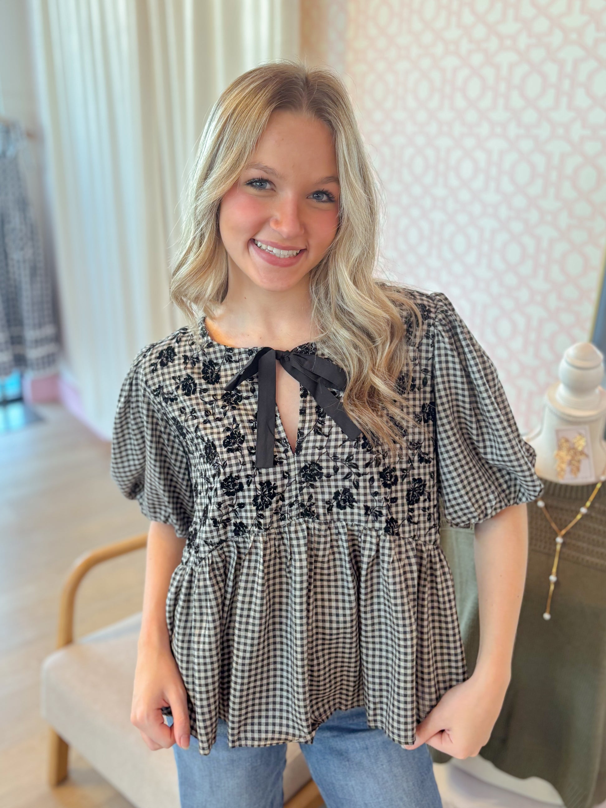 This playful black gingham puff short sleeve top features a charming front bow tie and delicate flock printing for a textured, stylish look. Its woven fabric offers a comfortable, breezy fit, making it perfect for adding a flirty, fun touch to your outfit with a playful baby doll silhouette.
