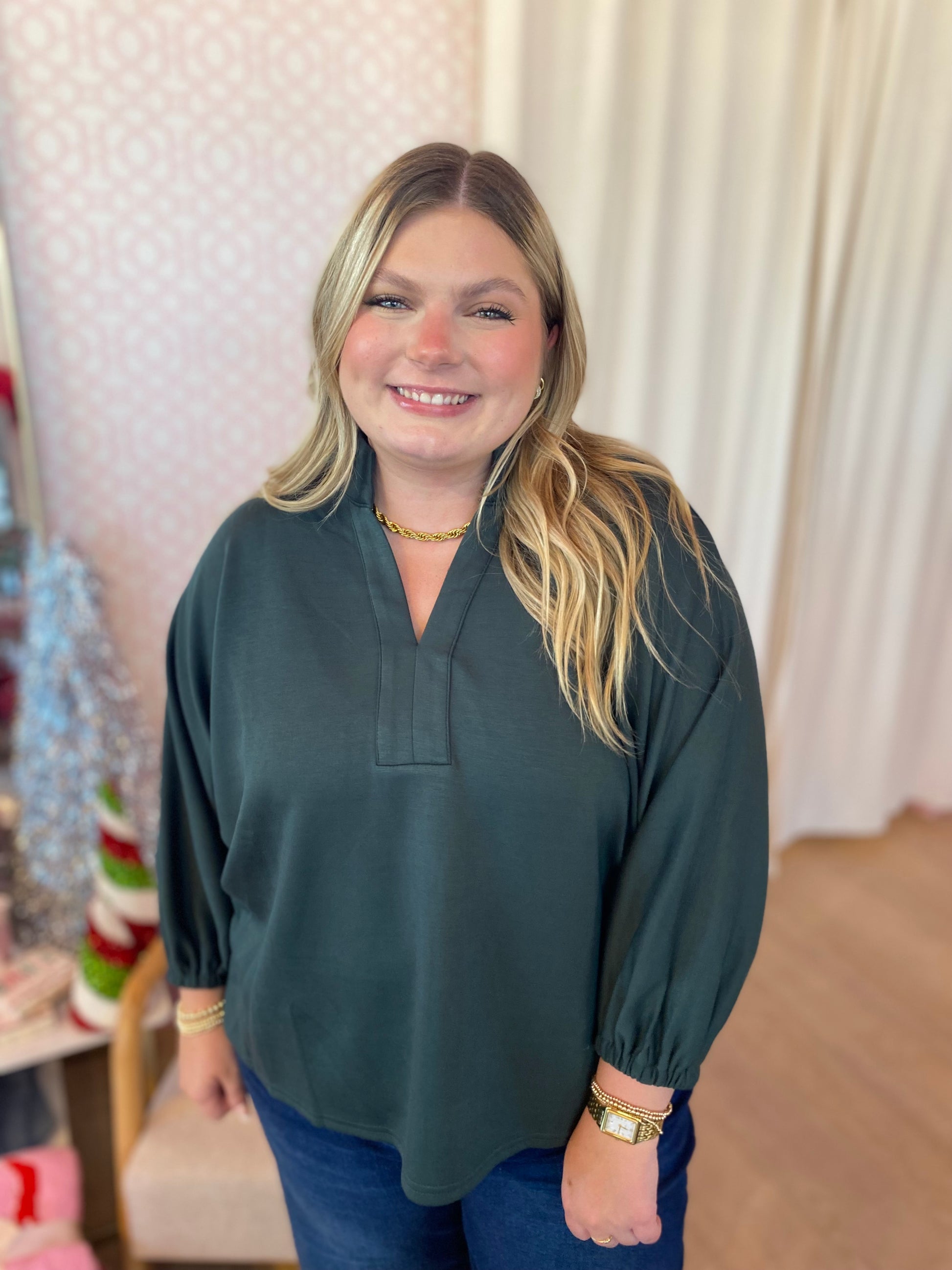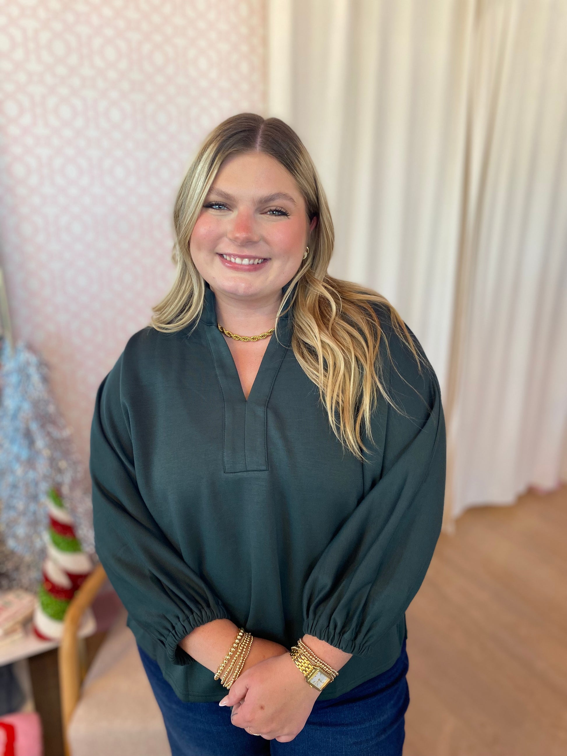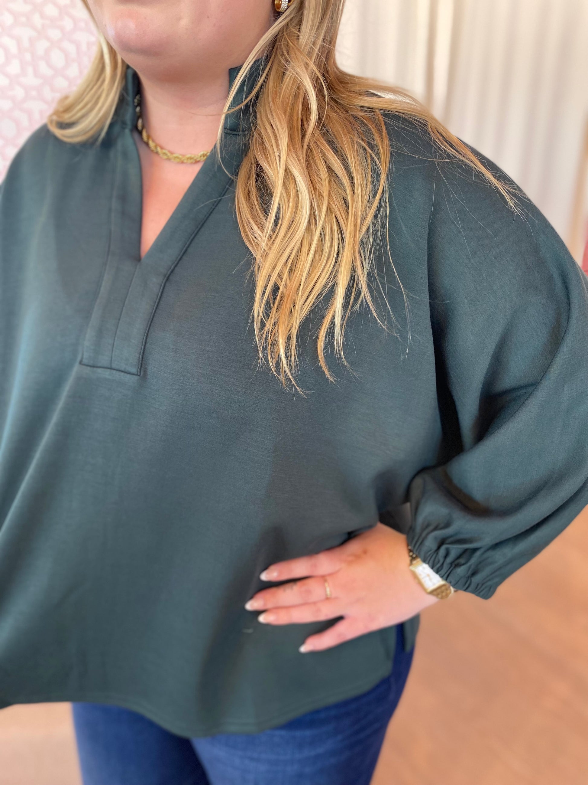 Love this soft forest green 3/4 sleeve top! It's perfect for layering through cooler months! The buttery fabric feels amazing against your skin, while the relaxed fit keeps you comfortable all day long.