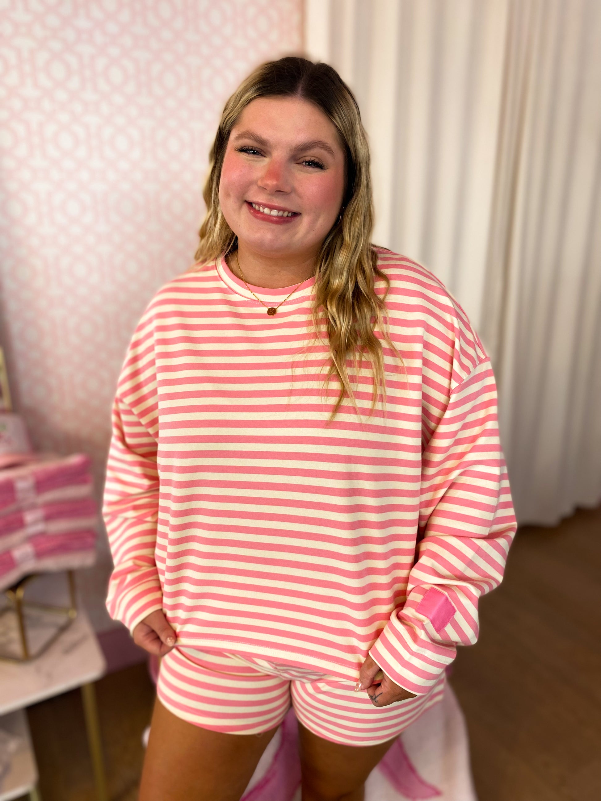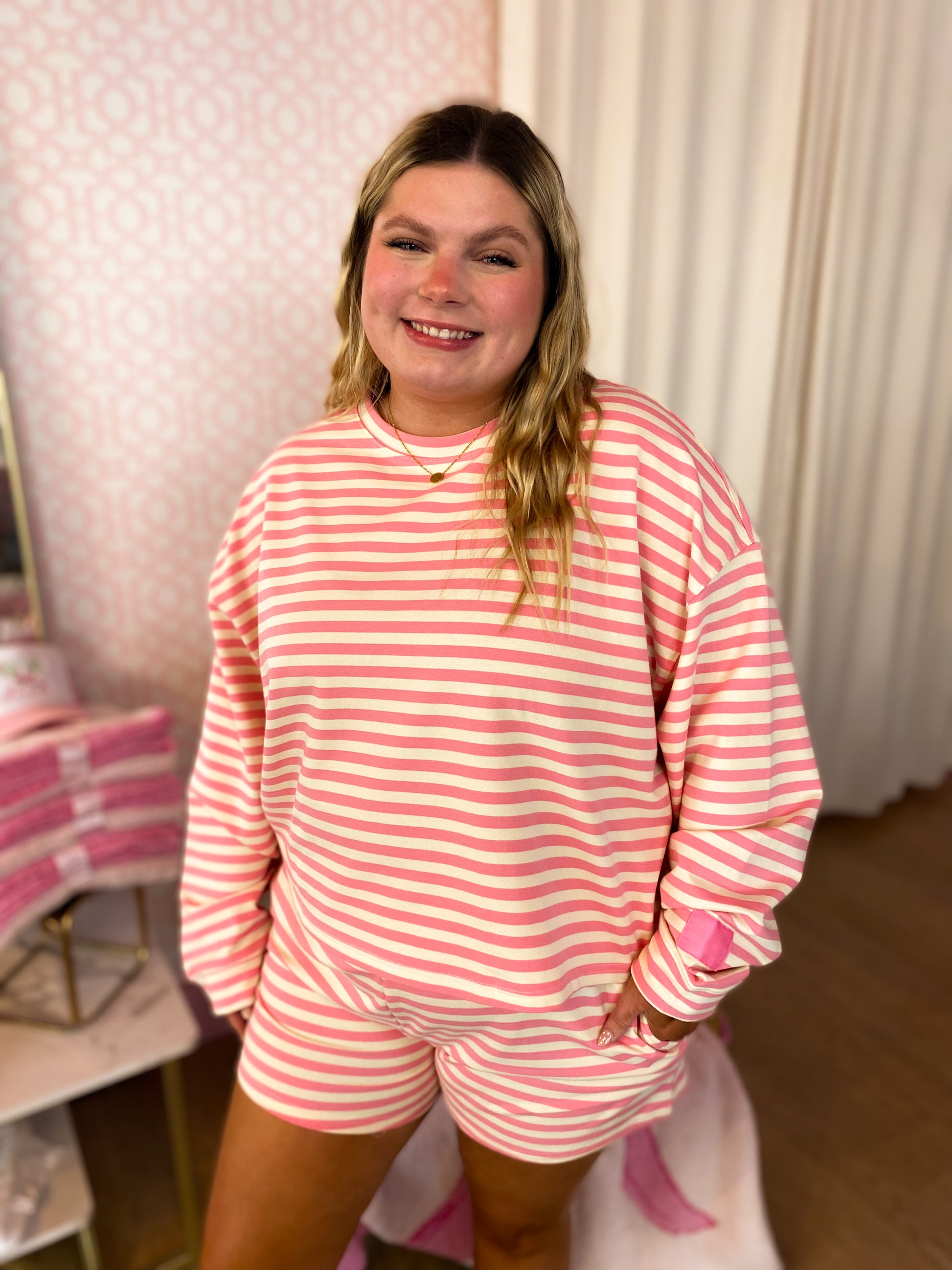 The Playing Sides Set is a comfy pink and cream striped sweatshirt and shorts with a loose fit and elastic waist—perfect for relaxed, playful days!