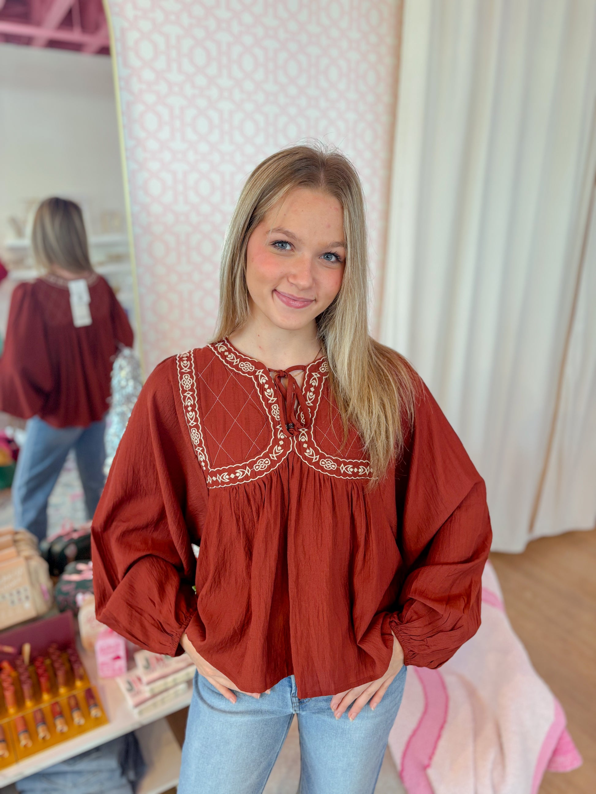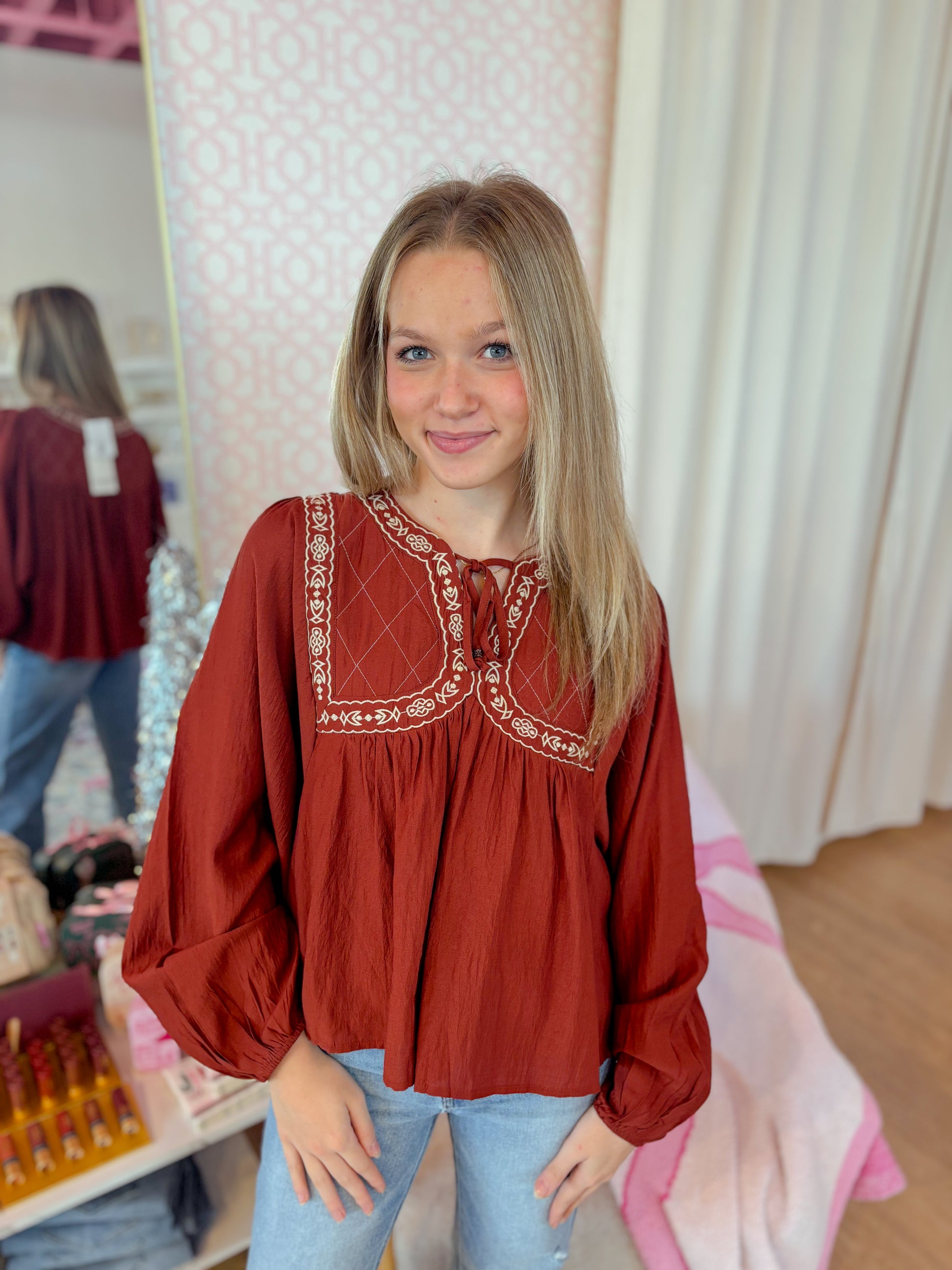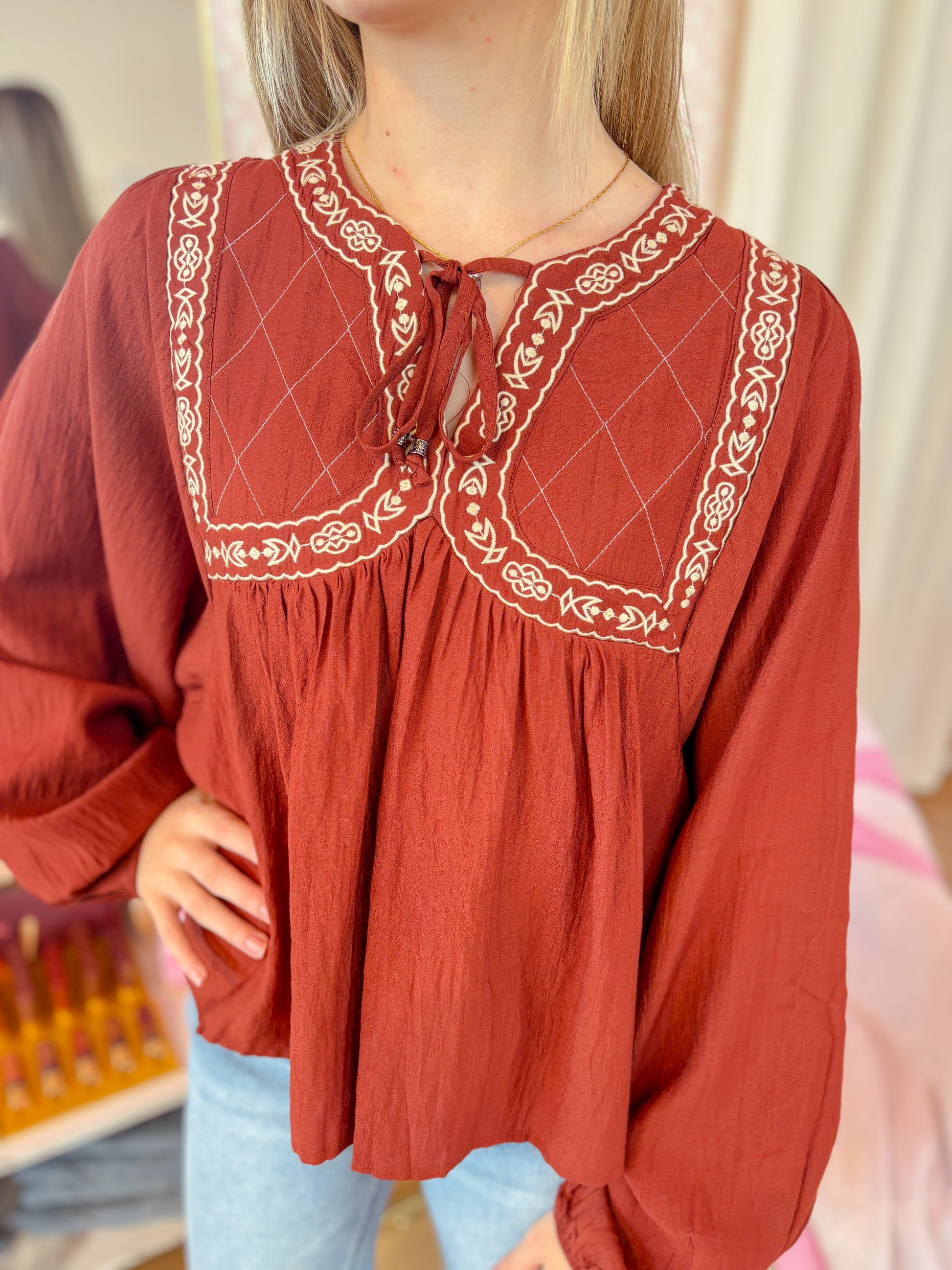 This brick-colored blouse has fun embroidered quilted yokes, a notched V neckline with ties, and long balloon sleeves with elastic cuffs. Its loose babydoll shape and lining keep it comfy and cute for any casual day!