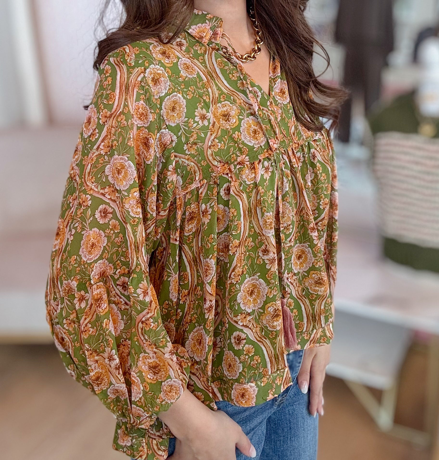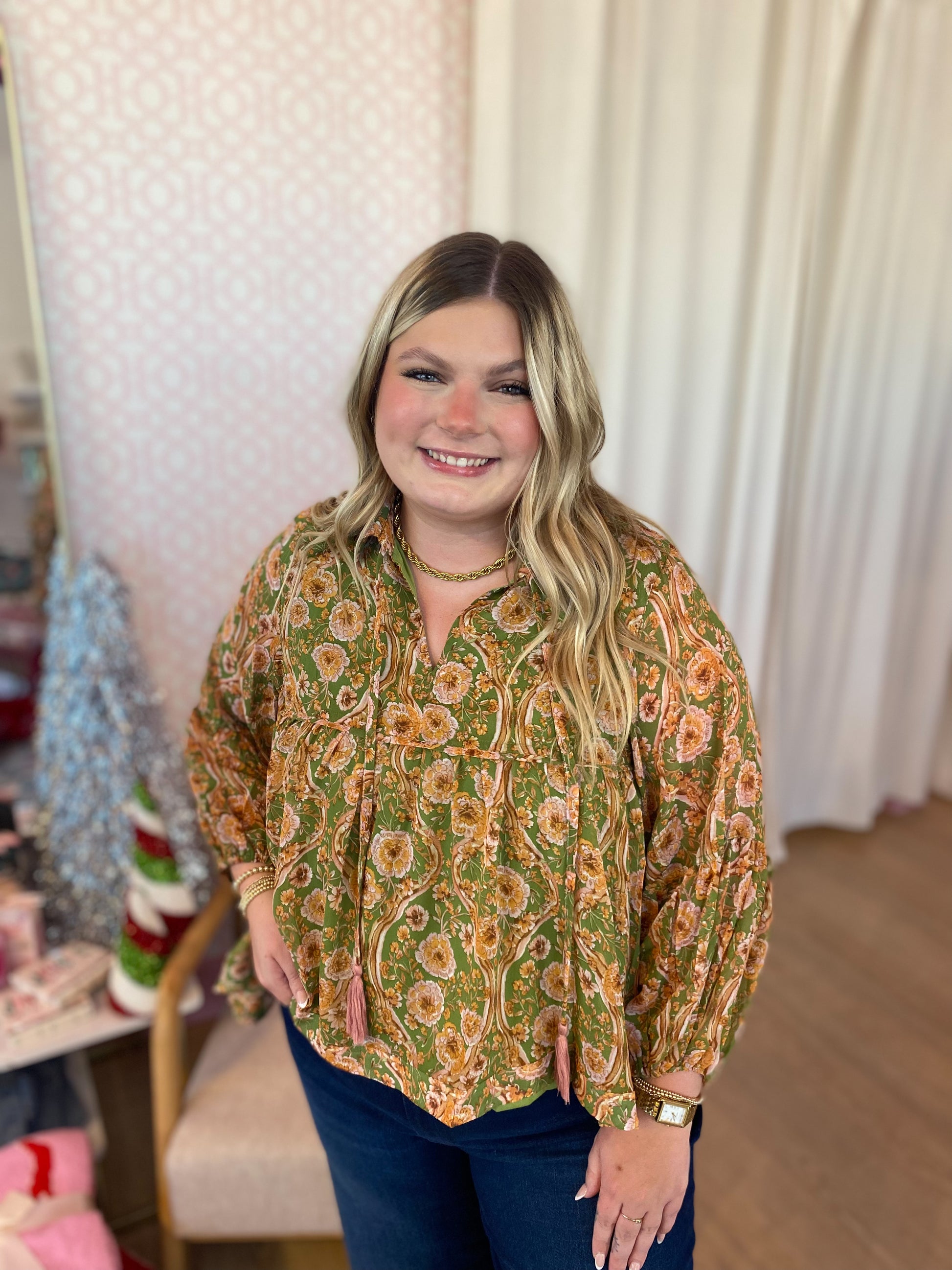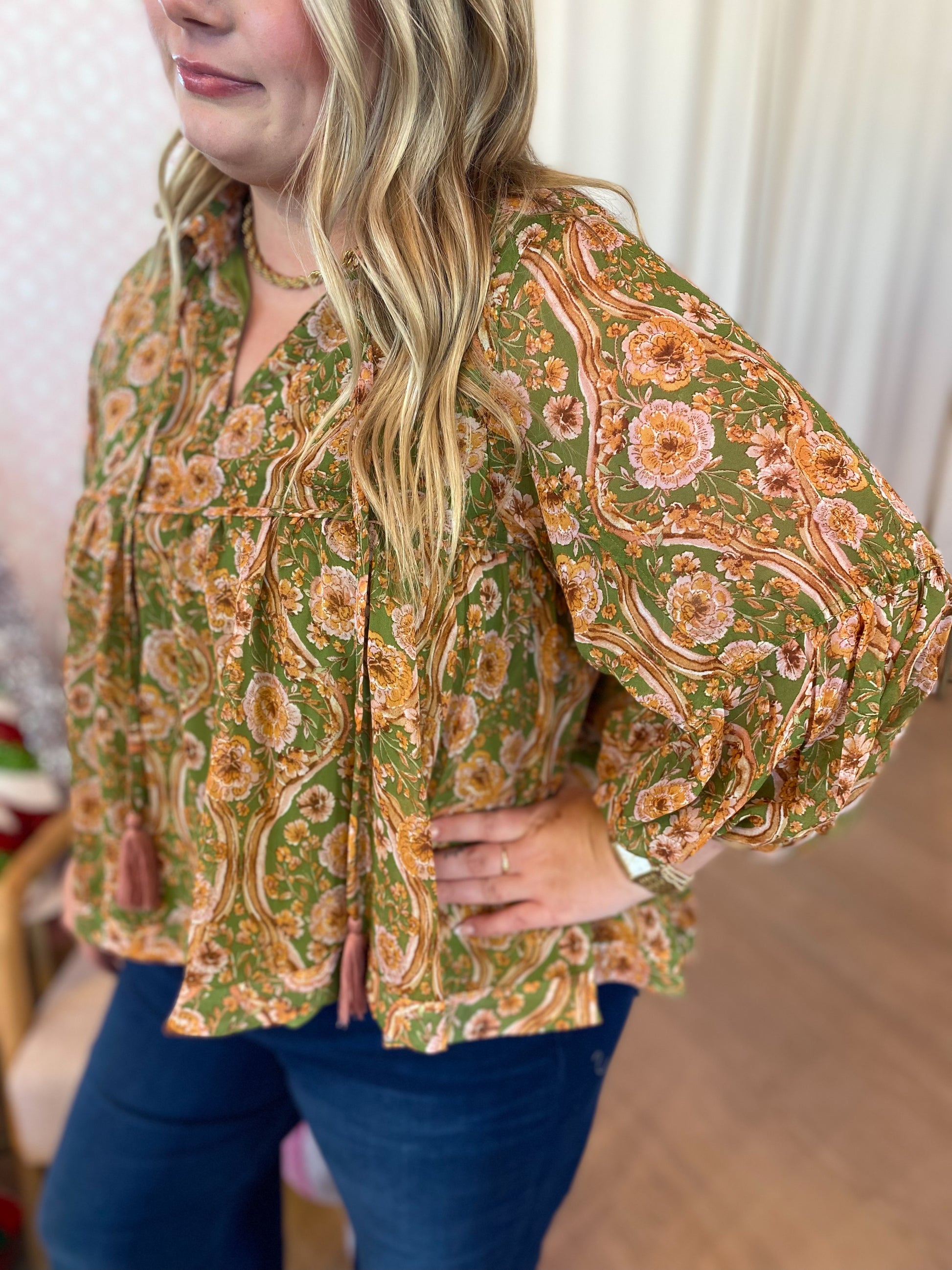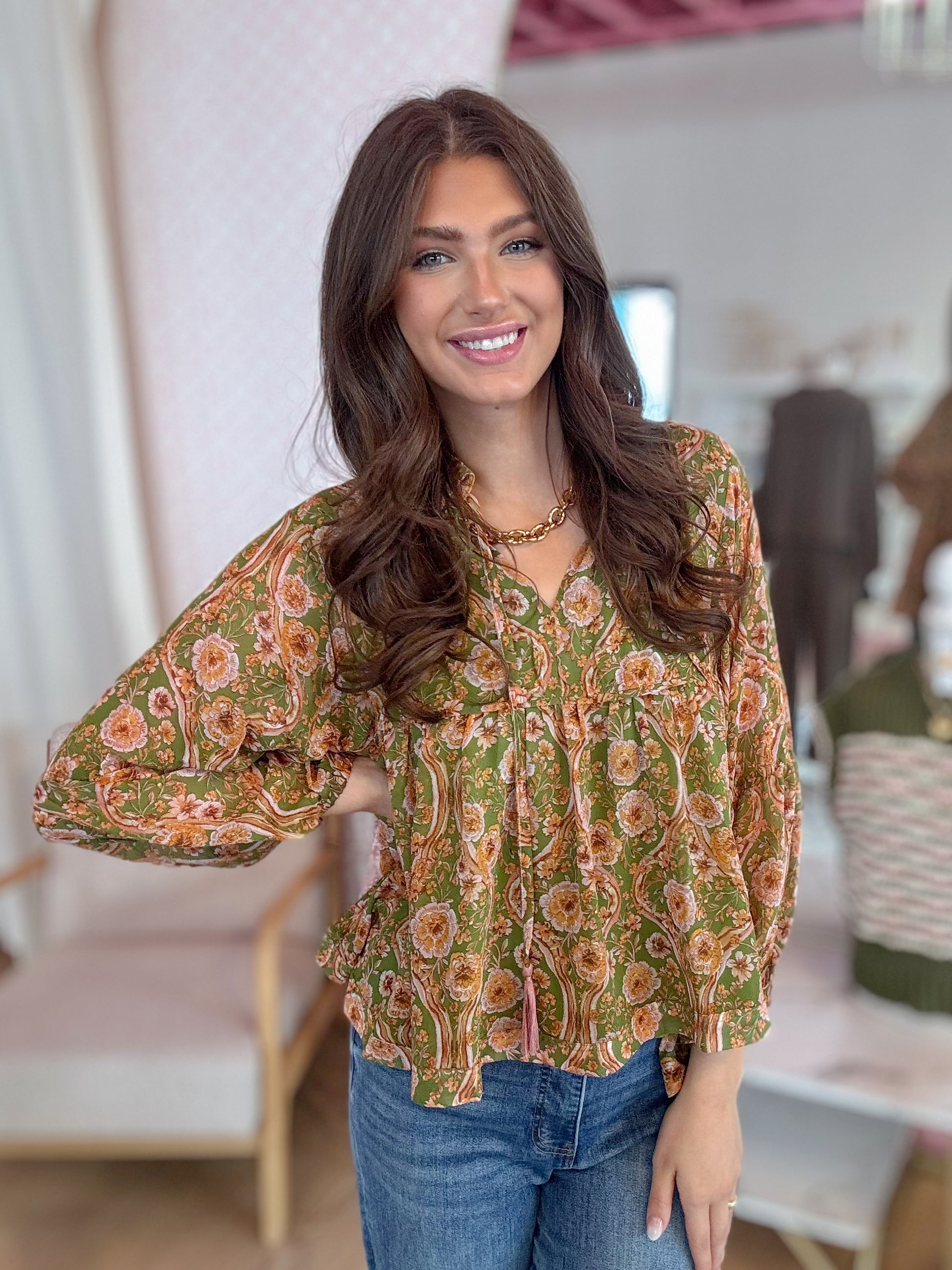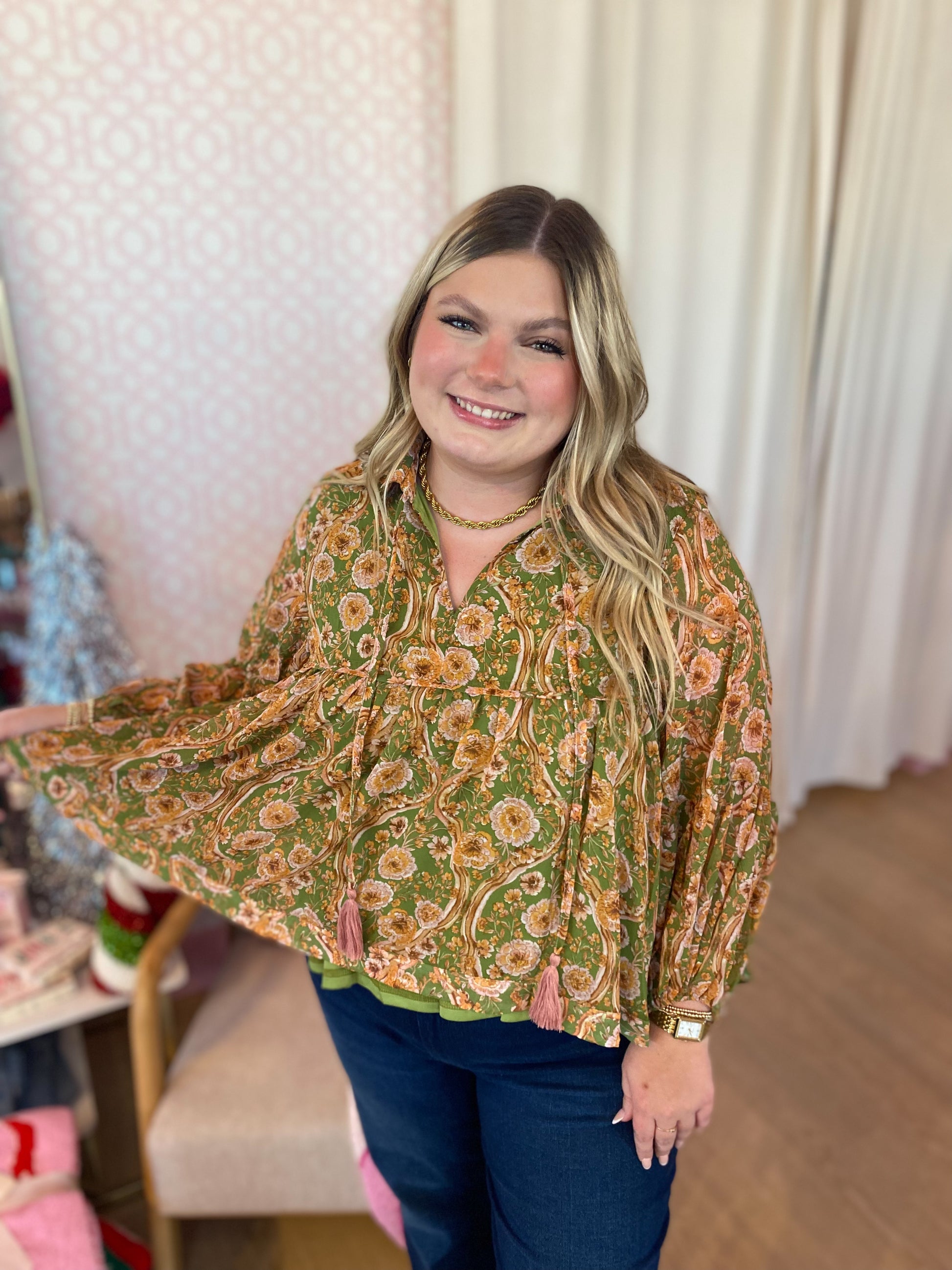 The Rings A Bell babydoll top brings playful spring vibes with its olive floral print, tassel-tied V-neckline, and puffed sleeves. Its loose, lined fit keeps you comfy and stylish all day!