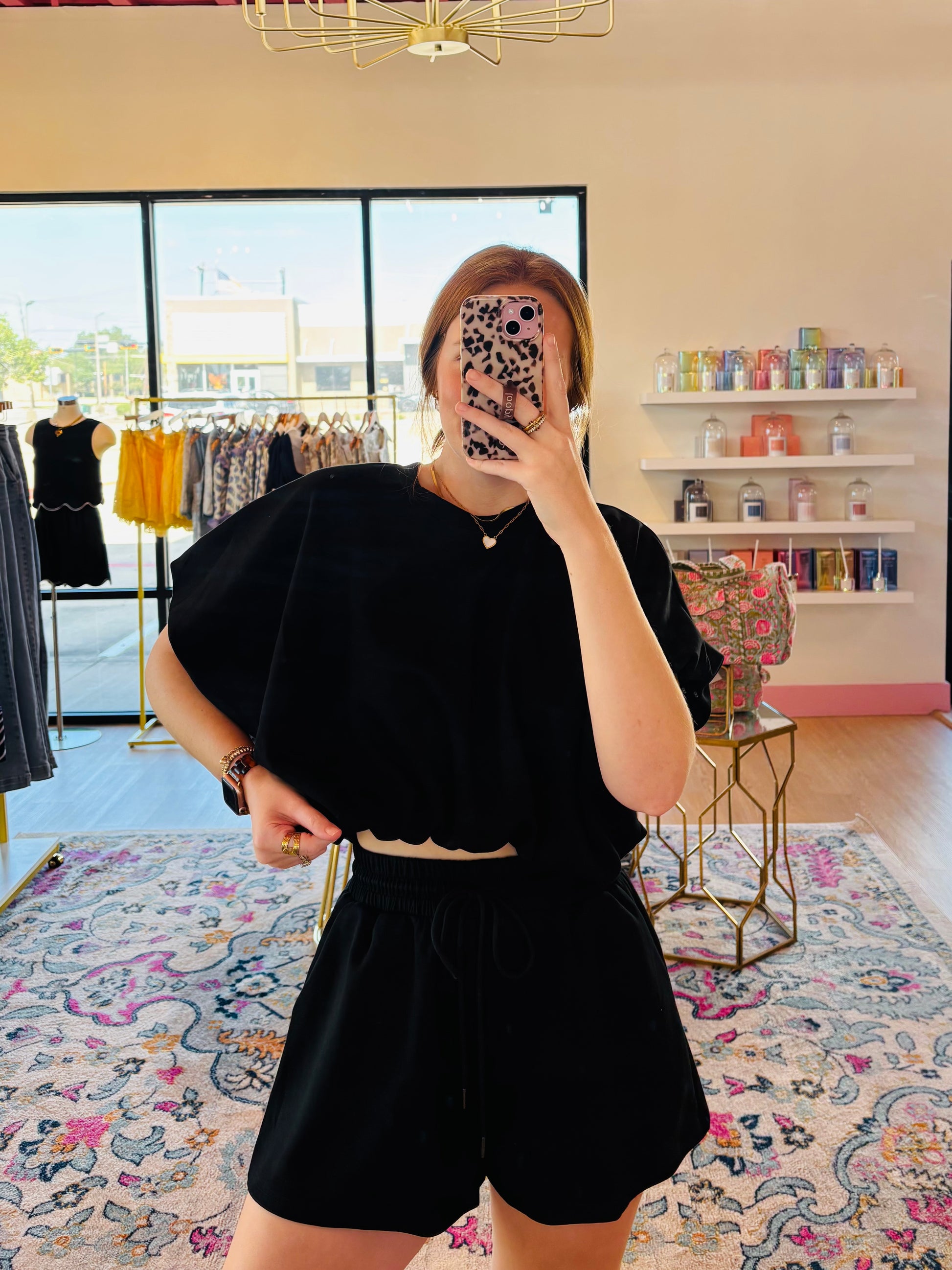 Get ready for an adventure with our Road Trip Ready Set. The solid jersey knit top features a playful bubble hem and the high waisted shorts have an elastic waistband for ultimate comfort. Pockets on the side add a fun touch, making this the perfect set for any quirky, fun-loving traveler.