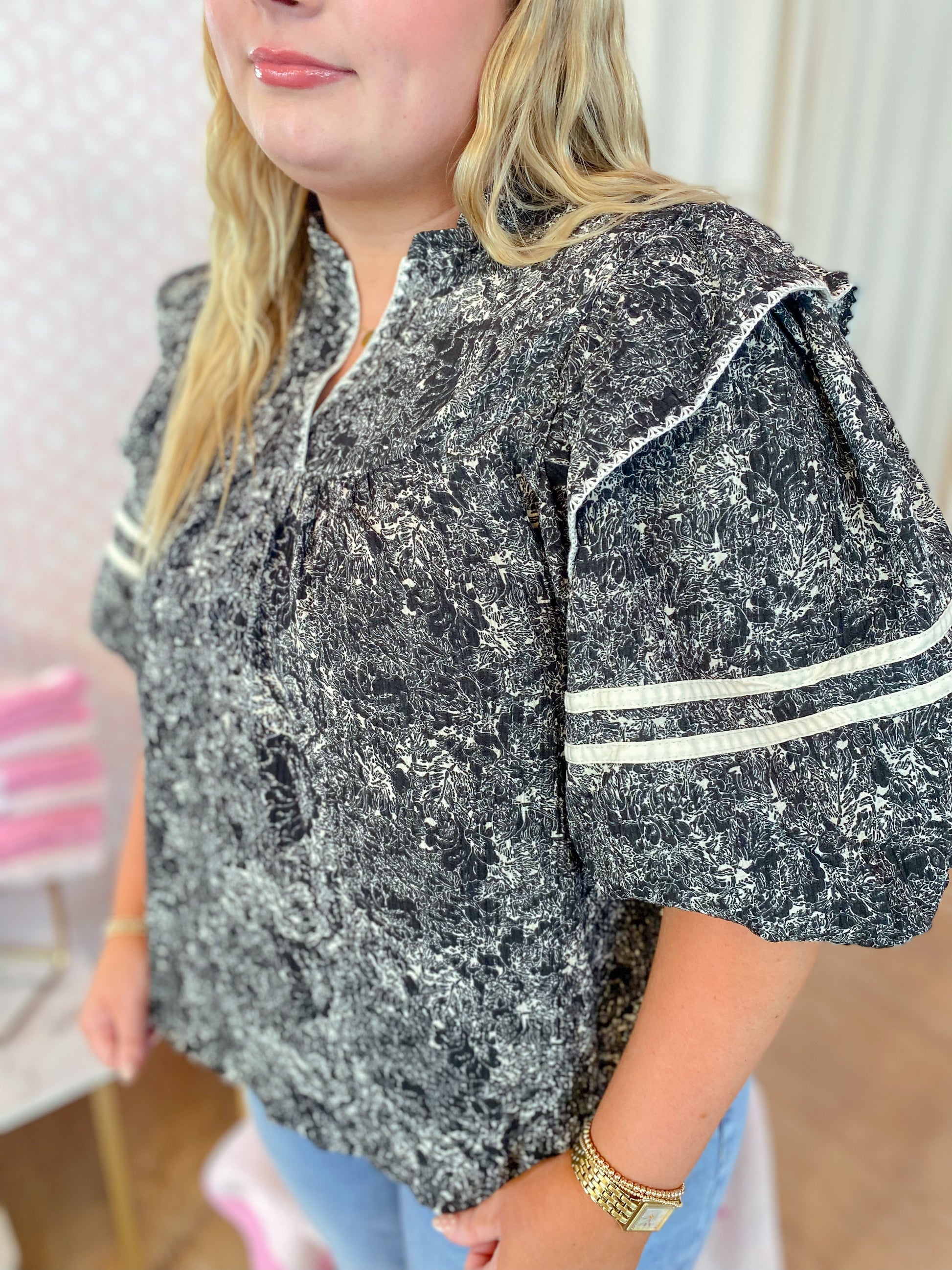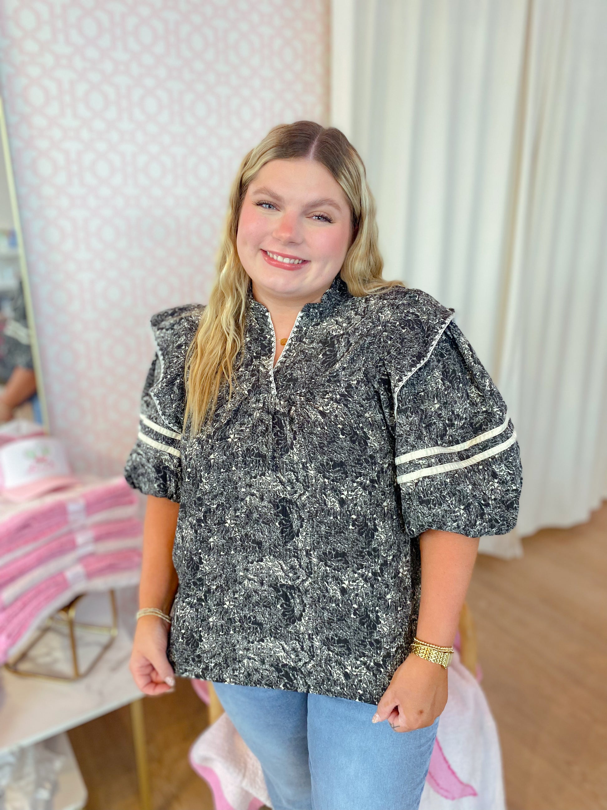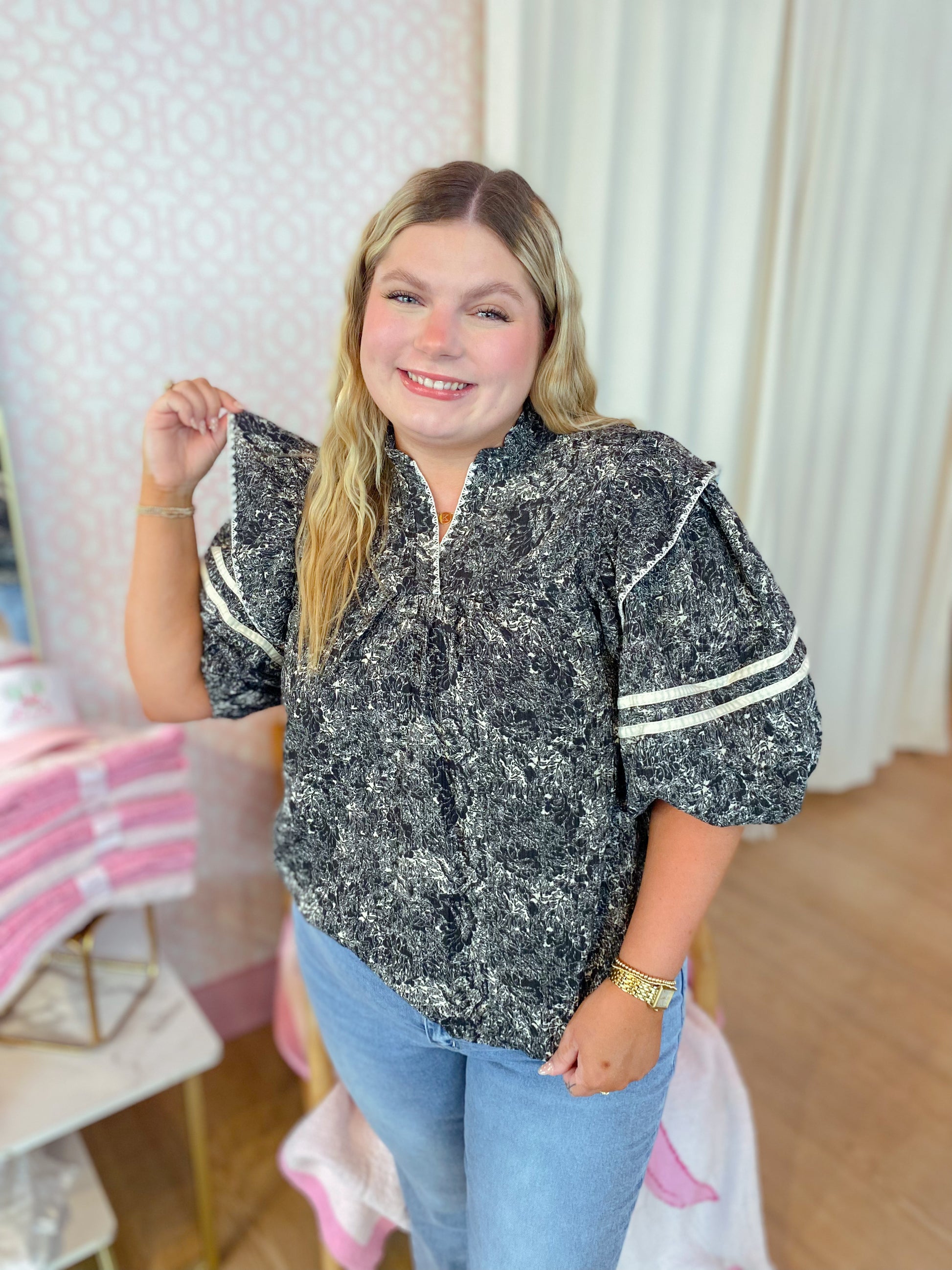 This black 3/4 sleeve woven top brings charm with its playful blanket stitch and binding details. Perfectly cropped to keep things short and sweet, it adds a fun, stylish twist to your everyday look while offering comfort and ease all day long!