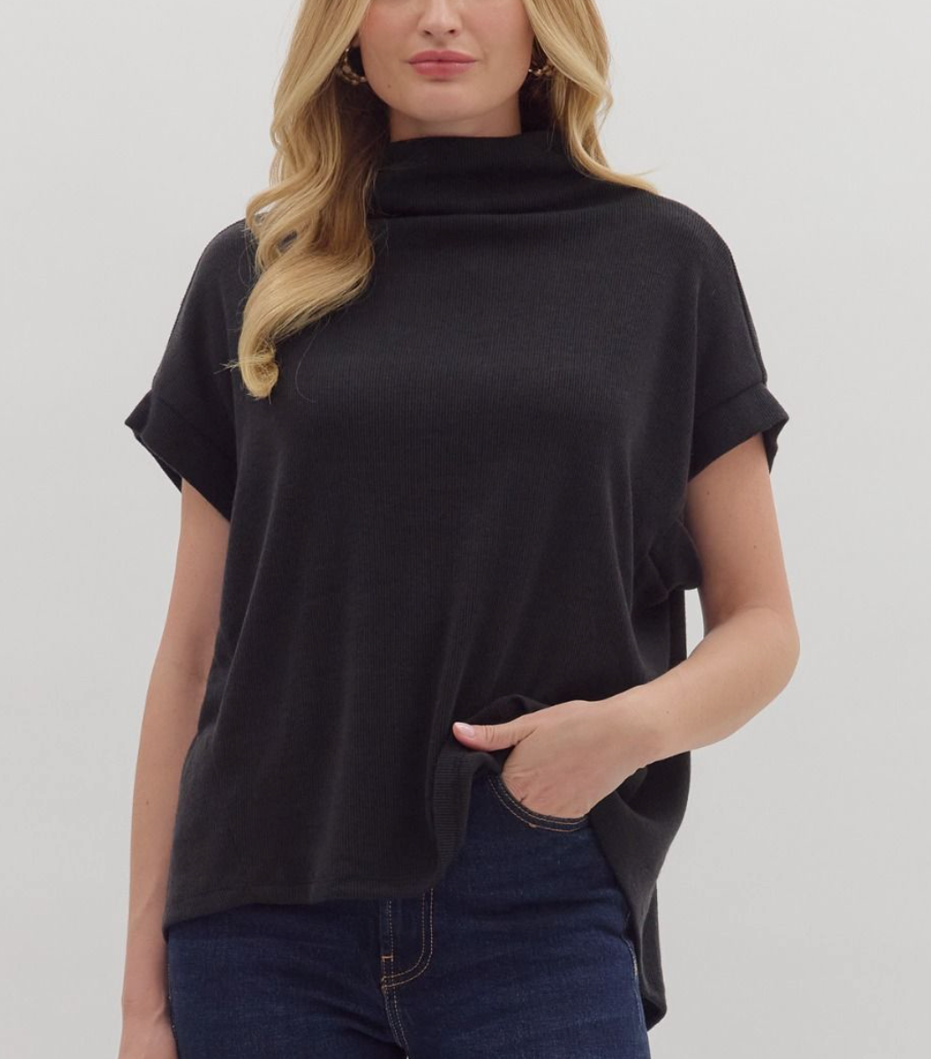 This black short sleeve mock neck top with rolled cuffs is light and comfy, perfect for any casual look!
