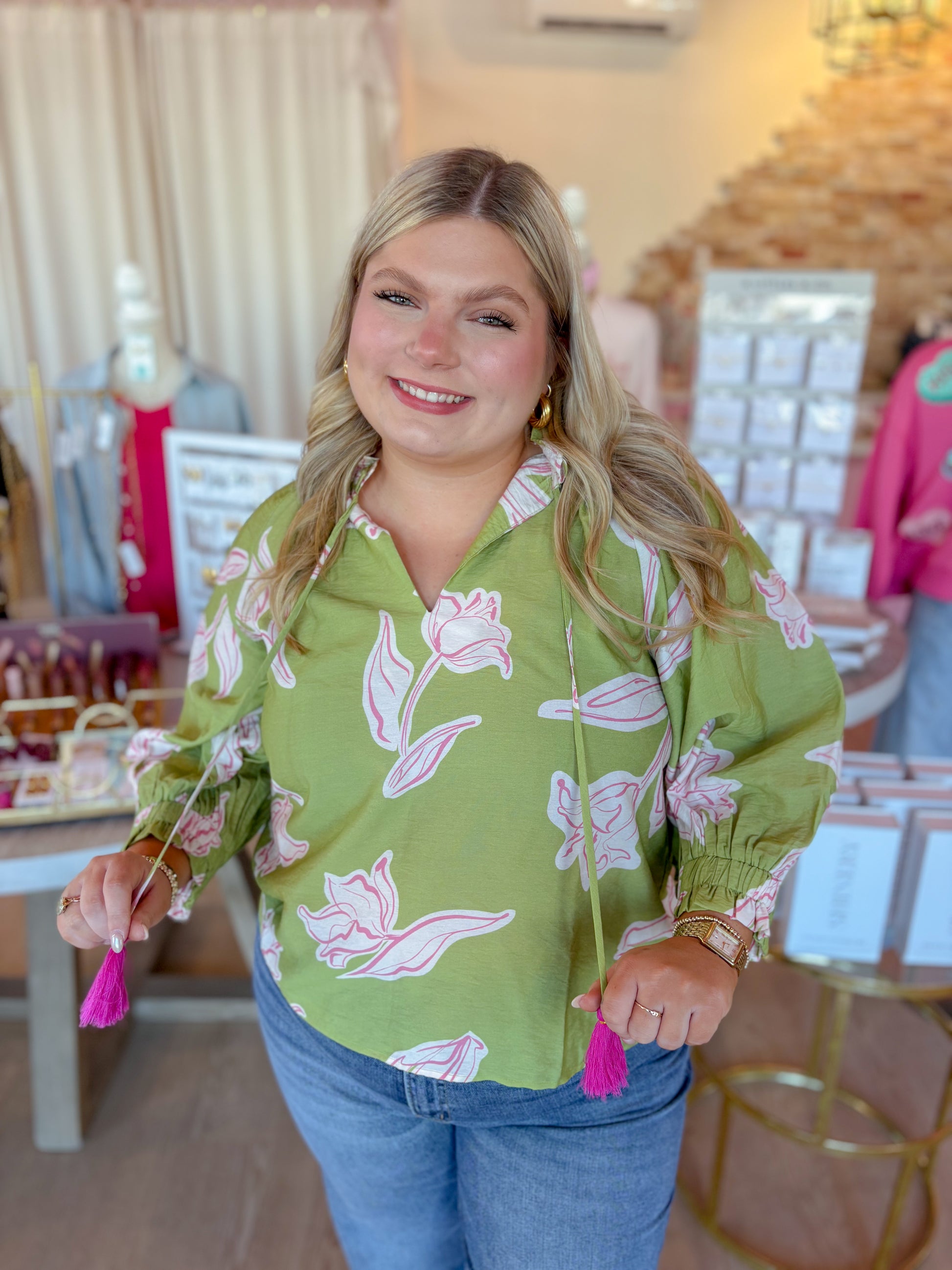 Bring a pop of color and charm to your wardrobe with this delightful green long sleeve top! Featuring a sweet pink and white floral pattern, it's designed to make you smile. The micro ruffle neckline adds a touch of feminine flair, while the tie neck with playful pink tassels gives you a fun way to customize your look. Perfect for layering or wearing solo, this piece brings that perfect blend of whimsy and style to any outfit!
