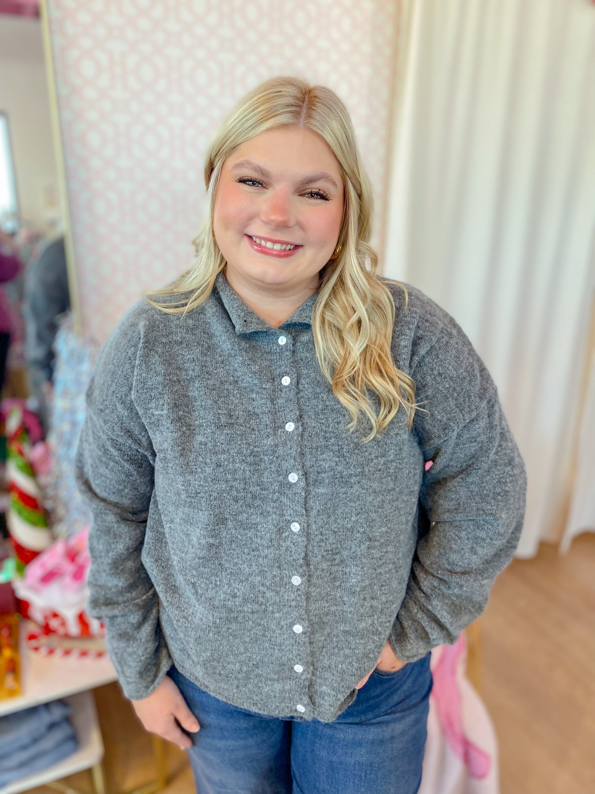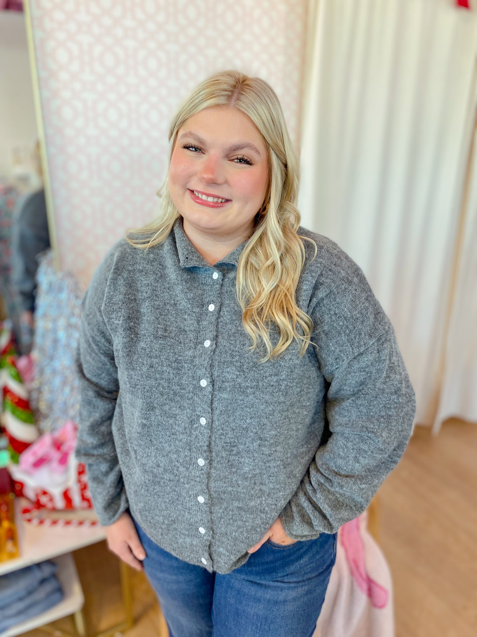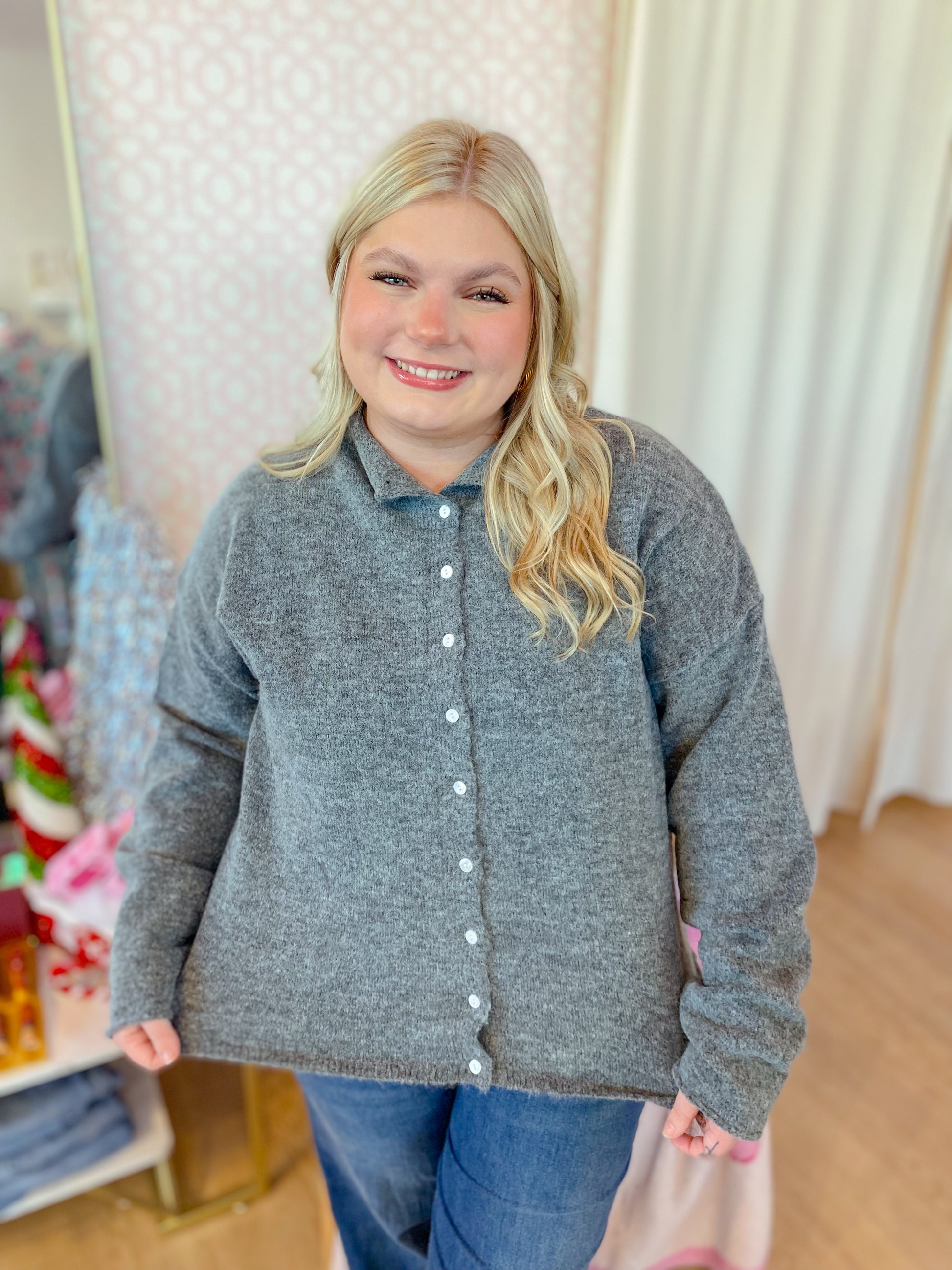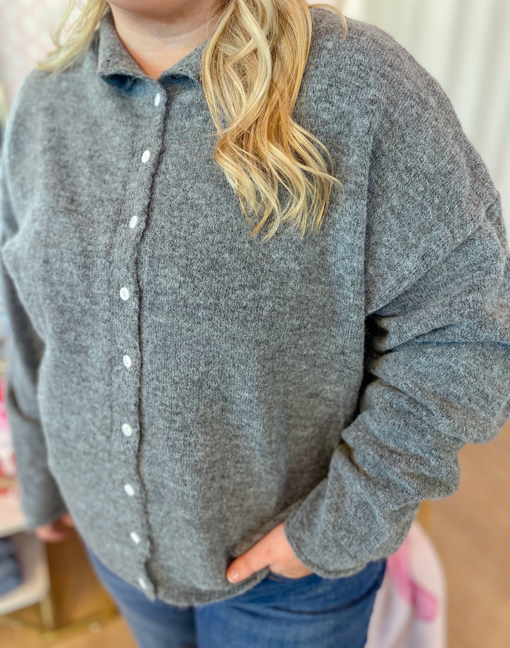 Step into cozy charm with the "Take The Drive" cardigan. This lightweight, two-tone sweater in charcoal grey features long sleeves and a button-down front, perfect for layering on crisp days. Its playful blend of style and comfort makes it easy to transition from relaxed mornings to casual evenings.