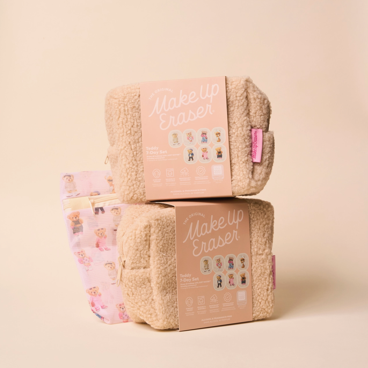 7 Cloths + Laundry Bag + (1) Toiletry Ballet Bag & PLUSH travel bag This LIMITED EDITION gift set launched just in time for the holidays. Our Teddy Bear designed sustainable MakeUp Eraser set comes with a plush makeup/toiletry bag to store all your essentials making is perfect as a stocking stuffer.