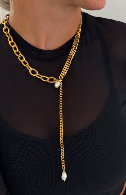 Discover the versatile beauty of The Jolinda Necklace. Crafted with high-quality 18k gold plated stainless steel, this piece can be adjusted from 16-18 inches for the perfect fit. Two contrasting chains are elegantly combined and finished with lustrous pearls, making this necklace a standout statement piece that can also be worn as a bracelet. Elevate any outfit with this must-have accessory.
