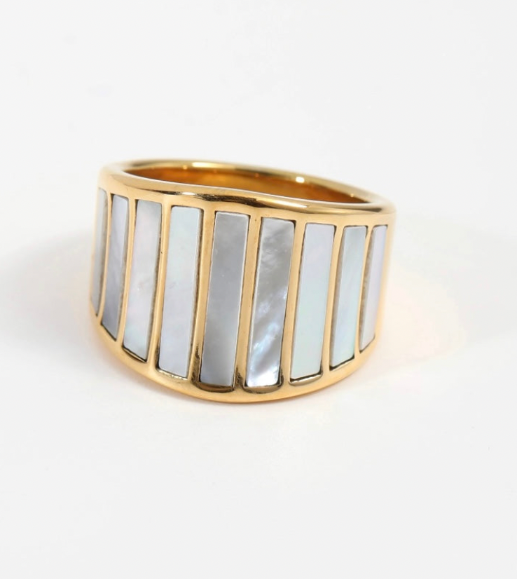 Introducing our Large Ocean Ring - a stunning gold ring featuring mother of pearl with a water resistant design. This unique and stylish ring is perfect for those who love to make a statement wherever they go, even in the ocean. Don't miss out on this one-of-a-kind piece!