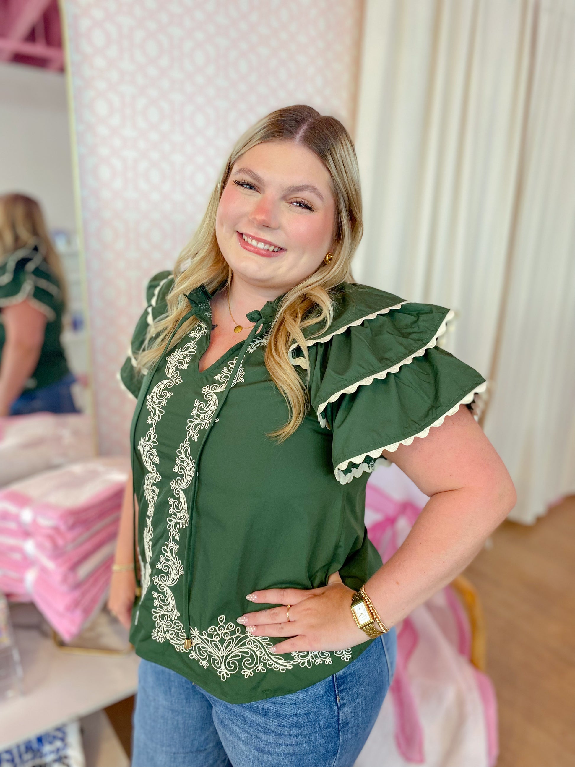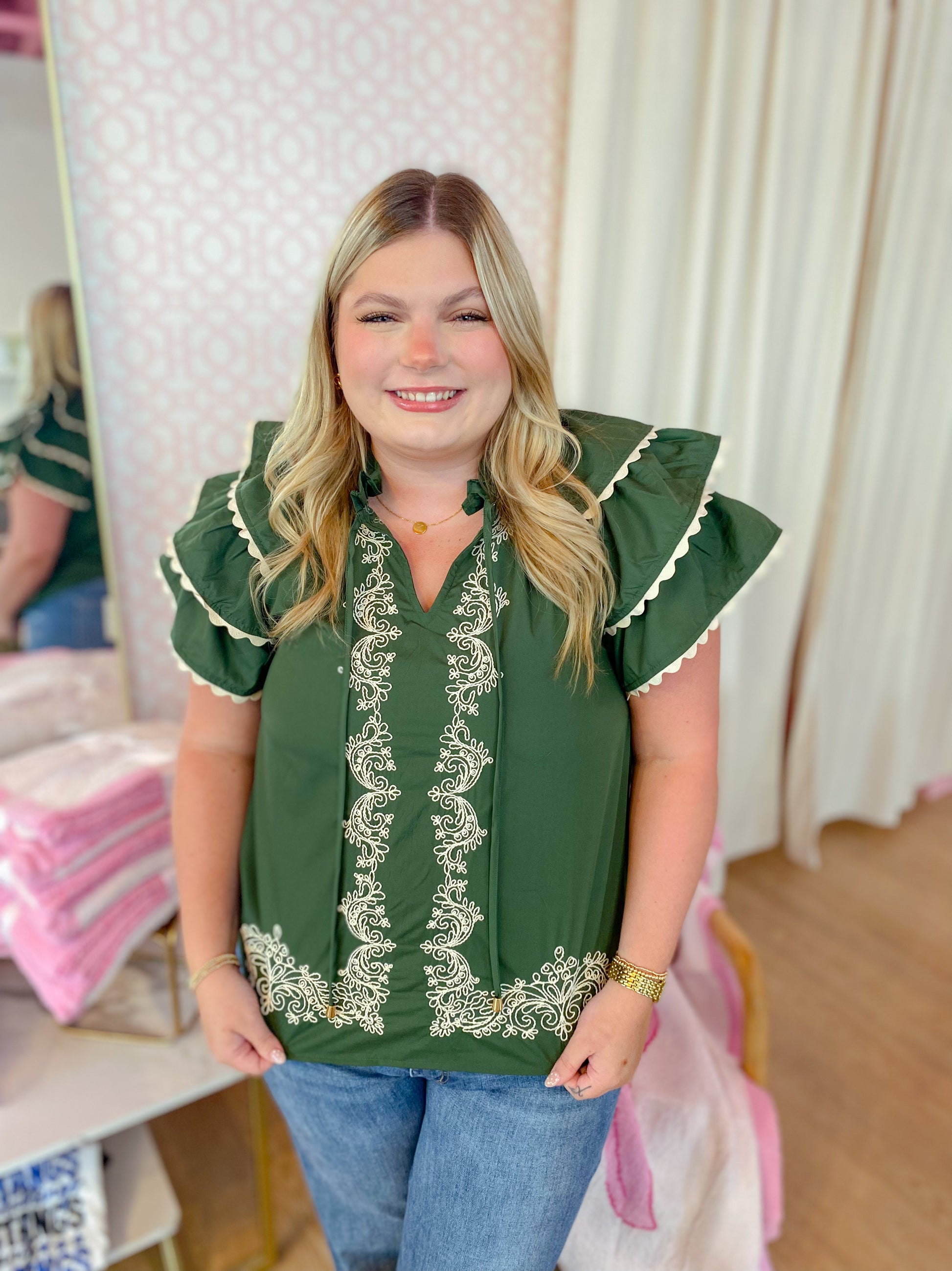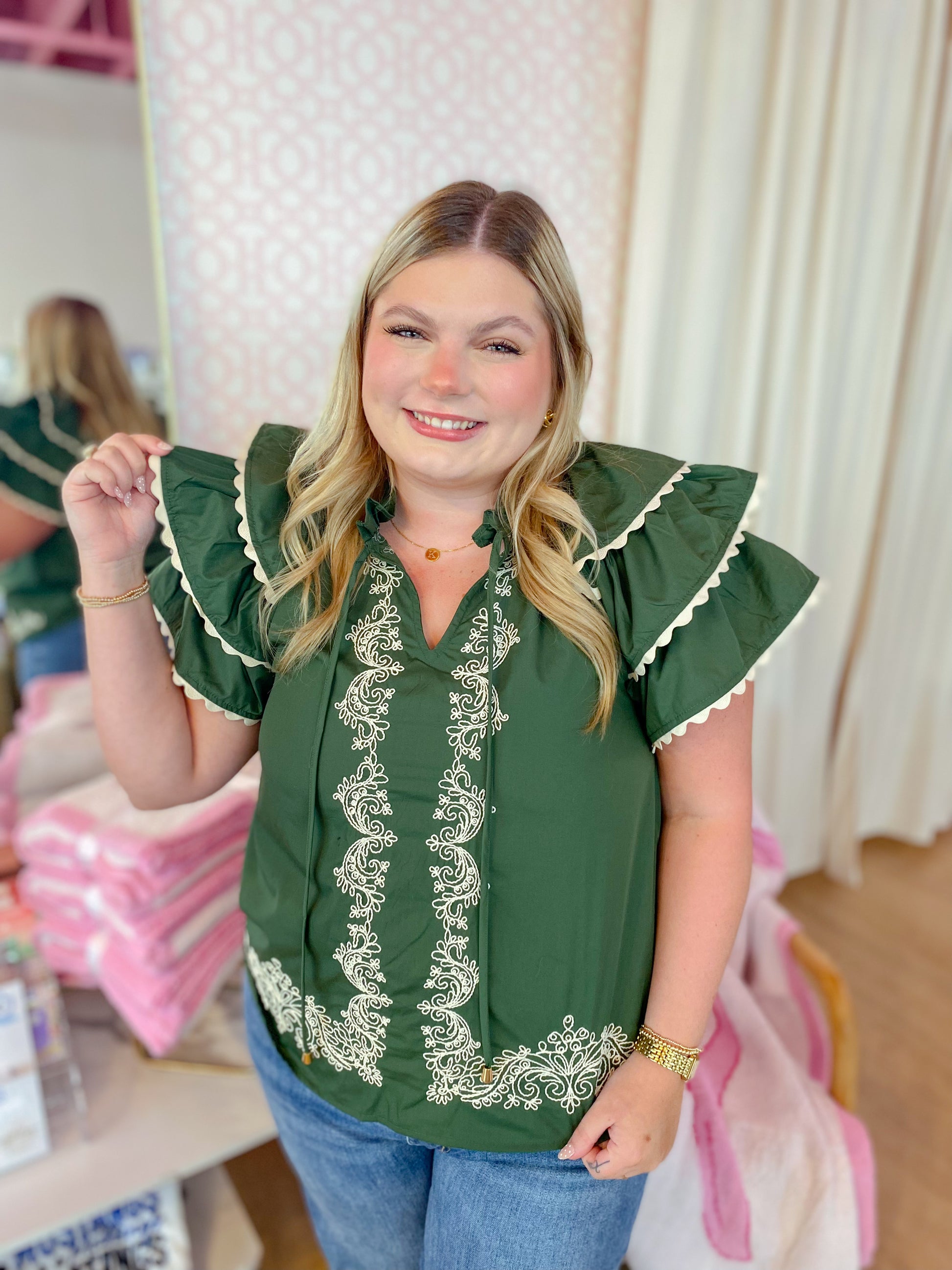 This olive flutter sleeve top features scalloped trim, layered sleeves, and embroidery. The self-tie V-neck adds a fun twist, and the lightweight, unlined design keeps it breezy and easygoing!