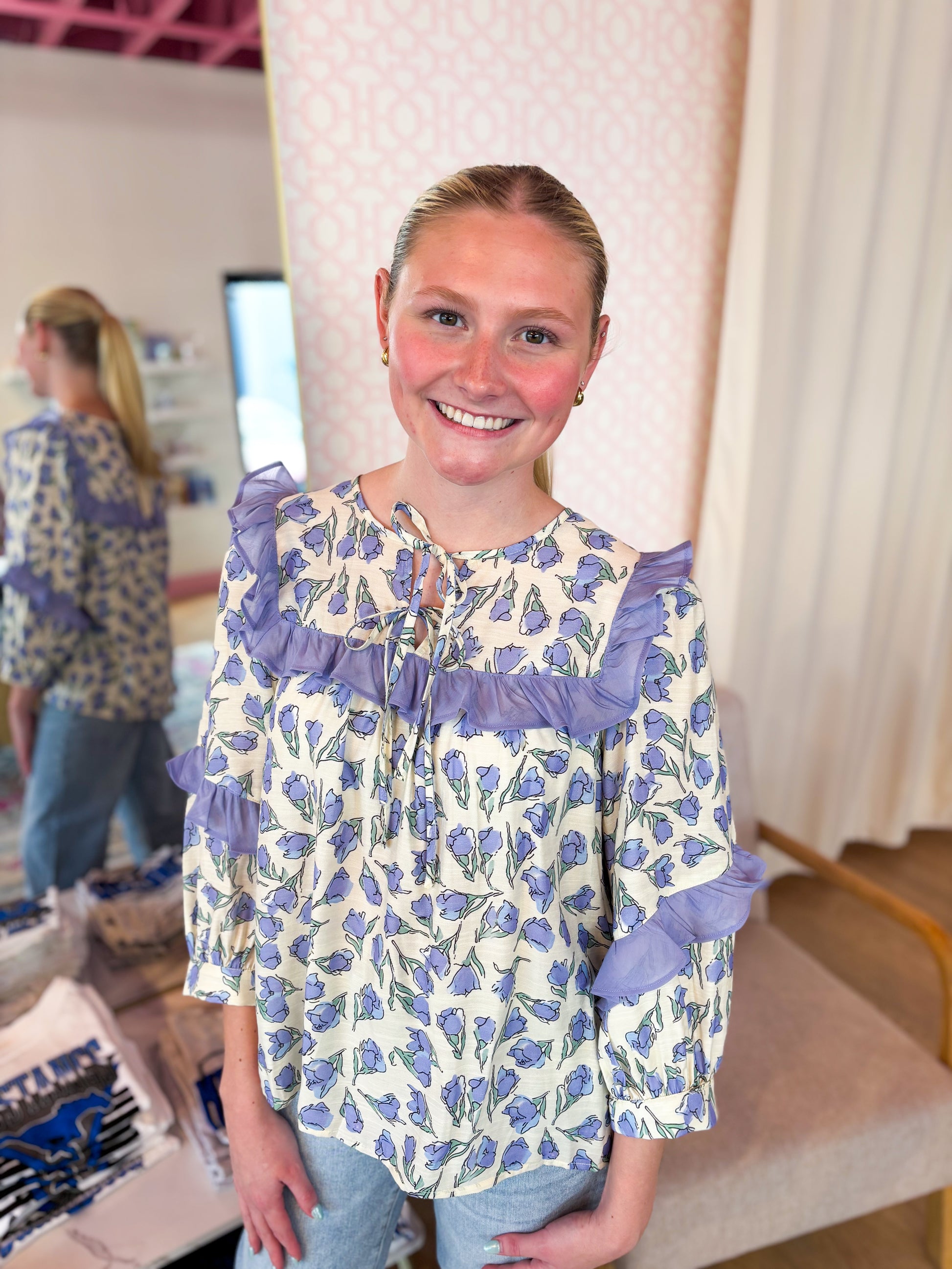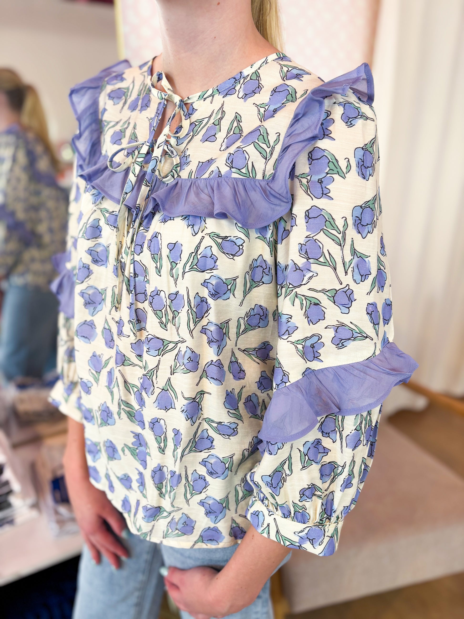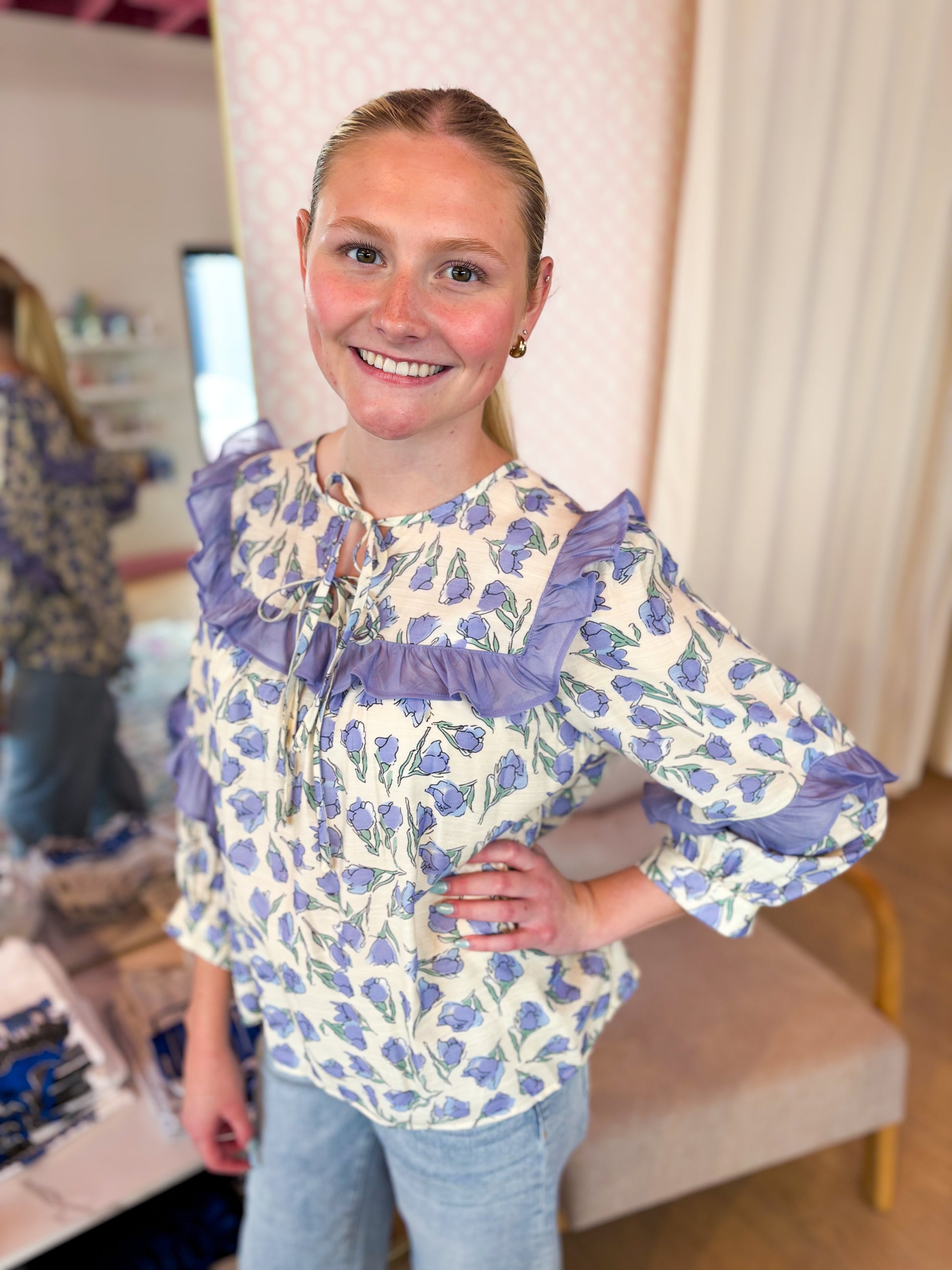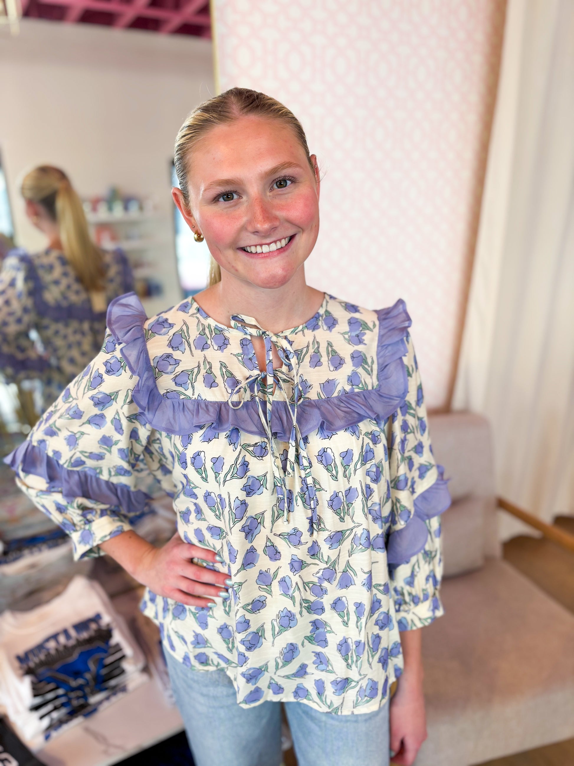 Slow down time with this periwinkle floral top! Elegant ¾ puff sleeves, yoke, and ruffle details. Playful front tie closure. Upgrade your wardrobe now!