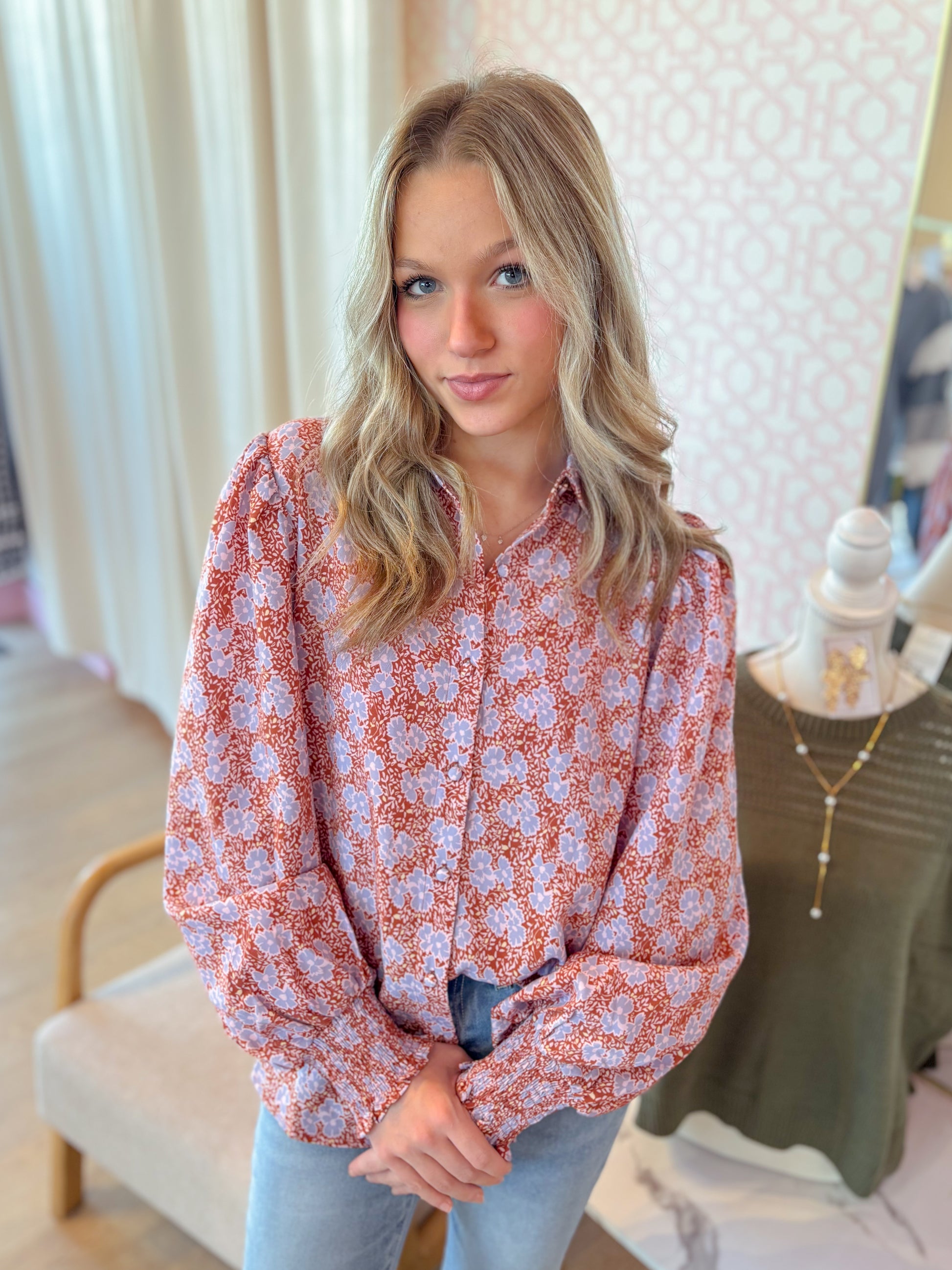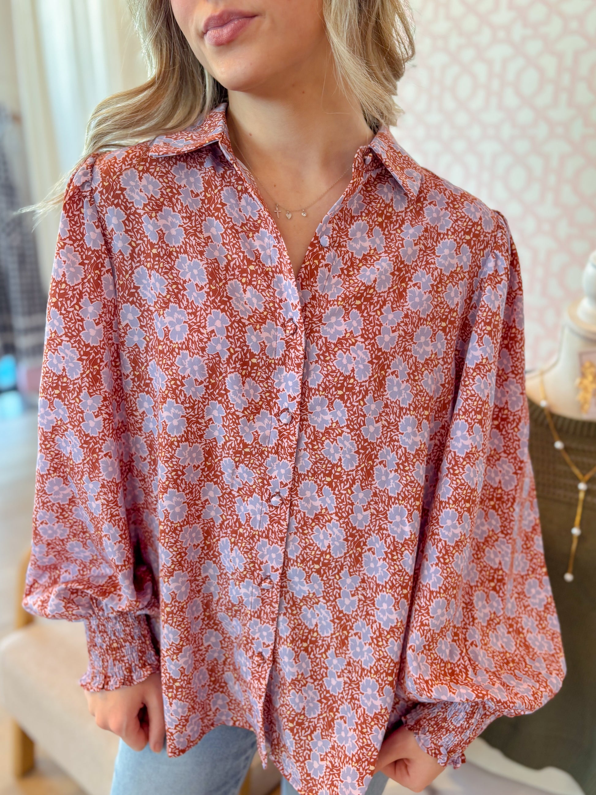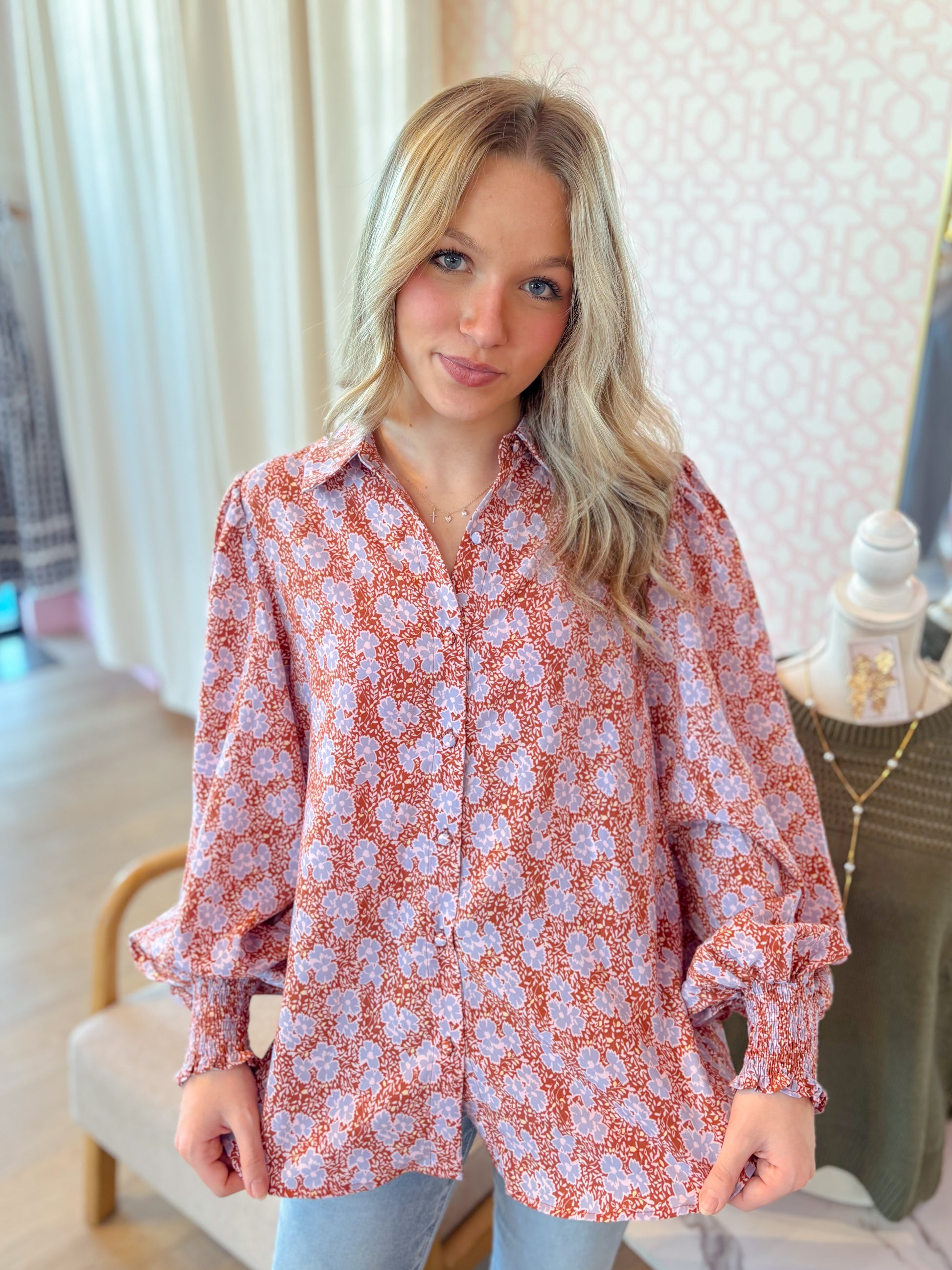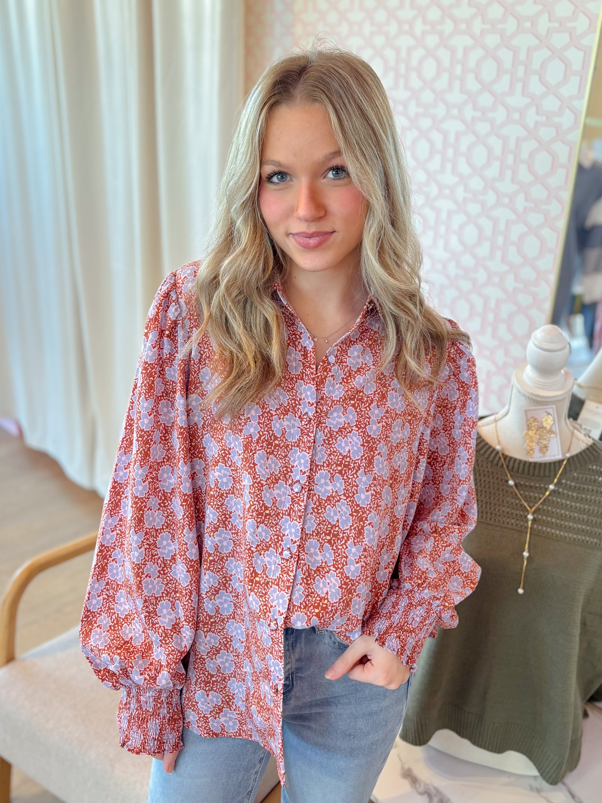 Bring a touch of fun to your wardrobe with this rust-colored floral shirt, featuring charming smocked wrist cuffs and a classic button-down design. The playful print pairs effortlessly with casual or dressy looks, while the smocked cuffs add a flirty, fitted finish to your sleeves. Perfect for days when you want to feel comfy and cute all at once!